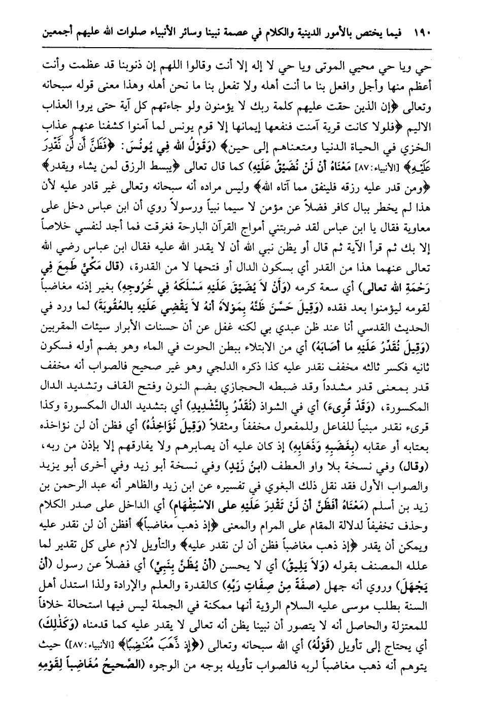 حي ويا حي محيي الموتى ويا حي لا إله إلا أنت وقالوا اللهم إن ذنوبنا قد عظمت وأنت أعظم منها وأجل وافعل بنا ما أنت أهله ولا تفعل بنا ما نحن أهله وهذا معنى قوله سبحانه وتعالى إِنَّ الَّذِينَ حَقَّتْ عَلَيْهِمْ كَلِمَتُ رَبِّكَ لا يُؤْمِنُونَ وَلَوْ جاءَتْهُمْ كُلُّ آيَةٍ حَتَّى يَرَوُا الْعَذابَ الْأَلِيمَ فَلَوْلا كانَتْ قَرْيَةٌ آمَنَتْ فَنَفَعَها إِيمانُها إِلَّا قَوْمَ يُونُسَ لَمَّا آمَنُوا كَشَفْنا عَنْهُمْ عَذابَ الْخِزْيِ فِي الْحَياةِ الدُّنْيا وَمَتَّعْناهُمْ إِلى حِينٍ (وَقَوْلُ اللَّهِ فِي يُونُسَ: فَظَنَّ أَنْ لَنْ نَقْدِرَ عَلَيْهِ [الْأَنْبِيَاءِ: 87] مَعْنَاهُ أَنْ لَنْ نُضَيِّقَ عليه) كما قال تعالى يَبْسُطُ الرِّزْقَ لِمَنْ يَشاءُ وَيَقْدِرُ وَمَنْ قُدِرَ عَلَيْهِ رِزْقُهُ فَلْيُنْفِقْ مِمَّا آتاهُ اللَّهُ وليس مراده أنه سبحانه وتعالى غير قادر عليه لأن هذا لم يخطر ببال كافر فضلا عن مؤمن لا سيما نبيا ورسولا روي أن ابن عباس دخل على معاوية فقال يا ابن عباس لقد ضربتني أمواج القرآن البارحة فغرقت فما أجد لنفسي خلاصا إلا بك ثم قرأ الآية ثم قال أو يظن نبي الله أن لا يقدر الله عليه فقال ابن عباس رضي الله تعالى عنهما هذا من القدر أي بسكون الدال أو فتحها لا من القدرة، (قال مكّيّ طمع في رحمة الله تعالى) أي سعة كرمه (وَأَنْ لَا يُضَيِّقَ عَلَيْهِ مَسْلَكَهُ فِي خُرُوجِهِ) بغير إذنه مغاضبا لقومه ليؤمنوا بعد فقده (وَقِيلَ حَسَّنَ ظَنَّهُ بِمَوْلَاهُ أَنَّهُ لَا يَقْضِي عليه بالعقوبة) لما ورد في الحديث القدسي أنا عند ظن عبدي بي لكنه غفل عن أن حسنات الأبرار سيئات المقربين (وقيل نقدّر عليه ما أصابه) أي من الابتلاء ببطن الحوت في الماء وهو بضم أوله فسكون ثانيه فكسر ثالثه مخفف نقدر عليه كذا ذكره الدلجي وهو غير صحيح فالصواب أنه مخفف قدر بمعنى قدر مشددا وقد ضبطه الحجازي بضم النون وفتح القاف وتشديد الدال المكسورة، (وقد قرىء) أي في الشواذ (نقدّر بالتّشديد) أي بتشديد الدال المكسورة وكذا قرىء نقدر مبنيا للفاعل وللمفعول مخففا ومثقلا (وقيل نؤاخذه) أي فظن أن لن نؤاخذه بعتابه أو عقابه (بغضبه وذهابه) إذ كان عليه أن يصابرهم ولا يفارقهم إلا بإذن من ربه، (وقال) وفي نسخة بلا واو العطف (ابن زيد) وفي نسخة أبو زيد وفي أخرى أبو يزيد والصواب الأول فقد نقل ذلك البغوي في تفسيره عن ابن زيد والظاهر أنه عبد الرحمن بن زيد بن أسلم (معناه أفظنّ أن لن تقدر عليه على الاستفهام) أي الداخل على صدر الكلام وحذف تخفيفا لدلالة المقام على المرام والمعنى إِذْ ذَهَبَ مُغاضِباً أفظن أن لن نقدر عليه ويمكن أن يقدر إِذْ ذَهَبَ مُغاضِباً فَظَنَّ أَنْ لَنْ نَقْدِرَ عَلَيْهِ والتأويل لازم على كل تقدير لما علله المصنف بقوله (ولا يليق) أي لا يحسن (أن يظنّ بنبيّ) أي فضلا عن رسول (أن يجهل) وروي أنه جهل (صفة من صفات ربّه) كالقدرة والعلم والإرادة ولذا استدل أهل السنة بطلب موسى عليه السلام الرؤية أنها ممكنة في الجملة ليس فيها استحالة خلافا للمعتزلة والحاصل أنه لا يتصور أن نبينا يظن أنه تعالى لا يقدر عليه كما قدمناه (وكذلك) أي يحتاج إلى تأويل (قوله) أي الله سبحانه وتعالى (إِذْ ذَهَبَ مُغاضِباً [الأنبياء: 87] ) حيث يتوهم أنه ذهب مغاضبا لربه فالصواب تأويله بوجه من الوجوه (الصّحيح مغاضبا لقومه