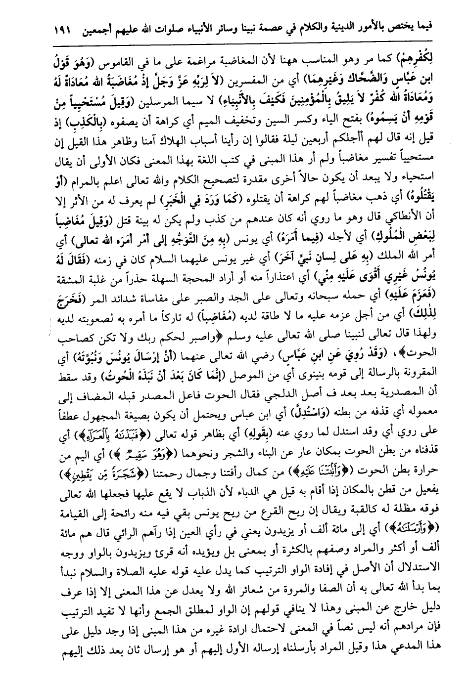 لكفرهم) كما مر وهو المناسب ههنا لأن المغاضبة مراغمة على ما في القاموس (وهو قول ابن عبّاس والضّحّاك وغيرهما) أي من المفسرين (لَا لِرَبِّهِ عَزَّ وَجَلَّ إِذْ مُغَاضِبَةُ اللَّهِ مُعَادَاةٌ لَهُ وَمُعَادَاةُ اللَّهِ كُفْرٌ لَا يَلِيقُ بالمؤمنين فكيف بالأنبياء) لا سيما المرسلين (وقيل مستحييا من قومه أن يسموه) بفتح الياء وكسر السين وتخفيف الميم أي كراهة أن يصفوه (بالكذب) إذ قيل إنه قال لهم أأجلكم أربعين ليلة فقالوا إن رأينا أسباب الهلاك آمنا وظاهر هذا القيل إن مستحييا تفسير مغاضبا ولم أر هذا المبنى في كتب اللغة بهذا المعنى فكان الأولى أن يقال استحياء ولا يبعد أن يكون حالا أخرى مقدرة لتصحيح الكلام والله تعالى اعلم بالمرام (أو يقتلوه) أي ذهب مغاضبا لهم كراهة أن يقتلوه (كما ورد في الخبر) لم يعرف له من الأثر إلا أن الأنطاكي قال وهو ما روي أنه كان عندهم من كذب ولم يكن له بينة قتل (وقيل مغاضبا لبعض الملوك) أي لأجله (فيما أمره) أي يونس (بِهِ مِنَ التَّوَجُّهِ إِلَى أَمْرٍ أَمَرَهُ اللَّهُ تعالى) أي أمر الله الملك (به على لسان نبيّ آخر) أي غير يونس عليهما السلام كان في زمنه (فَقَالَ لَهُ يُونُسُ غَيْرِي أَقْوَى عَلَيْهِ مِنِّي (أي اعتذارا منه أو أراد المحجة السهلة حذرا من غلبة المشقة (فعزم عليه) أي حمله سبحانه وتعالى على الجد والصبر على مقاساة شدائد المر (فخرج لذلك) أي من أجل عزمه عليه ما لا طاقة لديه (مغاضبا) له تاركا ما أمره به لصعوبته لديه ولهذا قال تعالى لنبينا صلى الله تعالى عليه وسلم فَاصْبِرْ لِحُكْمِ رَبِّكَ وَلا تَكُنْ كَصاحِبِ الْحُوتِ، (وقد روي عن ابن عبّاس) رضي الله تعالى عنهما (أنّ إرسال يونس ونبوّته) أي المقرونة بالرسالة إلى قومه بنينوى أي من الموصل (إنّما كان بعد أن نبذه الحوت) وقد سقط أن المصدرية بعد بعد ف أصل الدلجي فقال الحوت فاعل المصدر قبله المضاف إلى معموله أي قذفه من بطنه (واستدلّ) أي ابن عباس ويحتمل أن يكون بصيغة المجهول عطفا على روي أي وقد استدل لما روي عنه (بقوله) أي بظاهر قوله تعالى (فَنَبَذْناهُ بِالْعَراءِ) أي قذفناه من بطن الحوت بمكان عار عن البناء والشجر ونحوهما (وَهُوَ سَقِيمٌ) أي اليم من حرارة بطن الحوت (وَأَنْبَتْنا عَلَيْهِ) من كمال رأفتنا وجمال رحمتنا (شَجَرَةً مِنْ يَقْطِينٍ) يفعيل من قطن بالمكان إذا أقام به قيل هي الدباء لأن الذباب لا يقع عليها فجعلها الله تعالى فوقه مظلة له كالقبة ويقال إن ريح القرع من ريح يونس بقي فيه منه رائحة إلى القيامة (وَأَرْسَلْناهُ) أي إلى مائة ألف أو يزيدون يعني في رأي العين إذا رآهم الرائي قال هم مائة ألف أو أكثر والمراد وصفهم بالكثرة أو بمعنى بل ويؤيده أنه قرئ ويزيدون بالواو ووجه الاستدلال أن الأصل في إفادة الواو الترتيب كما يدل عليه قوله عليه الصلاة والسلام نبدأ بما بدأ الله تعالى به أن الصفا والمروة من شعائر الله ولا يعدل عن هذا المعنى إلا إذا عرف دليل خارج عن المبنى وهذا لا ينافي قولهم إن الواو لمطلق الجمع وأنها لا تفيد الترتيب فإن مرادهم أنه ليس نصا في المعنى لاحتمال ارادة غيره من هذا المبنى إذا وجد دليل على هذا المدعي هذا وقيل المراد بأرسلناه إرساله الأول إليهم أو هو إرسال ثان بعد ذلك إليهم