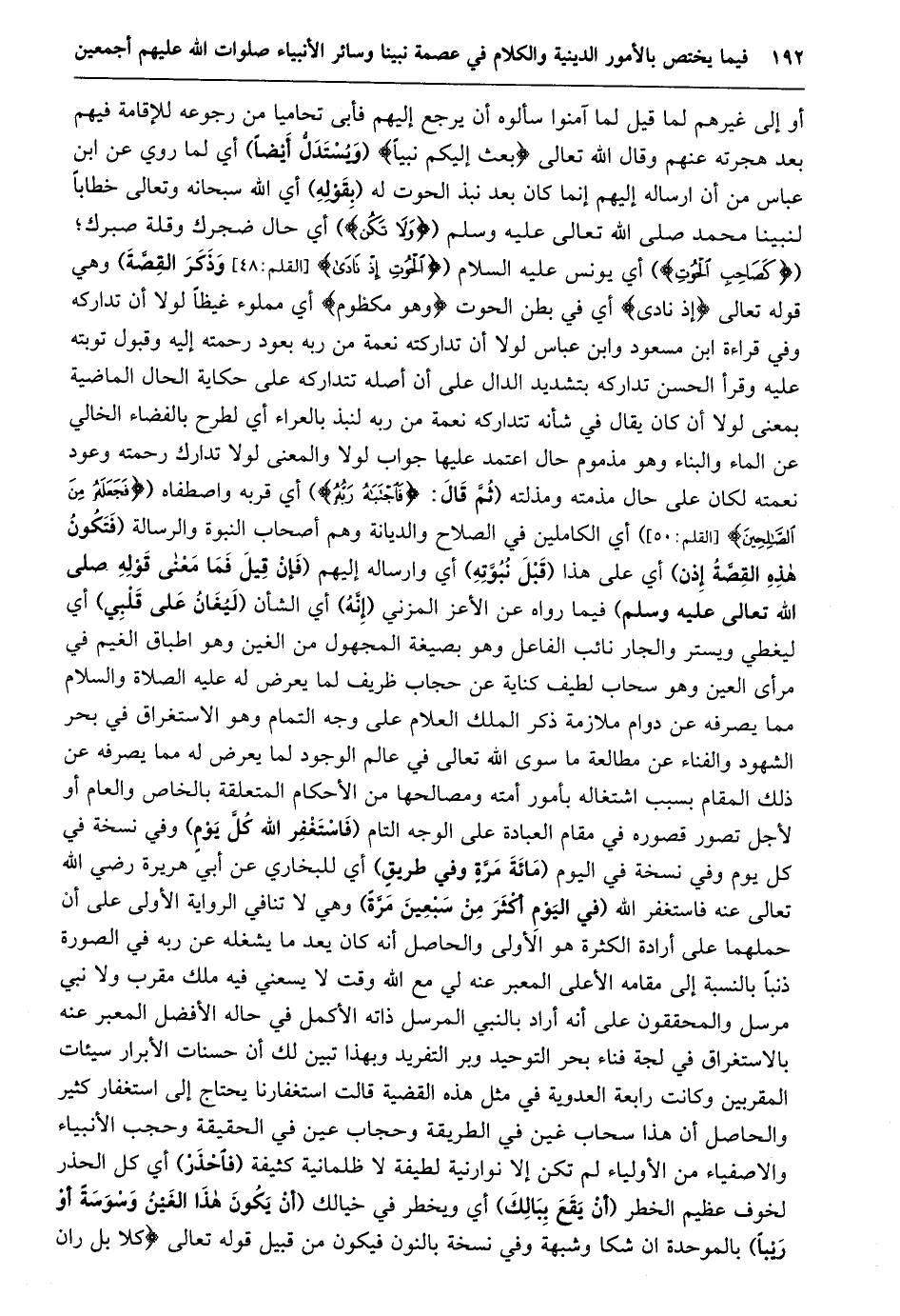 أو إلى غيرهم لما قيل لما آمنوا سألوه أن يرجع إليهم فأبى تحاميا من رجوعه للإقامة فيهم بعد هجرته عنهم وقال الله تعالى (بعث إليكم نبيا) (ويستدلّ أيضا) أي لما روي عن ابن عباس من أن ارساله إليهم إنما كان بعد نبذ الحوت له (بقوله) أي الله سبحانه وتعالى خطابا لنبينا محمد صلى الله تعالى عليه وسلم (وَلا تَكُنْ) أي حال ضجرك وقلة صبرك؛ (كَصاحِبِ الْحُوتِ) أي يونس عليه السلام (الْحُوتِ إِذْ نادى [القلم: 48] وذكر القصّة) وهي قوله تعالى إِذْ نادى أي في بطن الحوت وَهُوَ مَكْظُومٌ أي مملوء غيظا لولا أن تداركه وفي قراءة ابن مسعود وابن عباس لولا أن تداركته نعمة من ربه بعود رحمته إليه وقبول توبته عليه وقرأ الحسن تداركه بتشديد الدال على أن أصله تتداركه على حكاية الحال الماضية بمعنى لولا أن كان يقال في شأنه تتداركه نعمة من ربه لنبذ بالعراء أي لطرح بالفضاء الخالي عن الماء والبناء وهو مذموم حال اعتمد عليها جواب لولا والمعنى لولا تدارك رحمته وعود نعمته لكان على حال مذمته ومذلته (ثمّ قال: فَاجْتَباهُ رَبُّهُ أي قربه واصطفاه (فَجَعَلَهُ مِنَ الصَّالِحِينَ [القلم: 50] ) أي الكاملين في الصلاح والديانة وهم أصحاب النبوة والرسالة (فتكون هذه القصّة إذن) أي على هذا (قبل نبوّته) أي وارساله إليهم (فَإِنْ قِيلَ فَمَا مَعْنَى قَوْلِهِ صَلَّى اللَّهُ تعالى عليه وسلم) فيما رواه عن الأعز المزني (إنّه) أي الشأن (ليغان على قلبي) أي ليغطي ويستر والجار نائب الفاعل وهو بصيغة المجهول من الغين وهو اطباق الغيم في مرأى العين وهو سحاب لطيف كناية عن حجاب ظريف لما يعرض له عليه الصلاة والسلام مما يصرفه عن دوام ملازمة ذكر الملك العلام على وجه التمام وهو الاستغراق في بحر الشهود والفناء عن مطالعة ما سوى الله تعالى في عالم الوجود لما يعرض له مما يصرفه عن ذلك المقام بسبب اشتغاله بأمور أمته ومصالحها من الأحكام المتعلقة بالخاص والعام أو لأجل تصور قصوره في مقام العبادة على الوجه التام (فاستغفر الله كلّ يوم) وفي نسخة في كل يوم وفي نسخة في اليوم (مائة مرّة وفي طريق) أي للبخاري عن أبي هريرة رضي الله تعالى عنه فاستغفر الله (في اليوم أكثر من سبعين مرّة) وهي لا تنافي الرواية الأولى على أن حملهما على أرادة الكثرة هو الأولى والحاصل أنه كان يعد ما يشغله عن ربه في الصورة ذنبا بالنسبة إلى مقامه الأعلى المعبر عنه لي مع الله وقت لا يسعني فيه ملك مقرب ولا نبي مرسل والمحققون على أنه أراد بالنبي المرسل ذاته الأكمل في حاله الأفضل المعبر عنه بالاستغراق في لجة فناء بحر التوحيد وبر التفريد وبهذا تبين لك أن حسنات الأبرار سيئات المقربين وكانت رابعة العدوية في مثل هذه القضية قالت استغفارنا يحتاج إلى استغفار كثير والحاصل أن هذا سحاب غين في الطريقة وحجاب عين في الحقيقة وحجب الأنبياء والاصفياء من الأولياء لم تكن إلا نوارنية لطيفة لا ظلمانية كثيفة (فاحذر) أي كل الحذر لخوف عظيم الخطر (أن يقع ببالك) أي ويخطر في خيالك (أَنْ يَكُونَ هَذَا الْغَيْنُ وَسْوَسَةً أَوْ رَيْبًا) بالموحدة ان شكا وشبهة وفي نسخة بالنون فيكون من قبيل قوله تعالى كَلَّا بَلْ رانَ