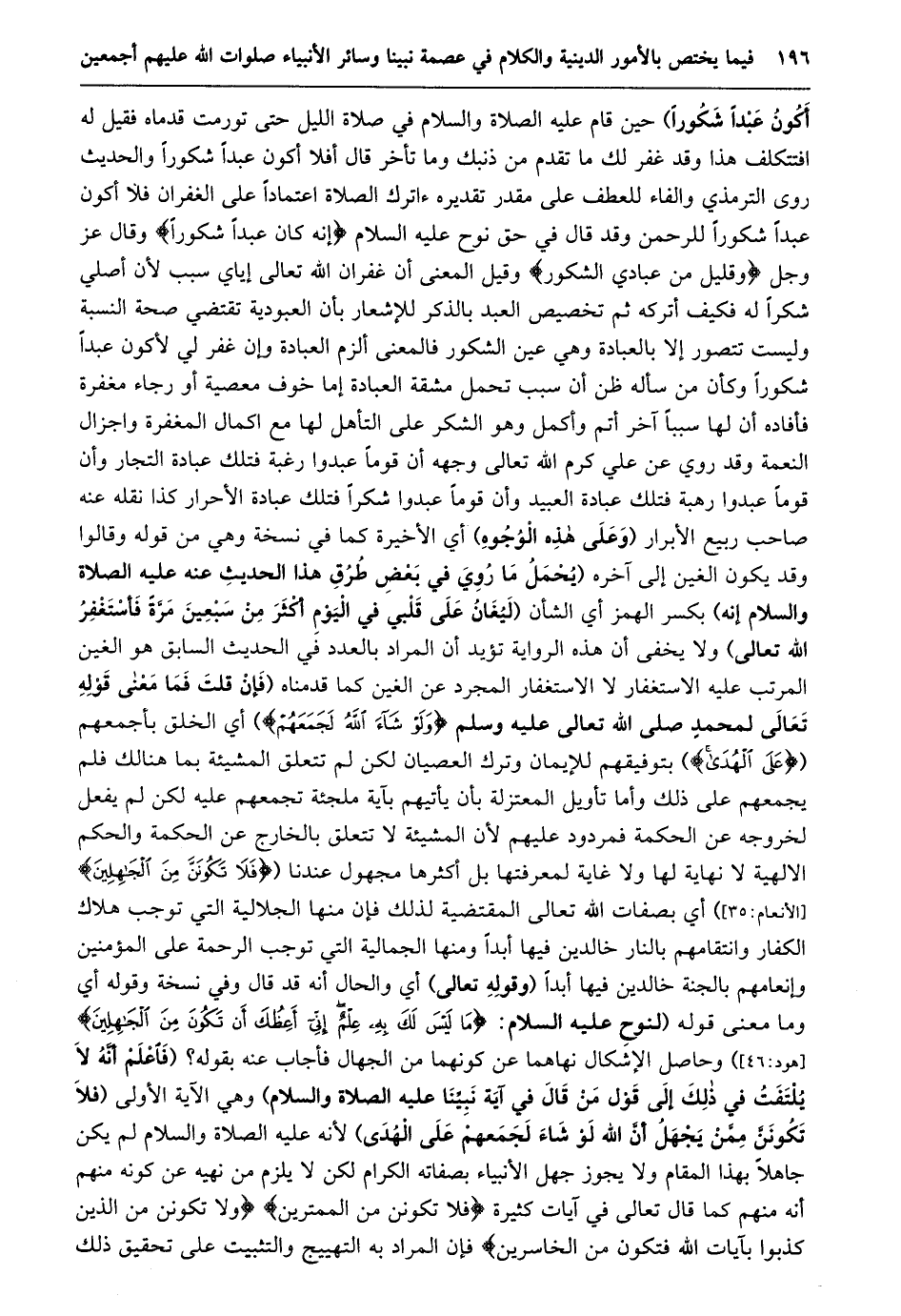 أكون عبدا شكورا) حين قام عليه الصلاة والسلام في صلاة الليل حتى تورمت قدماه فقيل له افتتكلف هَذَا وَقَدْ غُفِرَ لَكَ مَا تَقَدَّمَ مِنْ ذَنْبِكَ وَمَا تَأَخَّرَ قَالَ أَفَلَا أَكُونُ عَبْدًا شكورا والحديث روى الترمذي والفاء للعطف على مقدر تقديره ءاترك الصلاة اعتمادا على الغفران فلا أكون عبدا شكورا للرحمن وقد قال في حق نوح عليه السلام إِنَّهُ كانَ عَبْداً شَكُوراً وقال عز وجل وَقَلِيلٌ مِنْ عِبادِيَ الشَّكُورُ وقيل المعنى أن غفران الله تعالى إياي سبب لأن أصلي شكرا له فكيف أتركه ثم تخصيص العبد بالذكر للإشعار بأن العبودية تقتضي صحة النسبة وليست تتصور إلا بالعبادة وهي عين الشكور فالمعنى ألزم العبادة وإن غفر لي لأكون عبدا شكورا وكأن من سأله ظن أن سبب تحمل مشقة العبادة إما خوف معصية أو رجاء مغفرة فأفاده أن لها سببا آخر أتم وأكمل وهو الشكر على التأهل لها مع اكمال المغفرة واجزال النعمة وقد روي عن علي كرم الله تعالى وجهه أن قوما عبدوا رغبة فتلك عبادة التجار وأن قوما عبدوا رهبة فتلك عبادة العبيد وأن قوما عبدوا شكرا فتلك عبادة الأحرار كذا نقله عنه صاحب ربيع الأبرار (وعلى هذه الوجوه) أي الأخيرة كما في نسخة وهي من قوله وقالوا وقد يكون الغين إلى آخره (يُحْمَلُ مَا رُوِيَ فِي بَعْضِ طُرُقِ هَذَا الحديث عنه عليه الصلاة والسلام إنه) بكسر الهمز أي الشأن (لَيُغَانُ عَلَى قَلْبِي فِي الْيَوْمِ أَكْثَرَ مِنْ سبعين مرّة فأستغفر الله تعالى) ولا يخفى أن هذه الرواية تؤيد أن المراد بالعدد في الحديث السابق هو الغين المرتب عليه الاستغفار لا الاستغفار المجرد عن الغين كما قدمناه (فَإِنْ قُلْتَ فَمَا مَعْنَى قَوْلِهِ تَعَالَى لِمُحَمَّدٍ صلى الله تعالى عليه وسلم وَلَوْ شاءَ اللَّهُ لَجَمَعَهُمْ أي الخلق بأجمعهم (عَلَى الْهُدى) بتوفيقهم للإيمان وترك العصيان لكن لم تتعلق المشيئة بما هنالك فلم يجمعهم على ذلك وأما تأويل المعتزلة بأن يأتيهم بآية ملجئة تجمعهم عليه لكن لم يفعل لخروجه عن الحكمة فمردود عليهم لأن المشيئة لا تتعلق بالخارج عن الحكمة والحكم الالهية لا نهاية لها ولا غاية لمعرفتها بل أكثرها مجهول عندنا (فَلا تَكُونَنَّ مِنَ الْجاهِلِينَ [الأنعام: 35] ) أي بصفات الله تعالى المقتضية لذلك فإن منها الجلالية التي توجب هلاك الكفار وانتقامهم بالنار خالدين فيها أبدا ومنها الجمالية التي توجب الرحمة على المؤمنين وإنعامهم بالجنة خالدين فيها أبدا (وقوله تعالى) أي والحال أنه قد قال وفي نسخة وقوله أي وما معنى قوله (لِنُوحٍ عَلَيْهِ السَّلَامُ: مَا لَيْسَ لَكَ بِهِ عِلْمٌ إِنِّي أَعِظُكَ أَنْ تَكُونَ مِنَ الْجاهِلِينَ [هود: 46] ) وحاصل الإشكال نهاهما عن كونهما من الجهال فأجاب عنه بقوله؟ (فَاعْلَمْ أَنَّهُ لَا يُلْتَفَتُ فِي ذَلِكَ إِلَى قول من قال في آية نبيّنا عليه الصلاة والسلام) وهي الآية الأولى (فلا تَكُونُنَّ مِمَّنْ يَجْهَلُ أَنَّ اللَّهَ لَوْ شَاءَ لجمعهم على الهدى) لأنه عليه الصلاة والسلام لم يكن جاهلا بهذا المقام ولا يجوز جهل الأنبياء بصفاته الكرام لكن لا يلزم من نهيه عن كونه منهم أنه منهم كما قال تعالى في آيات كثيرة فَلا تَكُونَنَّ مِنَ الْمُمْتَرِينَ وَلا تَكُونَنَّ مِنَ الَّذِينَ كَذَّبُوا بِآياتِ اللَّهِ فَتَكُونَ مِنَ الْخاسِرِينَ فإن المراد به التهييج والتثبيت على تحقيق ذلك