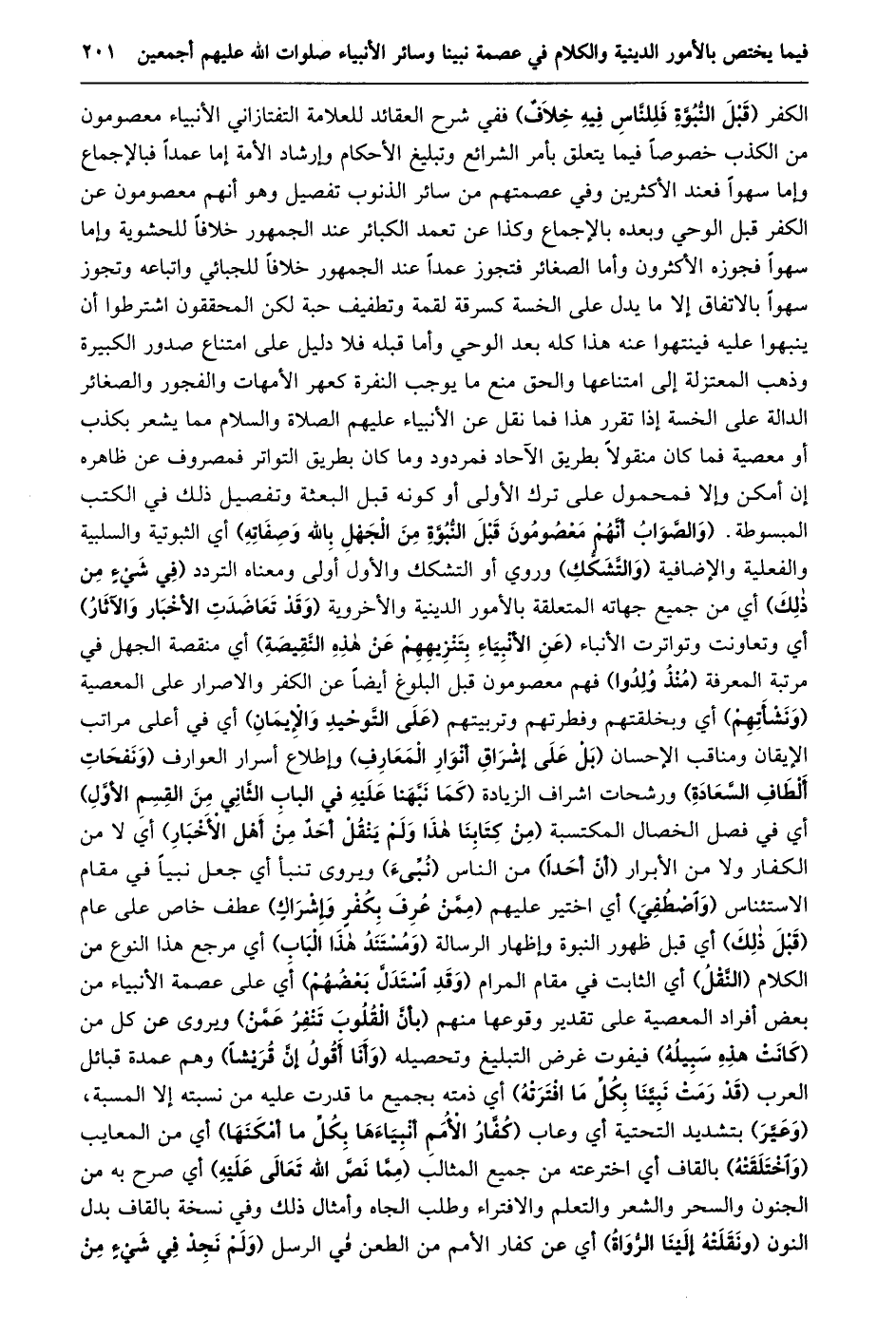 الكفر (قبل النّبوّة فللنّاس فيه خلاف) ففي شرح العقائد للعلامة التفتازاني الأنبياء معصومون من الكذب خصوصا فيما يتعلق بأمر الشرائع وتبليغ الأحكام وإرشاد الأمة إما عمدا فبالإجماع وإما سهوا فعند الأكثرين وفي عصمتهم من سائر الذنوب تفصيل وهو أنهم معصومون عن الكفر قبل الوحي وبعده بالإجماع وكذا عن تعمد الكبائر عند الجمهور خلافا للحشوية وإما سهوا فجوزه الأكثرون وأما الصغائر فتجوز عمدا عند الجمهور خلافا للجبائي واتباعه وتجوز سهوا بالاتفاق إلا ما يدل على الخسة كسرقة لقمة وتطفيف حبة لكن المحققون اشترطوا أن ينبهوا عليه فينتهوا عنه هذا كله بعد الوحي وأما قبله فلا دليل على امتناع صدور الكبيرة وذهب المعتزلة إلى امتناعها والحق منع ما يوجب النفرة كعهر الأمهات والفجور والصغائر الدالة على الخسة إذا تقرر هذا فما نقل عن الأنبياء عليهم الصلاة والسلام مما يشعر بكذب أو معصية فما كان منقولا بطريق الآحاد فمردود وما كان بطريق التواتر فمصروف عن ظاهره إن أمكن وإلا فمحمول على ترك الأولى أو كونه قبل البعثة وتفصيل ذلك في الكتب المبسوطة. (وَالصَّوَابُ أَنَّهُمْ مَعْصُومُونَ قَبْلَ النُّبُوَّةِ مِنَ الْجَهْلِ بالله وصفاته) أي الثبوتية والسلبية والفعلية والإضافية (والتّشكّك) وروي أو التشكك والأول أولى ومعناه التردد (في شيء من ذلك) أي من جميع جهاته المتعلقة بالأمور الدينية والأخروية (وقد تعاضدت الأخبار والآثار) أي وتعاونت وتواترت الأنباء (عن الأنبياء بتنزيههم عن هذه النّقيصة) أي منقصة الجهل في مرتبة المعرفة (منذ ولدوا) فهم معصومون قبل البلوغ أيضا عن الكفر والاصرار على المعصية (ونشأتهم) أي وبخلقتهم وفطرتهم وتربيتهم (على التّوحيد والإيمان) أي في أعلى مراتب الإيقان ومناقب الإحسان (بل على إشراق أنوار المعارف) وإطلاع أسرار العوارف (ونفحات ألطاف السّعادة) ورشحات اشراف الزيادة (كَمَا نَبَّهْنَا عَلَيْهِ فِي الْبَابِ الثَّانِي مِنَ القسم الأوّل) أي في فصل الخصال المكتسبة (مِنْ كِتَابِنَا هَذَا وَلَمْ يَنْقُلْ أَحَدٌ مِنْ أهل الأخبار) أي لا من الكفار ولا من الأبرار (أنّ أحدا) من الناس (نبّىء) ويروى تنبأ أي جعل نبيا في مقام الاستئناس (واصطفي) أي اختير عليهم (ممّن عرف بكفر وإشراك) عطف خاص على عام (قبل ذلك) أي قبل ظهور النبوة وإظهار الرسالة (ومستند هذا الباب) أي مرجع هذا النوع من الكلام (النّقل) أي الثابت في مقام المرام (وقد استدلّ بعضهم) أي على عصمة الأنبياء من بعض أفراد المعصية على تقدير وقوعها منهم (بأنّ القلوب تنفر عمّن) ويروى عن كل من (كانت هذه سبيله) فيفوت غرض التبليغ وتحصيله (وأنا أقول إنّ قريشا) وهم عمدة قبائل العرب (قد رمت نبيّنا بكلّ ما افترته) أي ذمته بجميع ما قدرت عليه من نسبته إلا المسبة، (وعيّر) بتشديد التحتية أي وعاب (كفّار الأمم أنبياءها بكلّ ما أمكنها) أي من المعايب (واختلفته) بالقاف أي اخترعته من جميع المثالب (ممّا نصّ الله تعالى عليه) أي صرح به من الجنون والسحر والشعر والتعلم والافتراء وطلب الجاه وأمثال ذلك وفي نسخة بالقاف بدل النون (ونقلته إلينا الرّواة) أي عن كفار الأمم من الطعن في الرسل (ولم نجد في شيء من