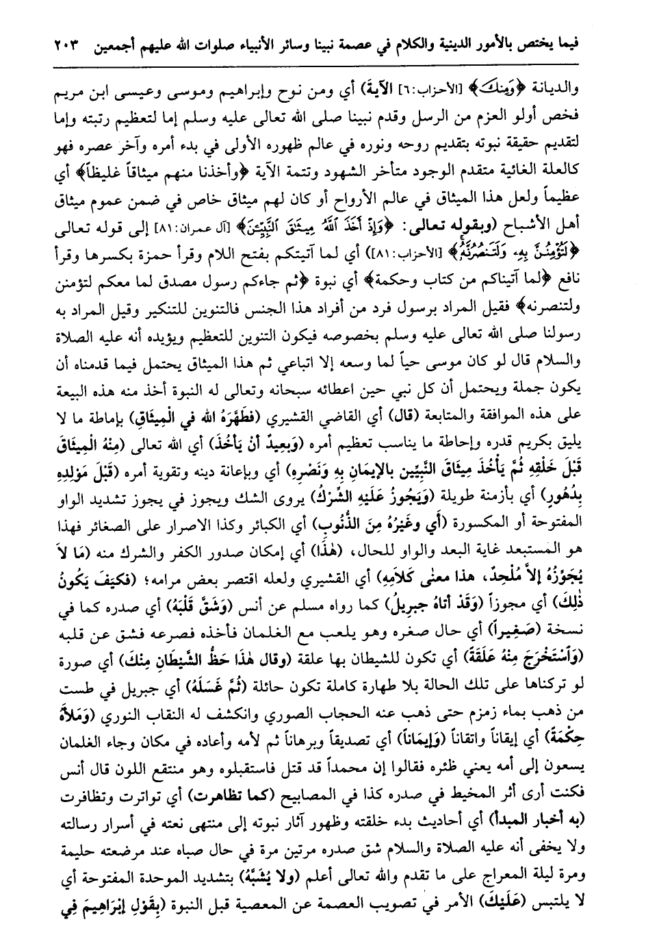 والديانة وَمِنْكَ [الأحزاب: 6] الآية) أي ومن نوح وإبراهيم وموسى وعيسى ابن مريم فخص أولو العزم من الرسل وقدم نبينا صلى الله تعالى عليه وسلم إما لتعظيم رتبته وإما لتقديم حقيقة نبوته بتقديم روحه ونوره في عالم ظهوره الأولى في بدء أمره وآخر عصره فهو كالعلة الغائية متقدم الوجود متأخر الشهود وتتمة الآية وَأَخَذْنا مِنْهُمْ مِيثاقاً غَلِيظاً أي عظيما ولعل هذا الميثاق في عالم الأرواح أو كان لهم ميثاق خاص في ضمن عموم ميثاق أهل الأشباح (وَبِقَوْلِهِ تَعَالَى: وَإِذْ أَخَذَ اللَّهُ مِيثاقَ النَّبِيِّينَ [آل عمران: 81] إلى قوله تعالى لَتُؤْمِنُنَّ بِهِ وَلَتَنْصُرُنَّهُ [الأحزاب: 81] أي لما آتيتكم بفتح اللام وقرأ حمزة بكسرها وقرأ نافع لما آتيناكم من كتاب وحكمة أي نبوة ثُمَّ جاءَكُمْ رَسُولٌ مُصَدِّقٌ لِما مَعَكُمْ لَتُؤْمِنُنَّ بِهِ وَلَتَنْصُرُنَّهُ فقيل المراد برسول فرد من أفراد هذا الجنس فالتنوين للتنكير وقيل المراد به رسولنا صلى الله تعالى عليه وسلم بخصوصه فيكون التنوين للتعظيم ويؤيده أنه عليه الصلاة والسلام قال لو كان موسى حيا لما وسعه إلا اتباعي ثم هذا الميثاق يحتمل فيما قدمناه أن يكون جملة ويحتمل أن كل نبي حين اعطائه سبحانه وتعالى له النبوة أخذ منه هذه البيعة على هذه الموافقة والمتابعة (قال) أي القاضي القشيري (فطهّره الله في الميثاق) بإماطة ما لا يليق بكريم قدره وإحاطة ما يناسب تعظيم أمره (وبعيد أن يأخذ) أي الله تعالى (منه الميثاق قبل خلقه ثمّ يأخذ ميثاق النّبيّين بالإيمان به ونصره) أي وبإعانة دينه وتقوية أمره (قبل مولده بدهور) أي بأزمنة طويلة (ويجوز عليه الشّرك) يروى الشك ويجوز في يجوز تشديد الواو المفتوحة أو المكسورة (أي وغيره من الذّنوب) أي الكبائر وكذا الاصرار على الصغائر فهذا هو المستبعد غاية البعد والواو للحال، (هذا) أي إمكان صدور الكفر والشرك منه (مَا لَا يُجَوِّزُهُ إِلَّا مُلْحِدٌ، هَذَا مَعْنَى كلامه) أي القشيري ولعله اقتصر بعض مرامه؛ (فكيف يكون ذلك) أي مجوزا (وقد أتاه جبريل) كما رواه مسلم عن أنس (وشقّ قلبه) أي صدره كما في نسخة (صغيرا) أي حال صغره وهو يلعب مع الغلمان فأخذه فصرعه فشق عن قلبه (واستخرج منه علقة) أي تكون للشيطان بها علقة (وقال هذا حظّ الشّيطان منك) أي صورة لو تركناها على تلك الحالة بلا طهارة كاملة تكون حائلة (ثمّ غسله) أي جبريل في طست من ذهب بماء زمزم حتى ذهب عنه الحجاب الصوري وانكشف له النقاب النوري (وملأه حكمة) أي إيقانا واتقانا (وإيمانا) أي تصديقا وبرهانا ثم لأمه وأعاده في مكان وجاء الغلمان يسعون إلى أمه يعني ظئره فقالوا إن محمدا قد قتل فاستقبلوه وهو منتقع اللون قال أنس فكنت أرى أثر المخيط في صدره كذا في المصابيح (كما تظاهرت) أي تواترت وتظافرت (به أخبار المبدأ) أي أحاديث بدء خلقته وظهور آثار نبوته إلى منتهى نعته في أسرار رسالته ولا يخفى أنه عليه الصلاة والسلام شق صدره مرتين مرة في حال صباه عند مرضعته حليمة ومرة ليلة المعراج على ما تقدم والله تعالى أعلم (ولا يشبّه) بتشديد الموحدة المفتوحة أي لا يلتبس (عليك) الأمر في تصويب العصمة عن المعصية قبل النبوة (بِقَوْلِ إِبْرَاهِيمَ فِي