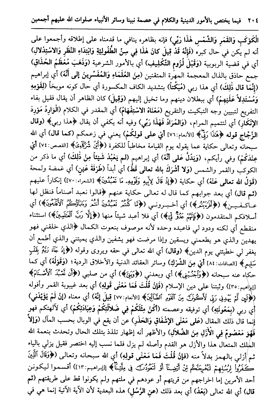 الكوكب والقمر والشّمس هذا ربّي) فإنه بظاهره ينافي ما قدمناه على إطلاقه وأجمعوا على أنه لم يكن في حال كبره (فَإِنَّهُ قَدْ قِيلَ كَانَ هَذَا فِي سَنِّ الطّفوليّة وابتداء النّظر والاستدلال) أي في قضية الربوبية (وقبل لزوم التّكليف) أي بالأمور الشرعية (وذهب معظم الحذاق) جمع حاذق بالذال المعجمة المهرة المتقنين (من العلماء والمفسّرين إلى أنّه) أي إبراهيم (إنّما قال ذلك) أي هذا ربي (مبكّتا) بتشديد الكاف المكسورة أي حال كونه موبخا (لقومه ومستدلا عليهم) أي ببطلان دينهم وما تخيل إليهم (وقيل) كان الظاهر أن يقال فقيل بفاء التفريع لتبيين وجه التبكيت والتقريع (معناه الاستفهام) أي المقدر في الكلام (الوارد مورد الإنكار) أي لتتميم المرام، (والمراد فهذا ربّي) وفيه أنه يكفي أن يقال هذا رَبِّي (وقال الزَّجَّاجُ قَوْلُهُ هَذَا رَبِّي [الْأَنْعَامِ: 76] أَيْ عَلَى قولكم) يعني في زعمكم (كما قال) أي الله سبحانه وتعالى حكاية عما يقوله يوم القيامة مخاطبا للكفرة (أَيْنَ شُرَكائِيَ [القصص: 74] أي عندكم) وفي رأيكم، (ويدلّ على أنّه) أي إبراهيم (لم يعبد شيئا من ذلك) أي ما ذكر من الكوكب والقمر والشمس (ولا أشرك بالله تعالى قطّ) أي أبدا (طرفة عين) أي غمضة ولمحة (قول الله تعالى عنه) أي حكاية (إِذْ قالَ لِأَبِيهِ وَقَوْمِهِ مَا تَعْبُدُونَ [الشُّعَرَاءِ: 70] ) إنكارا عليهم (ثم قال) أي بعد جوابهم كما قال له تعالى حكاية عنهم قالُوا نَعْبُدُ أَصْناماً فَنَظَلُّ لَها عاكِفِينَ (أَفَرَأَيْتُمْ أي أخبروني (ما كُنْتُمْ تَعْبُدُونَ أَنْتُمْ وَآباؤُكُمُ الْأَقْدَمُونَ) أي أسلافكم المتقدمون (فَإِنَّهُمْ عَدُوٌّ لِي) أي فلا أعبد شيئا منها (إِلَّا رَبَّ الْعالَمِينَ) استثناء منقطع أي لكنه ودود لي فاعبده وحده لأنه موصوف بنعوت الكمال الَّذِي خَلَقَنِي فَهُوَ يَهْدِينِ وَالَّذِي هُوَ يُطْعِمُنِي وَيَسْقِينِ وَإِذا مَرِضْتُ فَهُوَ يَشْفِينِ وَالَّذِي يُمِيتُنِي ثُمَّ يُحْيِينِ وَالَّذِي أَطْمَعُ أَنْ يَغْفِرَ لِي خَطِيئَتِي يَوْمَ الدِّينِ (وقال) أي الله تعالى في حقه ويروى وقوله (إِذْ جاءَ رَبَّهُ بِقَلْبٍ سَلِيمٍ [الصَّافَّاتِ: 84] أَيْ من الشّرك) وسائر العقائد الدنية والأخلاق الردية؛ (وقوله) أي كما حكاه عنه سبحانه (وَاجْنُبْنِي) أي وبعدني (وَبَنِيَّ) أي من صلبي (أَنْ نَعْبُدَ الْأَصْنامَ [إبراهيم: 35] ) وثبتنا على دين الإسلام (فإن قلت فما معنى قوله) أي بعد غيبوبة القمر وأفوله (لَئِنْ لَمْ يَهْدِنِي رَبِّي لَأَكُونَنَّ مِنَ الْقَوْمِ الضَّالِّينَ [الأنعام: 77] قيل إنّه) أي معناه (إن لم يؤيّدني) أي ربي (بمعونته) أي توفيقه وعصمته (أكن مثلكم في ضلالتكم وعبادتكم) أي لآلهتكم فهو إنما قال ذلك المقال (على معنى الإشفاق والحذر) عن أن يقع في الوبال بحسب المآل (وَإِلَّا فَهُوَ مَعْصُومٌ فِي الْأَزَلِ مِنَ الضَّلَالِ) والأظهر أنه إظهار تلذذ بتلك الحال وتحدث بنعمة الله الملك المتعال هذا والأزل هو القدم وأصله لم يزل فلما نسب إليه اختصر فقيل يزلي بالياء ثم أزلي بالهمز بدلا منه (فإن قلت فما معنى قوله) أي الله سبحانه وتعالى (وَقالَ الَّذِينَ كَفَرُوا لِرُسُلِهِمْ لَنُخْرِجَنَّكُمْ مِنْ أَرْضِنا أَوْ لَتَعُودُنَّ فِي مِلَّتِنا [إبراهيم: 13] ) أقسموا ليكونن أحد الأمرين إما اخراجهم من قريتهم أو عودهم في ملتهم ولم يكونوا قط على طريقتهم (ثم قال) أي الله تعالى (بعد) أي بعد ذلك (عن الرّسل) هذه البعدية لأن الآية الآتية إنما هي في