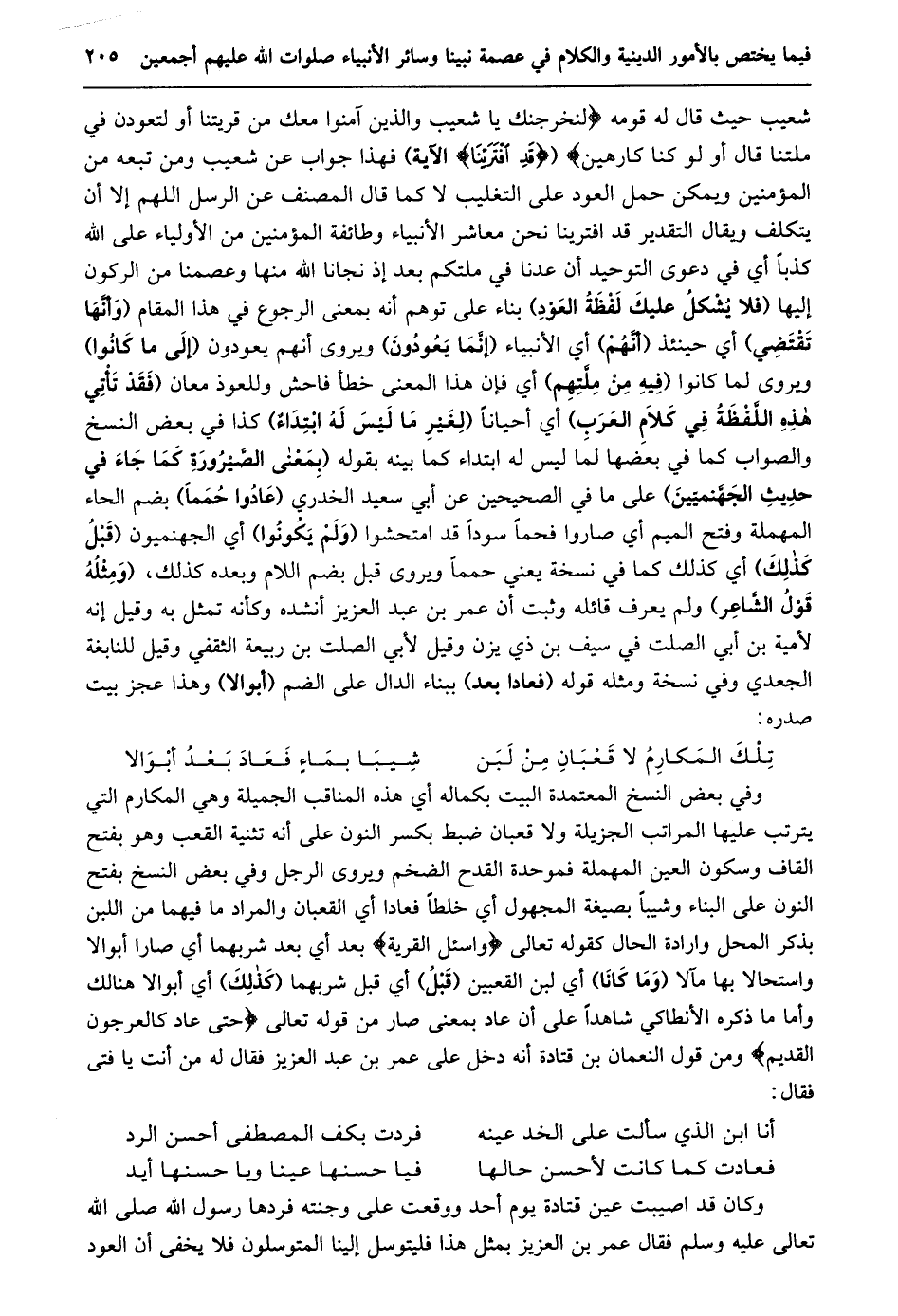 شعيب حيث قال له قومه لَنُخْرِجَنَّكَ يا شُعَيْبُ وَالَّذِينَ آمَنُوا مَعَكَ مِنْ قَرْيَتِنا أَوْ لَتَعُودُنَّ فِي مِلَّتِنا قالَ أَوَلَوْ كُنَّا كارِهِينَ (قَدِ افْتَرَيْنا الآية) فهذا جواب عن شعيب ومن تبعه من المؤمنين ويمكن حمل العود على التغليب لا كما قال المصنف عن الرسل اللهم إلا أن يتكلف ويقال التقدير قد افترينا نحن معاشر الأنبياء وطائفة المؤمنين من الأولياء على الله كذبا أي في دعوى التوحيد إِنْ عُدْنَا فِي مِلَّتِكُمْ بَعْدَ إِذْ نَجَّانَا الله منها وعصمنا من الركون إليها (فلا يشكل عليك لفظة العود) بناء على توهم أنه بمعنى الرجوع في هذا المقام (وأنّها تقتضي) أي حينئذ (أنّهم) أي الأنبياء (إنّما يعودون) ويروى أنهم يعودون (إلى ما كانوا) ويروى لما كانوا (فيه من ملّتهم) أي فإن هذا المعنى خطأ فاحش وللعوذ معان (فَقَدْ تَأْتِي هَذِهِ اللَّفْظَةُ فِي كَلَامِ الْعَرَبِ) أي أحيانا (لغير ما ليس له ابتداء) كذا في بعض النسخ والصواب كما في بعضها لما ليس له ابتداء كما بينه بقوله (بِمَعْنَى الصَّيْرُورَةِ كَمَا جَاءَ فِي حَدِيثِ الْجَهَنَّمِيِّينَ) على ما في الصحيحين عن أبي سعيد الخدري (عادوا حمما) بضم الحاء المهملة وفتح الميم أي صاروا فحما سودا قد امتحشوا (ولم يكونوا) أي الجهنميون (قبل كذلك) أي كذلك كما في نسخة يعني حمما ويروى قبل بضم اللام وبعده كذلك، (ومثله قول الشّاعر) ولم يعرف قائله وثبت أن عمر بن عبد العزيز أنشده وكأنه تمثل به وقيل إنه لأمية بن أبي الصلت في سيف بن ذي يزن وقيل لأبي الصلت بن ربيعة الثقفي وقيل للنابغة الجعدي وفي نسخة ومثله قوله (فعادا بعد) ببناء الدال على الضم (أبوالا) وهذا عجز بيت صدره: