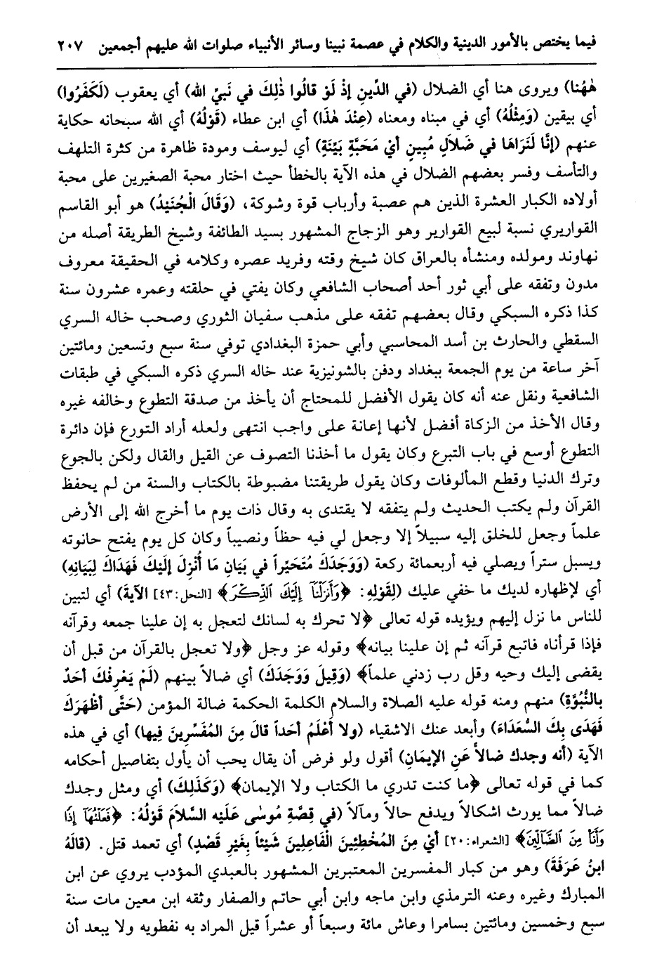 ههنا) ويروى هنا أي الضلال (فِي الدِّينِ إِذْ لَوْ قَالُوا ذَلِكَ فِي نبيّ الله) أي يعقوب (لكفروا) أي بيقين (ومثله) أي في مبناه ومعناه (عند هذا) أي ابن عطاء (قوله) أي الله سبحانه حكاية عنهم (إِنَّا لَنَرَاهَا فِي ضَلَالٍ مُبِينٍ أَيْ مَحَبَّةٍ بيّنة) أي ليوسف ومودة ظاهرة من كثرة التلهف والتأسف وفسر بعضهم الضلال في هذه الآية بالخطأ حيث اختار محبة الصغيرين على محبة أولاده الكبار العشرة الذين هم عصبة وأرباب قوة وشوكة، (وقال الجنيد) هو أبو القاسم القواريري نسبة لبيع القوارير وهو الزجاج المشهور بسيد الطائفة وشيخ الطريقة أصله من نهاوند ومولده ومنشأه بالعراق كان شيخ وقته وفريد عصره وكلامه في الحقيقة معروف مدون وتفقه على أبي ثور أحد أصحاب الشافعي وكان يفتي في حلقته وعمره عشرون سنة كذا ذكره السبكي وقال بعضهم تفقه على مذهب سفيان الثوري وصحب خاله السري السقطي والحارث بن أسد المحاسبي وأبي حمزة البغدادي توفي سنة سبع وتسعين ومائتين آخر ساعة من يوم الجمعة ببغداد ودفن بالشونيزية عند خاله السري ذكره السبكي في طبقات الشافعية ونقل عنه أنه كان يقول الأفضل للمحتاج أن يأخذ من صدقة التطوع وخالفه غيره وقال الأخذ من الزكاة أفضل لأنها إعانة على واجب انتهى ولعله أراد التورع فإن دائرة التطوع أوسع في باب التبرع وكان يقول ما أخذنا التصوف عن القيل والقال ولكن بالجوع وترك الدنيا وقطع المألوفات وكان يقول طريقتنا مضبوطة بالكتاب والسنة من لم يحفظ القرآن ولم يكتب الحديث ولم يتفقه لا يقتدى به وقال ذات يوم ما أخرج الله إلى الأرض علما وجعل للخلق إليه سبيلا إلا وجعل لي فيه حظا ونصيبا وكان كل يوم يفتح حانوته ويسبل سترا ويصلي فيه أربعمائة ركعة (وَوَجَدَكَ مُتَحَيِّرًا فِي بَيَانِ مَا أَنْزَلَ إِلَيْكَ فهداك لبيانه) أي لإظهاره لديك ما خفي عليك (لقوله: وَأَنْزَلْنا إِلَيْكَ الذِّكْرَ [النحل: 43] الآية) أي لتبين للناس ما نزل إليهم ويؤيده قوله تعالى لا تُحَرِّكْ بِهِ لِسانَكَ لِتَعْجَلَ بِهِ إِنَّ عَلَيْنا جَمْعَهُ وَقُرْآنَهُ فَإِذا قَرَأْناهُ فَاتَّبِعْ قُرْآنَهُ ثُمَّ إِنَّ عَلَيْنا بَيانَهُ