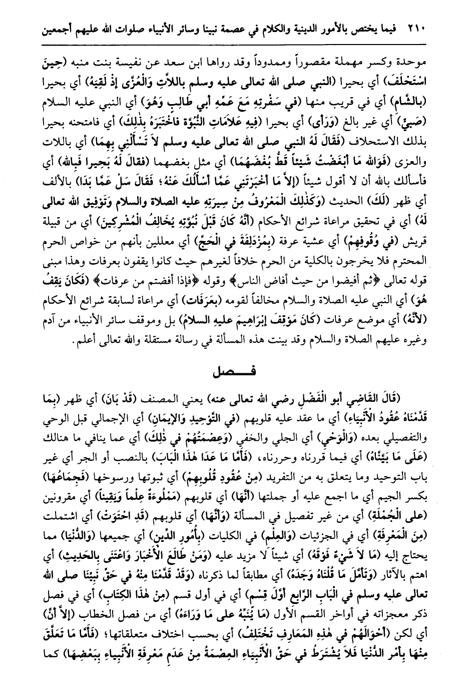 (قال القاضي أبو الفضل رضي الله تعالى عنه) يعني المصنف (قد بان) أي ظهر (بما قدّمناه عقود الأنبياء) أي ما عقد عليه قلوبهم (في التّوحيد والإيمان) أي الإجمالي قبل الوحي والتفصيلي بعده (والوحي) أي الجلي والخفي (وعصمتهم في ذلك) أي عما ينافي ما هنالك (على ما بيّنّاه) أي فيما قررناه وحررناه، (فأمّا ما عدا هذا الباب) بالنصب أو الجر أي غير باب التوحيد وما يتعلق به من التفريد (من عقود قلوبهم) أي ثبوتها ورسوخها (فجماعها) بكسر الجيم أي ما اجمع عليه أو جملتها (أنّها) أي قلوبهم (مملوءة علما ويقينا) أي مقرونين (على الجملة) أي من غير تفصيل في المسألة (وأنّها) أي قلوبهم (قد احتوت) أي اشتملت (من المعرفة) أي في الجزئيات (والعلم) في الكليات (بأمور الدّين) أي جميعها (والدّنيا) مما يحتاج إليه (ما لا شيء فوقه) أي شيئا لا مزيد عليه (ومن طالع الأخبار واعتنى بالحديث) أي اهتم بالآثار (وتأمّل ما قلناه وجده) أي مطابقا لما ذكرناه (وقد قدّمنا منه في حقّ نبيّنا صلى الله تعالى عليه وسلم في الباب الرّابع أوّل قسم) أي في أول قسم (من هذا الكتاب) أي في فصل ذكر معجزاته في أواخر القسم الأول (ما ينبّه على ما وراءه) أي من فصل الخطاب (إلّا أنّ) أي لكن (أحوالهم في هذه المعارف تختلف) أي بحسب اختلاف متعلقاتها؛ (فَأَمَّا مَا تَعَلَّقَ مِنْهَا بِأَمْرِ الدُّنْيَا فَلَا يشترط فِي حَقِّ الْأَنْبِيَاءِ الْعِصْمَةُ مِنْ عَدَمِ مَعْرِفَةِ الأنبياء ببعضها) كما