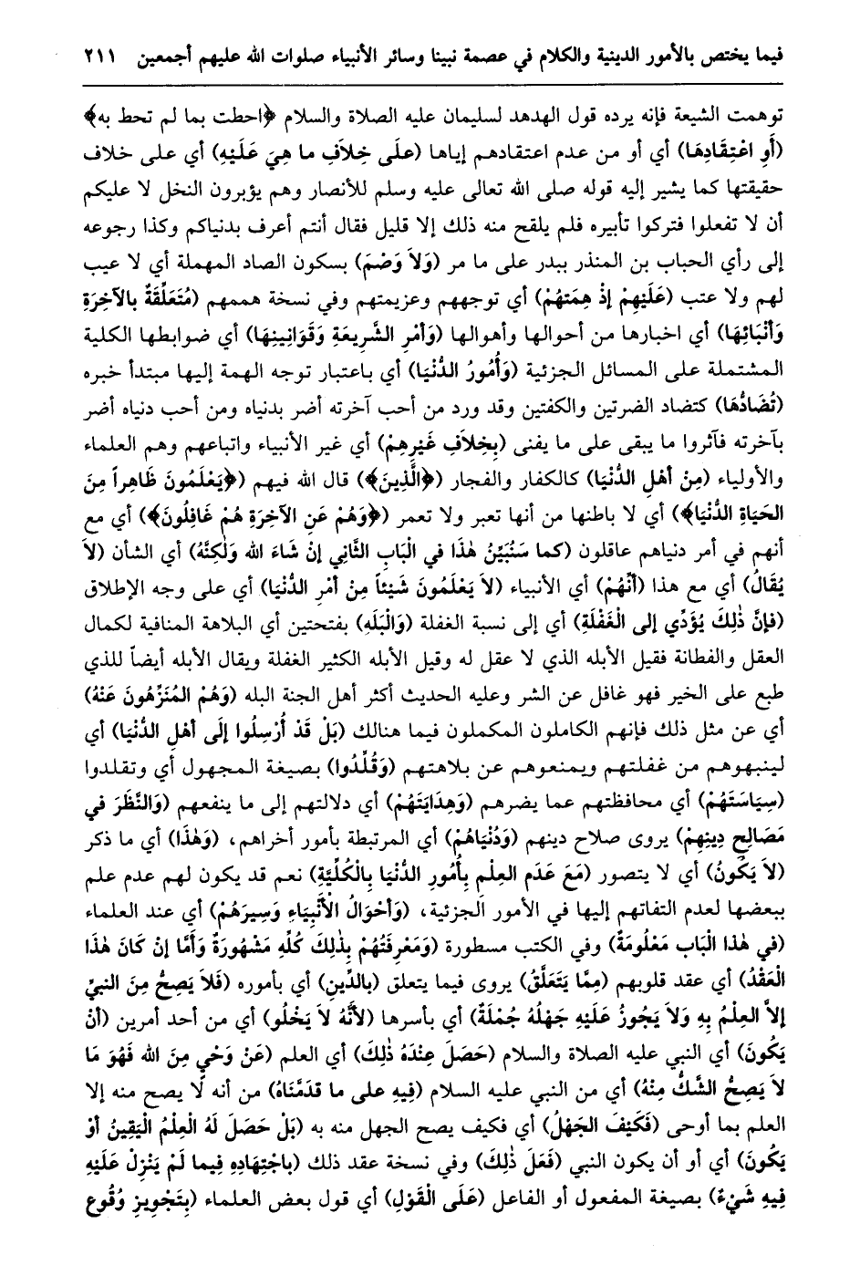 توهمت الشيعة فإنه يرده قول الهدهد لسليمان عليه الصلاة والسلام أَحَطْتُ بِما لَمْ تُحِطْ بِهِ (أو اعتقادها) أي أو من عدم اعتقادهم إياها (على خلاف ما هي عليه) أي على خلاف حقيقتها كما يشير إليه قوله صلى الله تعالى عليه وسلم للأنصار وهم يؤبرون النخل لا عليكم أن لا تفعلوا فتركوا تأبيره فلم يلقح منه ذلك إلا قليل فقال أنتم أعرف بدنياكم وكذا رجوعه إلى رأي الحباب بن المنذر ببدر على ما مر (ولا وصم) بسكون الصاد المهملة أي لا عيب لهم ولا عتب (عليهم إذ همتهم) أي توجههم وعزيمتهم وفي نسخة هممهم (متعلّقة بالآخرة وأنبائها) أي اخبارها من أحوالها وأهوالها (وأمر الشّريعة وقوانينها) أي ضوابطها الكلية المشتملة على المسائل الجزئية (وأمور الدّنيا) أي باعتبار توجه الهمة إليها مبتدأ خبره (تضادّها) كتضاد الضرتين والكفتين وقد ورد من أحب آخرته أضر بدنياه ومن أحب دنياه أضر بآخرته فآثروا ما يبقى على ما يفنى (بخلاف غيرهم) أي غير الأنبياء واتباعهم وهم العلماء والأولياء (من أهل الدّنيا) كالكفار والفجار (الذين) قال الله فيهم (يَعْلَمُونَ ظاهِراً مِنَ الْحَياةِ الدُّنْيا) أي لا باطنها من أنها تعبر ولا تعمر (وَهُمْ عَنِ الْآخِرَةِ هُمْ غافِلُونَ) أي مع أنهم في أمر دنياهم عاقلون (كَمَا سَنُبَيِّنُ هَذَا فِي الْبَابِ الثَّانِي إِنْ شاء الله ولكنّه) أي الشأن (لا يقال) أي مع هذا (أنّهم) أي الأنبياء (لا يعلمون شيئا من أمر الدّنيا) أي على وجه الإطلاق (فإنّ ذلك يؤدّي إلى الغفلة) أي إلى نسبة الغفلة (والبله) بفتحتين أي البلاهة المنافية لكمال العقل والفطانة فقيل الأبله الذي لا عقل له وقيل الأبله الكثير الغفلة ويقال الأبله أيضا للذي طبع على الخير فهو غافل عن الشر وعليه الحديث أكثر أهل الجنة البله (وهم المنزّهون عنه) أي عن مثل ذلك فإنهم الكاملون المكملون فيما هنالك (بل قد أرسلوا إلى أهل الدّنيا) أي لينبهوهم من غفلتهم ويمنعوهم عن بلاهتهم (وقلّدوا) بصيغة المجهول أي وتقلدوا (سياستهم) أي محافظتهم عما يضرهم (وهدايتهم) أي دلالتهم إلى ما ينفعهم (والنّظر في مصالح دينهم) يروى صلاح دينهم (ودنياهم) أي المرتبطة بأمور أخراهم، (وهذا) أي ما ذكر (لا يكون) أي لا يتصور (مع عدم العلم بأمور الدّنيا بالكلّيّة) نعم قد يكون لهم عدم علم ببعضها لعدم التفاتهم إليها في الأمور الجزئية، (وأحوال الأنبياء وسيرهم) أي عند العلماء (في هذا الباب معلومة) وفي الكتب مسطورة (وَمَعْرِفَتُهُمْ بِذَلِكَ كُلِّهِ مَشْهُورَةٌ وَأَمَّا إِنْ كَانَ هذا العقد) أي عقد قلوبهم (ممّا يتعلّق) يروى فيما يتعلق (بالدّين) أي بأموره (فلا يصحّ من النبيّ إِلَّا الْعِلْمُ بِهِ وَلَا يَجُوزُ عَلَيْهِ جَهْلُهُ جملة) أي بأسرها (لأنّه لا يخلو) أي من أحد أمرين (أن يكون) أي النبي عليه الصلاة والسلام (حصل عنده ذلك) أي العلم (عن وحي من الله فهو ما لا يصحّ الشّكّ منه) أي من النبي عليه السلام (فيه على ما قدّمناه) من أنه لا يصح منه إلا العلم بما أوحى (فكيف الجهل) أي فكيف يصح الجهل منه به (بَلْ حَصَلَ لَهُ الْعِلْمُ الْيَقِينُ أَوْ يَكُونُ) أي أو أن يكون النبي (فعل ذلك) وفي نسخة عقد ذَلِكَ (بِاجْتِهَادِهِ فِيمَا لَمْ يَنْزِلْ عَلَيْهِ فِيهِ شيء) بصيغة المفعول أو الفاعل (على القول) أي قول بعض العلماء (بتجويز وقوع