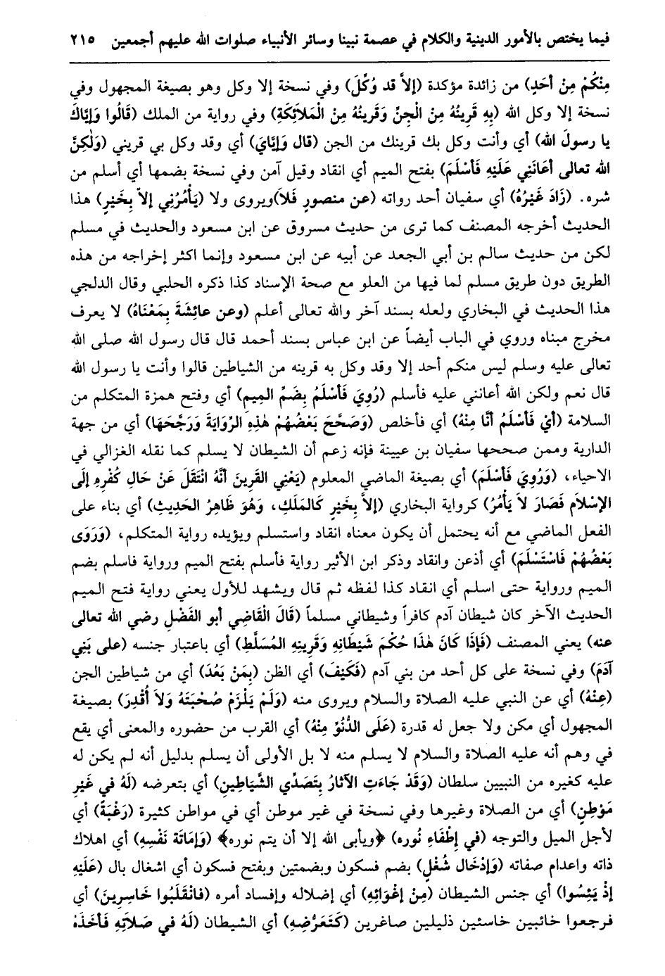 منكم من أحد) من زائدة مؤكدة (إلّا قد وكّل) وفي نسخة إلا وكل وهو بصيغة المجهول وفي نسخة إلا وكل الله (بِهِ قَرِينُهُ مِنَ الْجِنِّ وَقَرِينُهُ مِنَ الْمَلَائِكَةِ) وفي رواية من الملك (قالوا وإيّاك يا رسول الله) أي وأنت وكل بك قرينك من الجن (قال وإيّاي) أي وقد وكل بي قريني (ولكنّ الله تعالى أعانني عليه فأسلم) بفتح الميم أي انقاد وقيل آمن وفي نسخة بضمها أي أسلم من شره. (زاد غيره) أي سفيان أحد رواته (عن منصور فلا) ويروى ولا (يأمرني إلّا بخير) هذا الحديث أخرجه المصنف كما ترى من حديث مسروق عن ابن مسعود والحديث في مسلم لكن من حديث سالم بن أبي الجعد عن أبيه عن ابن مسعود وإنما اكثر إخراجه من هذه الطريق دون طريق مسلم لما فيها من العلو مع صحة الإسناد كذا ذكره الحلبي وقال الدلجي هذا الحديث في البخاري ولعله بسند آخر والله تعالى أعلم (وعن عائشة بمعناه) لا يعرف مخرج مبناه وروي في الباب أيضا عن ابن عباس بسند أحمد قال قال رسول الله صلى الله تعالى عليه وسلم ليس منكم أحد إلا وقد وكل به قرينه من الشياطين قالوا وأنت يا رسول الله قال نعم ولكن الله أعانني عليه فأسلم (روي فأسلم بضمّ الميم) أي وفتح همزة المتكلم من السلامة (أي فأسلم أنّا منه) أي فأخلص (وصحّح بعضهم هذه الرّواية ورجّحها) أي من جهة الدارية وممن صححها سفيان بن عيينة فإنه زعم أن الشيطان لا يسلم كما نقله الغزالي في الاحياء، (وروي فأسلم) أي بصيغة الماضي المعلوم (يعني القرين أنّه انتقل عن حَالِ كُفْرِهِ إِلَى الْإِسْلَامِ فَصَارَ لَا يَأْمُرُ) كرواية البخاري (إلّا بخير كالملك، وهو ظاهر الحديث) أي بناء على الفعل الماضي مع أنه يحتمل أن يكون معناه انقاد واستسلم ويؤيده رواية المتكلم، (وروى بعضهم فاستسلم) أي أذعن وانقاد وذكر ابن الأثير رواية فأسلم بفتح الميم ورواية فاسلم بضم الميم ورواية حتى اسلم أي انقاد كذا لفظه ثم قال ويشهد للأول يعني رواية فتح الميم الحديث الآخر كان شيطان آدم كافرا وشيطاني مسلما (قال القاضي أبو الفضل رضي الله تعالى عنه) يعني المصنف (فَإِذَا كَانَ هَذَا حُكْمَ شَيْطَانِهِ وَقَرِينِهِ الْمُسَلَّطِ) أي باعتبار جنسه (على بني آدم) وفي نسخة على كل أحد من بني آدم (فكيف) أي الظن (بمن بعد) أي من شياطين الجن (عنه) أي عن النبي عليه الصلاة والسلام ويروى منه (ولم يلزم صحبته ولا أقدر) بصيغة المجهول أي مكن ولا جعل له قدرة (على الدّنوّ منه) أي القرب من حضوره والمعنى أي يقع في وهم أنه عليه الصلاة والسلام لا يسلم منه لا بل الأولى أن يسلم بدليل أنه لم يكن له عليه كغيره من النبيين سلطان (وقد جاءت الآثار بتصدّي الشّياطين) أي بتعرضه (له في غير موطن) أي من الصلاة وغيرها وفي نسخة في غير موطن أي في مواطن كثيرة (رغبة) أي لأجل الميل والتوجه (في إطفاء نوره) وَيَأْبَى اللَّهُ إِلَّا أَنْ يُتِمَّ نُورَهُ (وإماتة نفسه) أي اهلاك ذاته واعدام صفاته (وإدخال شغل) بضم فسكون وبضمتين وبفتح فسكون أي اشغال بال (عليه إذ يئسوا) أي جنس الشيطان (من إغوائه) أي إضلاله وإفساد أمره (فانقلبوا خاسرين) أي فرجعوا خائبين خاسئين ذليلين صاغرين (كتعرّضه) أي الشيطان (لَهُ فِي صَلَاتِهِ فَأَخَذَهُ