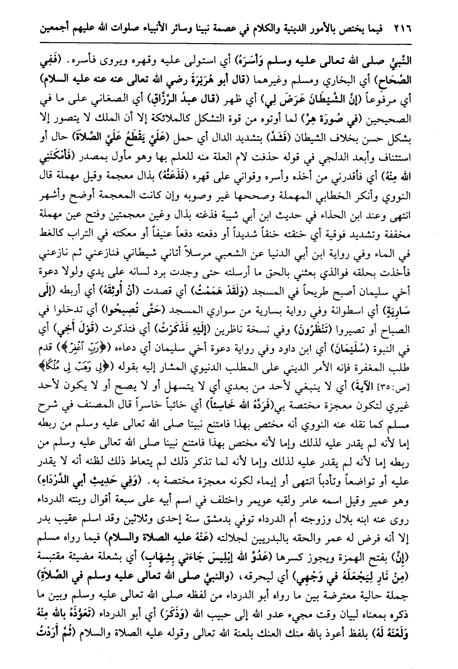 النّبيّ صلى الله تعالى عليه وسلم وأسره) أي استولى عليه وقهره ويروى فأسره. (ففي الصّحاح) أي البخاري ومسلم وغيرهما (قال أبو هريرة رضي الله تعالى عنه عنه عليه السلام) أي مرفوعا (إنّ الشّيطان عرض لي) أي ظهر (قال عبد الرّزّاق) أي الصغاني على ما في الصحيحين (في صورة هرّ) لما أوتوه من قوة التشكل كالملائكة إلا أن الملك لا يتصور إلا بشكل حسن بخلاف الشيطان (فشدّ) بتشديد الدال أي حمل (عليّ يقطع عليّ الصّلاة) حال أو استئناف وأبعد الدلجي في قوله حذفت لام العلة منه للعلم بها وهو مأول بمصدر (فأمكنني الله منه) أي فأقدرني من أخذه وأسره وقواني على قهره (فذعتّه) بذال معجمة وقيل مهملة قال النووي وأنكر الخطابي المهملة وصححها غير وصوبه وإن كانت المعجمة أوضح وأشهر انتهى وعند ابن الحذاء في حديث ابن أبي شيبة فذغته بذال وغين معجمتين وفتح عين مهملة مخففة وتشديد فوقية أي خنقته خنقا شديدا أو دفعته دفعا عنيفا أو معكته في التراب كالغط في الماء وفي رواية ابن أبي الدنيا عن الشعبي مرسلا أتاني شيطاني فنازعني ثم نازعني فأخذت بحلقه فو الذي بعثني بالحق ما أرسلته حتى وجدت برد لسانه على يدي ولولا دعوة أخي سليمان أصبح طريحا في المسجد (ولقد هممت) أي قصدت (أن أوثقه) أي أربطه (إلى سارية) أي اسطوانة وفي رواية بسارية من سواري المسجد (حتّى تصبحوا) أي تدخلوا في الصباح أو تصيروا (تنظرون) وفي نسخة ناظرين (إليه فذكرت) أي فتذكرت (قول أخي) أي في النبوة (سليمان) أي ابن داود وفي رواية دعوة أخي سليمان أي دعاءه (رَبِّ اغْفِرْ) قدم طلب المغفرة فإنه الأمر الديني على المطلب الدنيوي المشار إليه بقوله (لِي وَهَبْ لِي مُلْكاً [ص: 35] الآية) أي لا ينبغي لأحد من بعدي أي لا يتسهل أو لا يصح أو لا يكون لأحد غيري لتكون معجزة مختصة بي (فردّه الله خاسئا) أي خائبا خاسرا قال المصنف في شرح مسلم كما نقله عنه النووي أنه مختص بهذا فامتنع نبينا صلى الله تعالى عليه وسلم من ربطه إما لأنه لم يقدر عليه لذلك وإما لأنه مختص بهذا فامتنع نبينا صلى الله تعالى عليه وسلم من ربطه إما لأنه لم يقدر عليه لذلك وإما لأنه لما تذكر ذلك لم يتعاط ذلك لظنه أنه لا يقدر عليه أو تواضعا وتأدبا انتهى أو إيماء لكونه معجزة مختصة به. (وفي حديث أبي الدّرداء) وهو عمير وقيل اسمه عامر ولقبه عويمر واختلف في اسم أبيه على سبعة أقوال وبنته الدرداء روى عنه ابنه بلال وزوجته أم الدرداء توفي بدمشق سنة إحدى وثلاثين وقد اسلم عقيب بدر إلا أنه فرض له عمر والحقه بالبدريين لجلالته (عنه عليه الصلاة والسلام) فيما رواه مسلم (إنّ) بفتح الهمزة ويجوز كسرها (عدوّ الله إبليس جاءني بشهاب) أي بشعلة مضيئة مقتبسة (من نار ليجعله في وجهي) أي ليحرقه، (والنبيّ صلى الله تعالى عليه وسلم في الصّلاة) جملة حالية معترضة بين ما رواه أبو الدرداء من لفظه صلى الله تعالى عليه وسلم وبين ما ذكره بمعناه لبيان وقت مجيء عدو الله إلى حبيب الله (وذكر) أي أبو الدرداء (تعوّذه بالله منه ولعنه له) بلفظ أعوذ بالله منك العنك بلعنة الله تعالى وقوله عليه الصلاة والسلام (ثمّ أردت