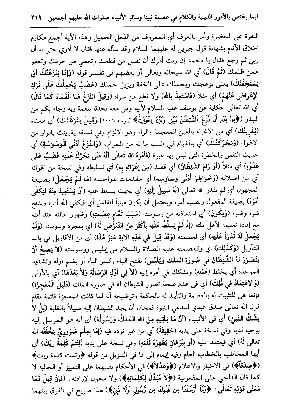 النفرة عن الحضرة وأمر بالعرف أي المعروف من الفعل الجميل وهذه الآية أجمع مكارم اخلاق الأنام بشهادة قول جبريل له عليهما السلام وقد سأله عنها فقال لا أدري حتى اسأل ربي ثم رجع فقال يا محمد إن ربك أمرك أَنْ تَصِلَ مَنْ قَطَعَكَ وَتُعْطِيَ مَنْ حَرَمَكَ وتعفو عمن ظلمك (ثمّ قال) أي الله سبحانه وتعالى أو بعضهم في تفسير قوله (وإمّا ينزغنّك أي يستخفنّك) يعني يزعجك ويحملك على الخفة ويزيل حملك (غضب يحملك على ترك الإعراض عنهم) أي مثلا (فاستعذ بالله) ولا تطع من سواه (وقيل النّزغ هنا الفساد كما قال) أي الله تعالى حكاية عن يوسف عليه السلام لأبيه ومن معه تحدثا بنعمة ربه وجاء بكم من البدو (مِنْ بَعْدِ أَنْ نَزَغَ الشَّيْطانُ بَيْنِي وَبَيْنَ إِخْوَتِي [يوسف: 100] وقيل ينزغنّك) أي معناه (يغرينّك) أي من الاغراء بالغين المعجمة والراء وهو الالزام وفي نسخة يغوينك بالواو من الاغواء (ويحرّكنّك) أي بالقيام في طلب ما له من المرام، (والنّزغ أدنى الوسوسة) أي حديث النفس والخطرة التي ليس بها عبرة (فَأَمَرَهُ اللَّهُ تَعَالَى أَنَّهُ مَتَى تَحَرَّكَ عَلَيْهِ غضب على عدوّه) أي مثلا (أو رام الشّيطان) أي قصد (من إغرائه به) أي تسليطه وفي نسخة من اغوائه أي من اضلاله (وخواطر أدنى وساوسه) أي مقدمات هواجسه (ما لم يجعل) بصيغة المجهول أي لم يقدر الله تعالى (له سبيل إليه) أي بحيث يتسلط عليه (أن يستعيذ منه فيكفى أمره) بصيغة المفعول ونصب أمره ويحتمل أن يكون مبنيا للفاعل أي فيكفي الله أمره ويدفع شره وضره (ويكون) أي استعاذته من وسوسته (سبب تمّام عصمته) وظهور حالته عند أمته مع إفادة تعليمه لأهل ملته (إِذْ لَمْ يُسَلَّطْ عَلَيْهِ بِأَكْثَرَ مِنَ التَّعَرُّضِ له) أي بمجرد وسوسته (ولم يجعل له قدرة عليه) أي لعصمته (وَقَدْ قِيلَ فِي هَذِهِ الْآيَةِ غَيْرُ هَذَا) أي من الأقاويل في باب التأويل (وكذلك) أي وكعصمته عليه الصلاة والسلام من إبليس ووسوسته (لَا يَصِحُّ أَنْ يَتَصَوَّرَ لَهُ الشَّيْطَانُ فِي صورة الملك ويلبّس) بفتح الياء وكسر الباء أو بضم أوله وتشديد الموحدة أي يخلط (عليه) ويشكك في أمره إليه (لا في أوّل الرّسالة ولا بعدها) أي بالأولى (والاعتماد في ذلك) أي في عدم صحة تصور الشيطان له في صورة الملك (دليل المعجزة) فإنما هي للتثبيت له بالعصمة والتأييد له بالحكمة وتوضيحه أنه لما كانت المعجزة قائمة مقام قول الله تعالى صدق عبدي لمدعي النبوة فمحال أن يجد الشيطان إليه سبيلا بالغلبة (بل لا يشكّ النّبيّ) أي في الأنبياء (أَنَّ مَا يَأْتِيهِ مِنَ اللَّهِ الْمَلَكُ وَرَسُولُهُ) أي أنه هو المرسل إليه بوحيه لديه وفي نسخة على يديه (حقيقة) أي من غير تردد فيه (إمّا بعلم ضروريّ يخلقه الله تعالى له) أي فيعتمد عليه (أو ببرهان يظهره لديه) وفي نسخة على يديه (لتتمّ كلمة ربّك) أي أيها المخاطب بالخطاب العام وفيه إيماء إلى ما في التنزيل من قوله وَتَمَّتْ كَلِمَةُ رَبِّكَ (صِدْقاً) في الاخبار والاعلام (وَعَدْلًا) في الأحكام نصبهما على التمييز أو الحالية لا كما قال الدلجي على المفعولية (لا مُبَدِّلَ لِكَلِماتِهِ) ولا محول لإرادته. (فَإِنْ قِيلَ فَمَا مَعْنَى قَوْلِهِ تَعَالَى: وَما أَرْسَلْنا مِنْ قَبْلِكَ مِنْ رَسُولٍ وَلا نَبِيٍّ) هذا صريح في الفرق بينهما