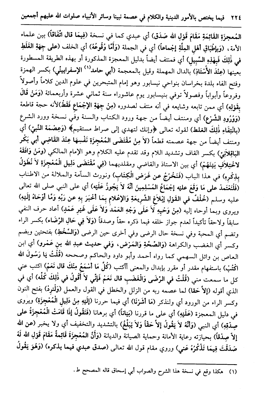 المعجزة القائمة مقام قول الله صدق) أي عبدي كما في نسخة (فيما قال اتّفاقا) بين علماء الأمة، (وبإطباق أهل الملّة إجماعا) أي في الجملة (وأمّا وقوعه) أي الخلف (عَلَى جِهَةِ الْغَلَطِ فِي ذَلِكَ فَبِهَذِهِ السَّبِيلِ) أي فمنتف أيضا بدليل المعجزة المذكورة أو بهذه الطريقة المسطورة بعينها (عند الأستاذ) بالدال المهملة وقيل بالمعجمة (أبي حامد «1» الإسفرايينّي) بكسر الهمزة وفتح الفاء بلدة بخراسان بنواحي نيسابور وهو إمام المتبحرين في علوم الدين كلاما وأصولا وفروعا وأبوابا وفصولا توفي بنيسابور يوم عاشوراء سنة ثماني عشرة وأربعمائة (ومن قال بقوله) أي ممن تابعه وشايعه في أنه منتف لصدوره (من جهة الإجماع فقط) لأنه حجة قاطعة (وورود الشّرع) أي ومنتف أيضا من جهة ورود الكتاب والسنة وفي نسخة وورد الشرع (بانتفاء ذلك الغلط) لقوله تعالى وَإِنَّكَ لَتَهْدِي إِلى صِراطٍ مُسْتَقِيمٍ (وعصمة النّبيّ) أي ومنتف أيضا من جهة عصمته قطعا (لَا مِنْ مُقْتَضَى الْمُعْجِزَةِ نَفْسِهَا عِنْدَ الْقَاضِي أبي بكر الباقلانيّ) بكسر القاف وتشديد اللام وقد تقدم عليه الكلام وهو الإمام المالكي (ومن وافقه لاختلاف بينهم) أي بين الاستاذ والقاضي ومقلديهما (فِي مُقْتَضَى دَلِيلِ الْمُعْجِزَةِ لَا نُطَوِّلُ بِذِكْرِهِ) في هذا الباب (فنخرج عن غرض الكتاب) ونورث السآمة والملالة من الاطناب (فَلْنَعْتَمِدْ عَلَى مَا وَقَعَ عَلَيْهِ إِجْمَاعُ الْمُسْلِمِينَ أنّه لا يجوز عليه) أي على النبي صلى الله تعالى عليه وسلم (خلف في القول إِبْلَاغِ الشَّرِيعَةِ وَالْإِعْلَامِ بِمَا أَخْبَرَ بِهِ عَنْ ربّه ومّا أوحاه إليه) ويروى وبما أَوْحَاهُ إِلَيْهِ (مِنْ وَحْيِهِ لَا عَلَى وَجْهِ العمد ولا على غير عمد) أعاد حرف النفي سابقا ولا حقا تأكيدا لعدم جواز خلفه فيما ذكره حقا وصدقا (ولا في حال الرّضاء) بكسر الراء وتضم أي المحبة وفي نسخة حال الرضى وفي أخرى حين الرضى (والسّخط) بفتحين وبضم وكسر أي الغضب والكراهة (وَالصِّحَّةِ وَالْمَرَضِ، وَفِي حَدِيثِ عَبْدِ اللَّهِ بْنِ عمرو) أي ابن العاص بن وائل السهمي كما رواه أحمد وأبو داود والحاكم وصححه (قلت يا رسول الله اكتب) باستفهام مقدر أو مقرر بإبدال والمعنى أأكتب (كلّ ما أسمع منك قال نعم) اكتب عني كل ما سمعت مني (قُلْتُ فِي الرِّضَى وَالْغَضَبِ قَالَ نَعَمْ فَإِنِّي لا أقول في ذلك كلّه) أي في الذي أقوله (إلّا حقا) لما عصمه ربه من الزلل والخطل في القول والعمل (ولنرد) بفتح النون وكسر الراء من الورود أي ولنذكر (ما أشرنا) أي فيما حررنا (إليه من دليل المعجزة) ويروى في دليل المعجزة (عليه) أي على ما قررنا (بيانا) أي برهانا (فنقول إذا قامت المعجزة على صدقه) أي النبي (وَأَنَّهُ لَا يَقُولُ إِلَّا حَقًّا وَلَا يُبَلِّغُ) بالتشديد والتخفيف أي ولا يخبر (عن الله إلّا صدقا) بحيازته رعاية الأمانة وحماية الصيانة والديانة (وَأَنَّ الْمُعْجِزَةَ قَائِمَةٌ مَقَامَ قَوْلِ اللَّهِ لَهُ صدقت فيما تذكره عني) وروي مقام قول الله تعالى (صدق عبدي فيما يذكره) (وهو يقول
