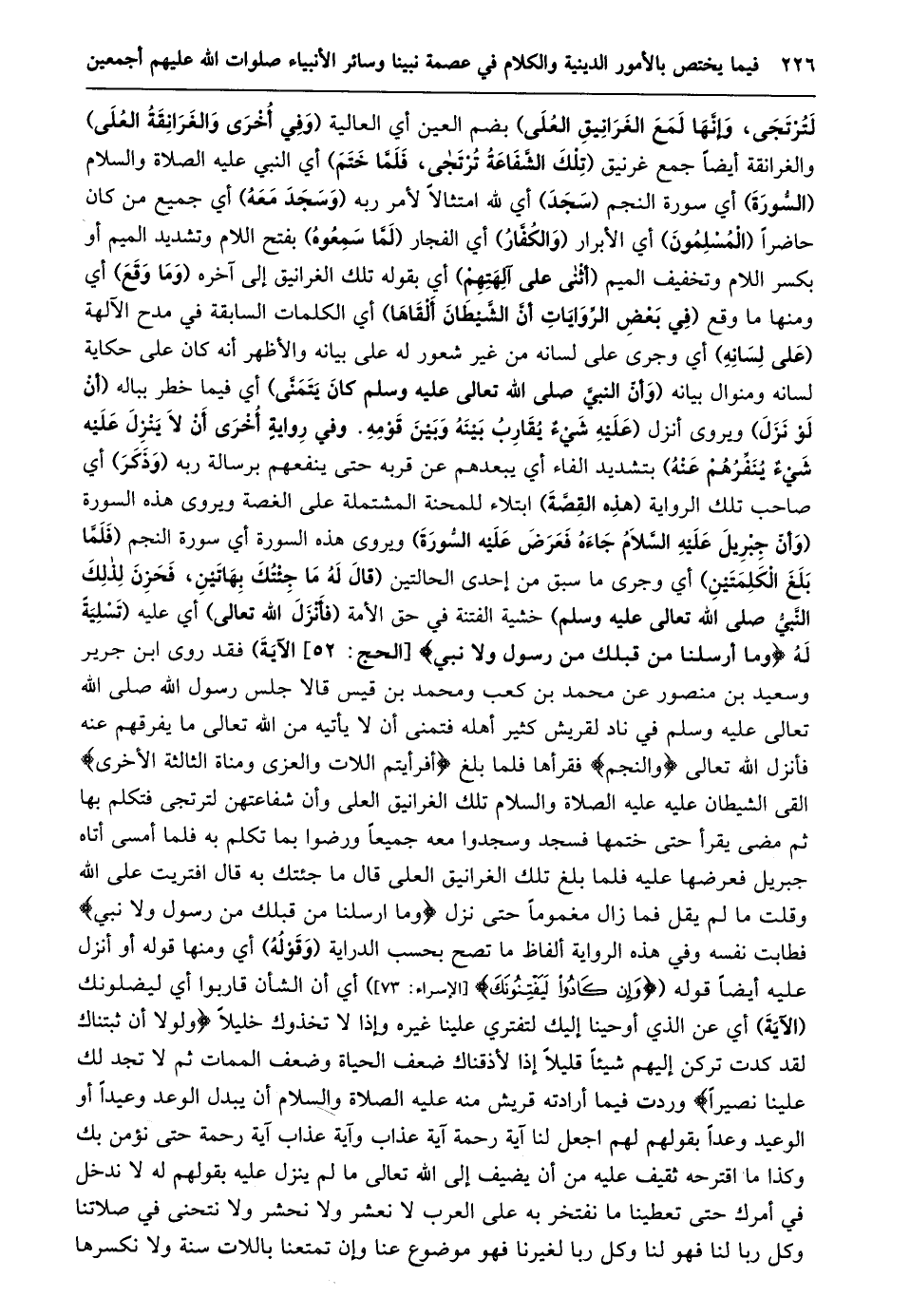 لترتجى، وإنّها لمع الغرانيق العلى) بضم العين أي العالية (وفي أخرى والغرانقة العلى) والغرانقة أيضا جمع غرنيق (تلك الشّفاعة ترتجى، فلمّا ختم) أي النبي عليه الصلاة والسلام (السّورة) أي سورة النجم (سجد) أي لله امتثالا لأمر ربه (وسجد معه) أي جميع من كان حاضرا (المسلمون) أي الأبرار (والكفّار) أي الفجار (لمّا سمعوه) بفتح اللام وتشديد الميم أو بكسر اللام وتخفيف الميم (أثنى على آلهتهم) أي بقوله تلك الغرانيق إلى آخره (وما وقع) أي ومنها ما وَقَعَ (فِي بَعْضِ الرِّوَايَاتِ أَنَّ الشَّيْطَانَ أَلْقَاهَا) أي الكلمات السابقة في مدح الآلهة (على لسانه) أي وجرى على لسانه من غير شعور له على بيانه والأظهر أنه كان على حكاية لسانه ومنوال بيانه (وأنّ النبيّ صلى الله تعالى عليه وسلم كان يتمنّى) أي فيما خطر بباله (أن لو نزل) ويروى أنزل (عَلَيْهِ شَيْءٌ يُقَارِبُ بَيْنَهُ وَبَيْنَ قَوْمِهِ. وَفِي رِوَايَةٍ أُخْرَى أَنْ لَا يَنْزِلَ عَلَيْهِ شَيْءٌ ينفّرهم عنه) بتشديد الفاء أي يبعدهم عن قربه حتى ينفعهم برسالة ربه (وذكر) أي صاحب تلك الرواية (هذه القصّة) ابتلاء للمحنة المشتملة على الغصة ويروى هذه السورة (وأنّ جبريل عليه السّلام جاءه فعرض عليه السّورة) ويروى هذه السورة أي سورة النجم (فلمّا بلغ الكلمتين) أي وجرى ما سبق من إحدى الحالتين (قَالَ لَهُ مَا جِئْتُكَ بِهَاتَيْنِ، فَحَزِنَ لِذَلِكَ النّبيّ صلى الله تعالى عليه وسلم) خشية الفتنة في حق الأمة (فأنزل الله تعالى) أي عليه (تَسْلِيَةً لَهُ وَما أَرْسَلْنا مِنْ قَبْلِكَ مِنْ رَسُولٍ وَلا نَبِيٍّ [الحج: 52] الآية) فقد روى ابن جرير وسعيد بن منصور عن محمد بن كعب ومحمد بن قيس قالا جلس رسول الله صلى الله تعالى عليه وسلم في ناد لقريش كثير أهله فتمنى أن لا يأتيه من الله تعالى ما يفرقهم عنه فأنزل الله تعالى وَالنَّجْمِ فقرأها فلما بلغ أَفَرَأَيْتُمُ اللَّاتَ وَالْعُزَّى وَمَناةَ الثَّالِثَةَ الْأُخْرى القى الشيطان عليه عليه الصلاة والسلام تلك الغرانيق العلى وأن شفاعتهن لترتجى فتكلم بها ثم مضى يقرأ حتى ختمها فسجد وسجدوا معه جميعا ورضوا بما تكلم به فلما أمسى أتاه جبريل فعرضها عليه فلما بلغ تلك الغرانيق العلى قال ما جئتك به قال افْتَرَيْتُ عَلَى اللَّهِ وَقُلْتُ مَا لَمْ يَقُلْ فما زال مغموما حتى نزل وَما أَرْسَلْنا مِنْ قَبْلِكَ مِنْ رَسُولٍ وَلا نَبِيٍّ فطابت نفسه وفي هذه الرواية ألفاظ ما تصح بحسب الدراية (وقوله) أي ومنها قوله أو أنزل عليه أيضا قوله (وَإِنْ كادُوا لَيَفْتِنُونَكَ [الإسراء: 73] ) أي أن الشأن قاربوا أي ليضلونك (الآية) أي عن الذي أوحينا إليك لتفتري علينا غيره وإذا لا تخذوك خليلا وَلَوْلا أَنْ ثَبَّتْناكَ لَقَدْ كِدْتَ تَرْكَنُ إِلَيْهِمْ شَيْئاً قَلِيلًا إِذاً لَأَذَقْناكَ ضِعْفَ الْحَياةِ وَضِعْفَ الْمَماتِ ثُمَّ لا تَجِدُ لَكَ عَلَيْنا نَصِيراً وردت فيما أرادته قريش منه عليه الصلاة والسلام أن يبدل الوعد وعيدا أو الوعيد وعدا بقولهم لهم اجعل لنا آية رحمة آية عذاب وآية عذاب آية رحمة حتى نؤمن بك وكذا ما اقترحه ثقيف عليه من أن يضيف إلى الله تعالى ما لم ينزل عليه بقولهم له لا ندخل في أمرك حتى تعطينا ما نفتخر به على العرب لا نعشر ولا نحشر ولا نتحنى في صلاتنا وكل ربا لنا فهو لنا وكل ربا لغيرنا فهو موضوع عنا وإن تمتعنا باللات سنة ولا نكسرها