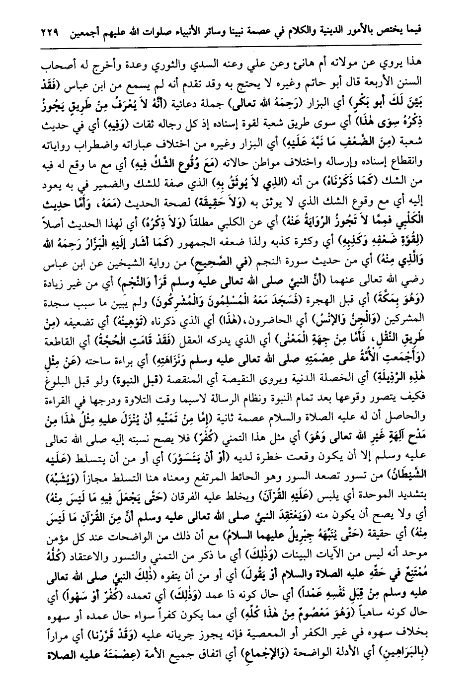 هذا يروي عن مولاته أم هانئ وعن علي وعنه السدي والثوري وعدة وأخرج له أصحاب السنن الأربعة قال أبو حاتم وغيره لا يحتج به وقد تقدم أنه لم يسمع من ابْنِ عَبَّاسٍ (فَقَدْ بَيَّنَ لَكَ أَبُو بَكْرٍ) أي البزار (رحمه الله تعالى) جملة دعائية (أَنَّهُ لَا يُعْرَفُ مِنْ طَرِيقٍ يَجُوزُ ذِكْرُهُ سوى هذا) أي سوى طريق شعبة لقوة إسناده إذ كل رجاله ثقات (وفيه) أي في حديث شعبة (من الضّعف ما نبّه عليه) أي البزار وغيره من اختلاف عباراته واضطراب رواياته وانقطاع إسناده وإرساله واختلاف مواطن حالاته (مع وقوع الشّكّ فيه) أي مع ما وقع له فيه من الشك (كما ذكرناه) من أنه (الذي لا يوثق به) الذي صفة للشك والضمير في به يعود إليه أي مع وقوع الشك الذي لا يوثق به (ولا حقيقة) لصحة الحديث (مَعَهُ، وَأَمَّا حَدِيثُ الْكَلْبِيِّ فَمِمَّا لَا تَجُوزُ الرّواية عنه) أي عن الكلبي مطلقا (ولا ذكره) أي لهذا الحديث أصلا (لقوّة ضعفه وكذبه) أي وكثرة كذبه ولذا ضعفه الجمهور (كَمَا أَشَارَ إِلَيْهِ الْبَزَّارُ رَحِمَهُ اللَّهُ وَالَّذِي منه) أي من حديث سورة النجم (في الصّحيح) من رواية الشيخين عن ابن عباس رضي الله تعالى عنهما (أنّ النبيّ صلى الله تعالى عليه وسلم قرأ والنّجم) أي من غير زيادة (وهو بمكّة) أي قبل الهجرة (فسجد معه المسلمون والمشركون) ولم يبين ما سبب سجدة المشركين (والجنّ والإنس) أي الحاضرون، (هذا) أي الذي ذكرناه (توهينه) أي تضعيفه (مِنْ طَرِيقِ النَّقْلِ، فَأَمَّا مِنْ جِهَةِ الْمَعْنَى) أي الذي يدركه العقل (فقد قامت الحجّة) أي القاطعة (وأجمعت الأمّة على عصمته صلى الله تعالى عليه وسلم ونزاهته) أي براءة ساحته (عن مثل هذه الرّذيلة) أي الخصلة الدنية ويروى النقيصة أي المنقصة (قبل النبوة) ولو قبل البلوغ فكيف يتصور وقوعها بعد تمام النبوة ونظام الرسالة لا سيما وقت التلاوة ودرجها في القراءة والحاصل أن له عليه الصلاة والسلام عصمة ثانية (إِمَّا مِنْ تَمَنِّيهِ أَنْ يَنْزِلَ عَلَيْهِ مِثْلُ هذا من مدح آلهة غير الله تعالى وهو) أي مثل هذا التمني (كفر) فلا يصح نسبته إليه صلى الله تعالى عليه وسلم إلا أن يكون وقعت خطرة لديه (أو أن يتسوّر) أي أو من أن يتسلط (عليه الشّيطان) من تسور تصعد السور وهو الحائط المرتفع ومعناه هنا التسلط مجازا (ويشبّه) بتشديد الموحدة أي يلبس (عليه القرآن) ويخلط عليه الفرقان (حتّى يجعل فيه ما ليس منه) أي ولا يصح أن يكون منه (ويعتقد النبيّ صلى الله تعالى عَلَيْهِ وَسَلَّمَ أَنَّ مِنَ الْقُرْآنِ مَا لَيْسَ منه) أي حقيقة (حتّى ينبّهه جبريل عليهما السلام) مع أن ذلك من الواضحات عند كل مؤمن موحد أنه ليس من الآيات البينات (وذلك) أي ما ذكر من التمني والتسور والاعتقاد (كلّه ممتنع في حقّه عليه الصلاة والسلام أو يقول) أي أو من أن يتفوه (ذلك النبيّ صلى الله تعالى عليه وسلم من قبل نفسه عمدا) أي حال كونه ذا عمد (وذلك) أي تعمده (كفر أو سهوا) أي حال كونه ساهيا (وهو معصوم من هذا كلّه) أي مما يكون كفرا سواء حال عمده أو سهوه بخلاف سهوه في غير الكفر أو المعصية فإنه يجوز جريانه عليه (وقد قرّرنا) أي مرارا (بالبراهين) أي الأدلة الواضحة (والإجماع) أي اتفاق جميع الأمة (عصمته عليه الصلاة