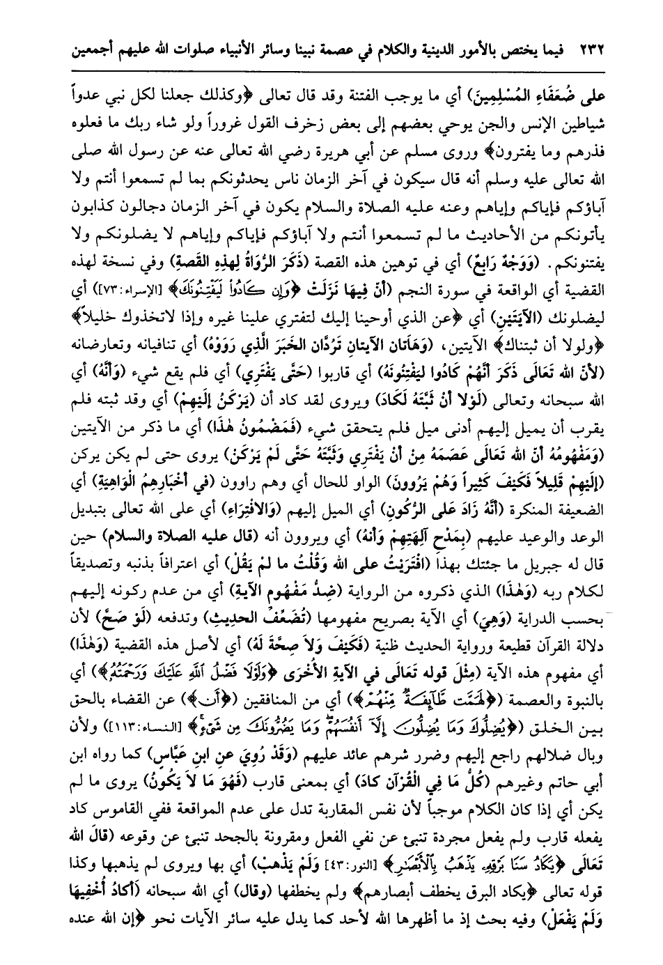 على ضعفاء المسلمين) أي ما يوجب الفتنة وقد قال تعالى وَكَذلِكَ جَعَلْنا لِكُلِّ نَبِيٍّ عَدُوًّا شَياطِينَ الْإِنْسِ وَالْجِنِّ يُوحِي بَعْضُهُمْ إِلى بَعْضٍ زُخْرُفَ الْقَوْلِ غُرُوراً وَلَوْ شاءَ رَبُّكَ ما فَعَلُوهُ فَذَرْهُمْ وَما يَفْتَرُونَ وروى مسلم عن أبي هريرة رضي الله تعالى عنه عَنْ رَسُولِ اللَّهِ صَلَّى اللَّهُ تَعَالَى عَلَيْهِ وسلم أنه قال سيكون في آخر الزمان ناس يحدثونكم بما لم تسمعوا أنتم ولا آباؤكم فإياكم وإياهم وعنه عليه الصلاة والسلام يكون في آخر الزمان دجالون كذابون يأتونكم من الأحاديث ما لم تسمعوا أنتم ولا آباؤكم فإياكم وإياهم لا يضلونكم ولا يفتنونكم. (ووجه رابع) أي في توهين هذه القصة (ذكر الرّواة لهذه القصة) وفي نسخة لهذه القضية أي الواقعة في سورة النجم (أَنَّ فِيهَا نَزَلَتْ وَإِنْ كادُوا لَيَفْتِنُونَكَ [الْإِسْرَاءِ: 73] ) أي ليضونك (الآيتين) أي عَنِ الَّذِي أَوْحَيْنا إِلَيْكَ لِتَفْتَرِيَ عَلَيْنا غَيْرَهُ وَإِذاً لَاتَّخَذُوكَ خَلِيلًا وَلَوْلا أَنْ ثَبَّتْناكَ الْآيَتَيْنِ، (وَهَاتَانِ الْآيَتَانِ تَرُدَّانِ الْخَبَرَ الَّذِي رَوَوْهُ) أي تنافيانه وتعارضانه (لأنّ الله تعالى ذكر أنّهم كادوا ليفتنونه) أي قاربوا (حتّى يفتري) أي فلم يقع شيء (وأنّه) أي الله سبحانه وتعالى (لولا أن ثبّته لكاد) ويروى لقد كان أن (يركن إليهم) أي وقد ثبته فلم يقرب أن يميل إليهم أدنى ميل فلم يتحقق شيء (فمضمون هذا) أي ما ذكر من الآيتين (وَمَفْهُومُهُ أَنَّ اللَّهَ تَعَالَى عَصَمَهُ مِنْ أَنْ يفتري وثبّته حتّى لم يركن) يروى حتى لم يكن يَرْكَنْ (إِلَيْهِمْ قَلِيلًا فَكَيْفَ كَثِيرًا وَهُمْ يَرْوُونَ) الواو للحال أي وهم راوون (في أخبارهم الواهية) أي الضعيفة المنكرة (أنّه زاد على الرّكون) أي الميل إليهم (والافتراء) أي على الله تعالى بتبديل الوعد والوعيد عليهم (بمدح آلهتهم وأنه) أي ويروون أنه (قال عليه الصلاة والسلام) حين قال له جبريل ما جئتك بهذا (افْتَرَيْتُ عَلَى اللَّهِ وَقُلْتُ مَا لَمْ يَقُلْ) أي اعترافا بذنبه وتصديقا لكلام ربه (وهذا) الذي ذكروه من الرواية (ضدّ مفهوم الآية) أي من عدم ركونه إليهم بحسب الدراية (وهي) أي الآية بصريح مفهومها (تضعّف الحديث) وتدفعه (لو صحّ) لأن دلالة القرآن قطيعة ورواية الحديث ظنية (فكيف ولا صحة له) أي لأصل هذه القضية (وهذا) أي مفهوم هذه الآية (مِثْلُ قَوْلِهِ تَعَالَى فِي الْآيَةِ الْأُخْرَى وَلَوْلا فَضْلُ اللَّهِ عَلَيْكَ وَرَحْمَتُهُ