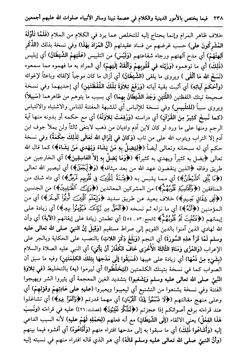 خلاف ظاهر المرام وإنما يحتاج إليه للتخلص عما يرد في الكلام من الملام (فلمّا تأوّله المشركون على) حسب غرضهم من فساد عقيدتهم (أنّ المراد بهذا) وفي نسخة بذلك (الذّكر آلهتهم) أي مدح آلهتهم ورجاء شفاعتهم (ولبّس) من التلبيس (عليهم الشّيطان) أي إبليس (ذلك) أي ما توهموه (وزيّنه في قلوبهم وألقاه إليهم) أي المراد به ما فهموه مما سمعوه (نسخ الله ما ألقى) ويروى ما يلقى (الشّيطان) أي أزال ما كان موجبا لإلقائه وباعثا لإغوائه (وأحكم آياته) أي أثبت بقية آياته (ورفع تلاوة تلك اللّفظتين) أي إحديهما وفي نسخة صحيحة تينك اللفظتين (اللّتين وجد الشّيطان بهما) أي بسبب ما يتوهم من ظاهرهما (سبيلا) ويروى سببا (للتلبيس) وفي نسخة للإلباس أي للشبهة المفتنة للناس والاشتباه والالتباس (كما نسخ كثير من القرآن) أي دراسته (ورفعت تلاوته) أي مع حكمه أو بدونه منها آية الرجم ومنها على ما ورد لو كان لابن آدم واديان من ذهب لابتغى ثالثا ولن يملأ جوف ابن آدم إلا التراب ويتوب الله على من تاب (وَكَانَ فِي إِنْزَالِ اللَّهِ تَعَالَى لِذَلِكَ حِكْمَةٌ) وفي نسخة حكم أي له سبحانه وتعالى أيضا (يُضِلُّ مَنْ يَشاءُ وَيَهْدِي مَنْ يَشاءُ) كما قال الله تعالى يُضِلُّ بِهِ كَثِيراً وَيَهْدِي بِهِ كَثِيراً (وَما يُضِلُّ بِهِ إِلَّا الْفاسِقِينَ) أي الخارجين عن طريق وفاقه الَّذِينَ يَنْقُضُونَ عَهْدَ اللَّهِ مِنْ بَعْدِ مِيثاقِهِ (ولِيَجْعَلَ) أي ليصير الله تعالى (ما يُلْقِي الشَّيْطانُ) أي مما يلبس به (فِتْنَةً لِلَّذِينَ فِي قُلُوبِهِمْ مَرَضٌ) أي داء شك من المنافقين (وَالْقاسِيَةِ قُلُوبُهُمْ) من المشركين المعاندين (وَإِنَّ الظَّالِمِينَ) من الجنسين (لَفِي شِقاقٍ بَعِيدٍ) خلاف بعيد عن طريق سديد وَلِيَعْلَمَ الَّذِينَ أُوتُوا الْعِلْمَ) أي من المؤمنين (أَنَّهُ) أي ما نزله ثم نسخه (الْحَقُّ مِنْ رَبِّكَ فَيُؤْمِنُوا بِهِ) أي زيادة على إيمانهم (فَتُخْبِتَ لَهُ قُلُوبُهُمْ [الحج: 53- 54] ) أي تطمئن زيادة على إيقانهم (الآية) أي وأن الله لهادي الذين آمنوا بالدين القويم إلى صراط مستقيم (وقيل إنّ النبيّ صلى الله تعالى عليه وسلم لمّا قرأ هذه السّورة) أي النجم (وبلغ ذكر اللات) بالنصب على الحكاية وبالجر على الإعراب (وَالْعُزَّى وَمَنَاةَ الثَّالِثَةِ الْأُخْرَى خَافَ الْكُفَّارُ أَنْ يأتي) أي النبي عليه الصلاة والسلام (بشيء من ذمّها) أي زيادة على عيبها (فسبقوا إلى مدحها بتلك الكلمتين) وفيه ما سبق أن الصواب كما في نسخة بتينك الكلمتين (ليخلّطوا) أي ليرموا (به) بالتخليط (في تلاوة النّبيّ صلى الله تعالى عليه وسلم ويشغبوا) بتشديد الغين المعجمة أي يثيروا الشر ويهيجوا الفتنة وفي نسخة يشنعوا من التشنيع أي ليعيبوا ويعيروا (عليه على عادتهم وقولهم) أي وعلى منهج مقالتهم (لا تَسْمَعُوا لِهذَا الْقُرْآنِ) أي مهما قدرتم (وَالْغَوْا فِيهِ) أي تشاغلوا عند قراءته برفع أصواتكم إذا عجزتم (لَعَلَّكُمْ تَغْلِبُونَ [فصلت: 26] ) عليه في قراءته (ونسب هذا الفعل) يعني الالقاء (إلى الشّيطان) مع أنه فعلهم (لحمله لهم عليه) لأنه السبب الداعي إليه (وأشاعوا ذلك) أي ما سبقوا به إلى مدحها افتراء منهم (وأذاعوه) أي أفشوه فيما بينهم (وأنّ النبيّ صلى الله تعالى عليه وسلم قاله) أي هو الذي قاله افتراء منهم في نسبته إليه