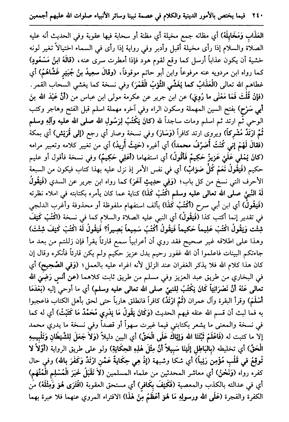 (فإن قلت فما معنى ما روي) عن ابن جرير عن عكرمة مولى ابن عباس مِنْ (أَنَّ عَبْدَ اللَّهِ بْنَ أَبِي سَرْحٍ) بفتح السين المهملة وسكون الراء وفي آخره مهملة اسلم قبل الفتح وهاجر وكتب الوحي ثم ارتد ثم اسلم ومات ساجدا لله (كان يكتب لرسول الله صلى الله عليه وآله وسلم ثمّ ارتدّ مشركا) ويروى ارتد كافرا (وسار) وفي نسخة وصار أي رجع (إلى قريش) أي بمكة (فقال لهم إني كنت أصرف محمدا) أي أغيره (حيث أريد) أي من تغيير كلامه وتعبير مرامه (كان يملي عليّ عزيز حكيم فأقول) أي استفهاما (أعلي حكيم) وفي نسخة فَأَقُولُ أَوْ عَلِيمٌ حَكِيمٌ (فَيَقُولُ نَعَمْ كُلٌّ صواب) أي في نفس الأمر إذ نزل عليه بهذا كتاب فيكون من السبعة الأحرف التي نسخ من كل باب؛ (وفي حديث آخر) كما رواه ابن جرير عن السدي (فيقول له النّبي صلى الله تعالى عليه وسلم اكتب كذا) كناية عما كان يأمره بكتابته في املاء نظرته (فيقول) أي ابن أبي سرح (أكتب كذا) بألف استفهام ملفوظة أو محذوفة وأغرب الدلجي في تقدير إنما أكتب كذا (فيقول) أي النبي عليه الصلاة والسلام كما في نسخة (اكْتُبْ كَيْفَ شِئْتَ وَيَقُولُ اكْتُبْ عَلِيمًا حَكِيمًا فَيَقُولُ أَكْتُبُ سَمِيعًا بَصِيرًا؟ فَيَقُولُ لَهُ اكْتُبْ كيف شئت) وهذا على اطلاقه غير صحيح فقد روي أن أعرابيا سمع قارئا يقرأ فإن زللتم من بعد ما جاءتكم البينات فاعلموا أن الله غفور رحيم بدل عزيز حكيم ولم يكن قارئا فأنكره وقال إن كان هذا كلام الله فلا يذكر الغفران عند الزلل لأنه اغراء عليه بالعمل؛ (وفي الصّحيح) أي في البخاري من طريق عبد العزيز وفي مسلم من طريق ثابت كلاهما (عن أنس رضي الله تعالى عَنْهُ أَنَّ نَصْرَانِيًّا كَانَ يَكْتُبُ لِلنَّبِيِّ صَلَّى الله تعالى عليه وسلم) أي ما أوحي إليه (بعدما أسلم) وقرأ البقرة وآل عمران (ثمّ ارتدّ) كافرا فانطلق هاربا حتى لحق بأهل الكتاب فاعجبوا به فما لبث أن قسم الله عنقه فيهم الحديث (وكان يقول ما يدري محمّد ما كتبت) أي له كما في نسخة والمعنى ما يشعر بكتابتي فيما غيرت سهوا أو قصدا وفي نسخة مَا يَدْرِي مُحَمَّدٌ إِلَّا مَا كَتَبْتُ لَهُ (فاعلم ثبّتنا الله وإيّاك على الحقّ) أي البين دليلا (ولا جعل للشّيطان وتلبيسه الحقّ) أي تخليطه (بِالْبَاطِلِ إِلَيْنَا سَبِيلًا أَنَّ مِثْلَ هَذِهِ الْحِكَايَةِ) ولو على طريق الرواية (أَوَّلًا لَا تُوقِعُ فِي قَلْبِ مُؤْمِنٍ رَيْبًا) أي شكا وشبهة (إِذْ هِيَ حِكَايَةٌ عَمَّنِ ارْتَدَّ وَكَفَرَ بِاللَّهِ) وفي حال كفره رواه (ونحن) أي معاشر المحدثين من علماء المسلمين (لا نقبل خبر المسلم المتّهم) أي في عدالته بالكذب والمعصية (فكيف بكافر) أي مستحق العقوبة (افترى هو ومثله) من الكفرة والفجرة (على الله ورسوله ما هو أعظم من هذا) الافتراء المروي عنهما فلا عبرة بهما