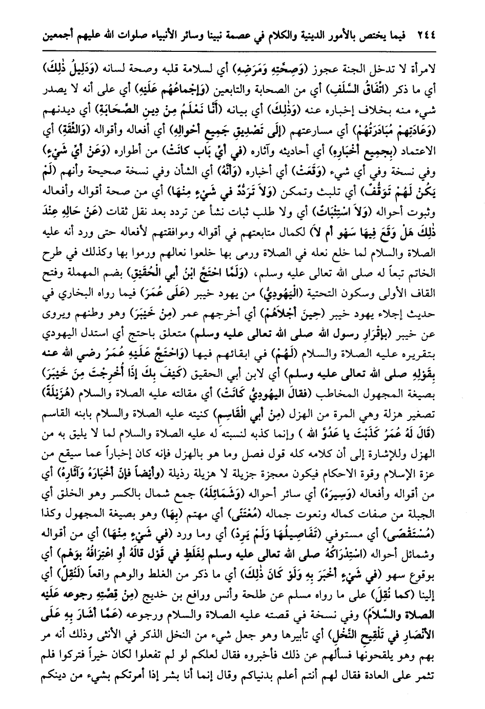 لامرأة لا تدخل الجنة عجوز (وصحّته ومرضه) أي لسلامة قلبه وصحة لسانه (ودليل ذلك) أي ما ذكر (اتّفاق السّلف) أي من الصحابة والتابعين (وإجماعهم عليه) أي على أنه لا يصدر شيء منه بخلاف إخباره عنه (وذلك) أي بيانه (أنّا نعلم من دين الصّحابة) أي ديدنهم (وعادتهم مبادرتهم) أي مسارعتهم (إلى تصديق جميع أحواله) أي أفعاله وأقواله (والثّقة) أي الاعتماد (بجميع أخباره) أي أحاديثه وآثاره (في أيّ باب كانت) من أطواره (وعن أيّ شيء) وفي نسخة وفي أي شيء (وقعت) أي أخباره (وأنّه) أي الشأن وفي نسخة صحيحة وأنهم (لم يكن لهم توقّف) أي تلبث وتمكن (ولا تردّد في شيء منها) أي من صحة أقواله وأفعاله وثبوت أحواله (ولا استثبات) أي ولا طلب ثبات نشأ عن تردد بعد نقل ثقات (عَنْ حَالِهِ عِنْدَ ذَلِكَ هَلْ وَقَعَ فِيهَا سهو أم لا) لكمال متابعتهم في أقواله وموافقتهم لأفعاله حتى ورد أنه عليه الصلاة والسلام لما خلع نعله في الصلاة ورمى بها خلعوا نعالهم ورموا بها وكذلك في طرح الخاتم تبعا له صلى الله تعالى عليه وسلم، (ولمّا احتجّ ابن أبي الحقيق) بضم المهملة وفتح القاف الأولى وسكون التحتية (اليهوديّ) من يهود خيبر (على عمر) فيما رواه البخاري في حديث إجلاء يهود خيبر (حين أجلاهم) أي أخرجهم عمر (من خيبر) وهو وطنهم ويروى عن خيبر (بإقرار رسول الله صلى الله تعالى عليه وسلم) متعلق باحتج أي استدل اليهودي بتقريره عليه الصلاة والسلام (لهم) في ابقائهم فيها (وَاحْتَجَّ عَلَيْهِ عُمَرُ رَضِيَ اللَّهُ عَنْهُ بِقَوْلِهِ صلى الله تعالى عليه وسلم) أي لابن أبي الحقيق (كيف بك إذا أخرجت من خيبر) بصيغة المجهول المخاطب (فقال اليهوديّ كانت) أي مقالته عليه الصلاة والسلام (هزيلة) تصغير هزلة وهي المرة من الهزل (من أبي القاسم) كنيته عليه الصلاة والسلام بابنه القاسم (قال له عمر كذبت يا عدوّ الله) وإنما كذبه لنسبته له عليه الصلاة والسلام لما لا يليق به من الهزل وللإشارة إلى أن كلامه كله قول فصل وما هو بالهزل فإنه كان إخبارا عما سيقع من عزة الإسلام وقوة الاحكام فيكون معجزة جزيلة لا هزيلة رذيلة (وأيضا فإنّ أخباره وآثاره) أي من أقواله وأفعاله (وسيره) أي سائر أحواله (وشمائله) جمع شمال بالكسر وهو الخلق أي الجبلة من صفات كماله ونعوت جماله (معتنّى) أي مهتم (بها) وهو بصيغة المجهول وكذا (مستقصى) أي مستوفي (تفاصيلها ولم يرد) أي وما ورد (في شيء منها) أي من أقواله وشمائل أحواله (استدراكه صلى الله تعالى عَلَيْهِ وَسَلَّمَ لِغَلَطٍ فِي قَوْلٍ قَالَهُ أَوِ اعترافه بوهم) أي بوقوع سهو (فِي شَيْءٍ أَخْبَرَ بِهِ وَلَوْ كَانَ ذَلِكَ) أي ما ذكر من الغلط والوهم واقعا (لنقل) أي إلينا (كما نقل) على ما رواه مسلم عن طلحة وأنس ورافع بن خديج (من قصّته رجوعه عليه الصلاة والسّلام) وفي نسخة في قصته عليه الصلاة والسلام ورجوعه (عَمَّا أَشَارَ بِهِ عَلَى الْأَنْصَارِ فِي تَلْقِيحِ النّخل) أي تأبيرها وهو جعل شيء من النخل الذكر في الأنثى وذلك أنه مر بهم وهو يلقحونها فسألهم عن ذلك فأخبروه فقال لعلكم لو لم تفعلوا لكان خيرا فتركوا فلم تثمر على العادة فقال لهم أنتم أعلم بدنياكم وقال إِنَّمَا أَنَا بَشَرٌ إِذَا أَمَرْتُكُمْ بِشَيْءٍ مِنْ دينكم