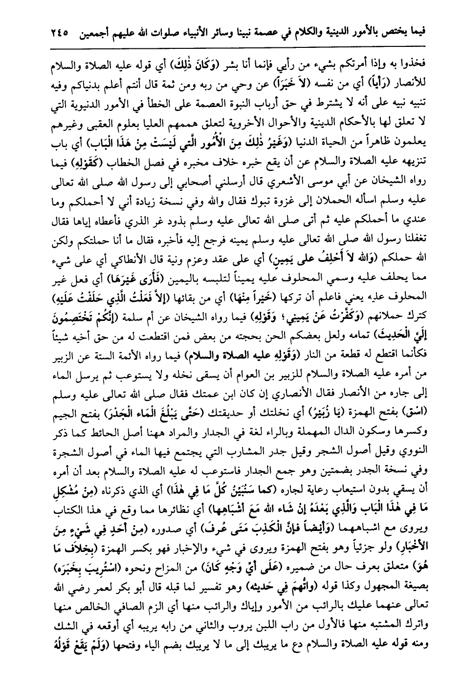 فَخُذُوا بِهِ وَإِذَا أَمَرْتُكُمْ بِشَيْءٍ مِنْ رَأْيِي فإنما أنا بشر (وكان ذلك) أي قوله عليه الصلاة والسلام للأنصار (رأيا) أي من نفسه (لا خبرا) عن وحي من ربه ومن ثمة قال أنتم أعلم بدنياكم وفيه تنبيه نبيه على أنه لا يشترط في حق أرباب النبوة العصمة على الخطأ في الأمور الدنيوية التي لا تعلق لها بالأحكام الدينية والأحوال الأخروية لتعلق هممهم العليا بعلوم العقبى وغيرهم يعلمون ظاهرا من الحياة الدنيا (وَغَيْرُ ذَلِكَ مِنَ الْأُمُورِ الَّتِي لَيْسَتْ مِنْ هذا الباب) أي باب تنزيهه عليه الصلاة والسلام عن أن يقع خبره خلاف مخبره في فصل الخطاب (كقوله) فيما رواه الشيخان عن أبي موسى الأشعري قال أرسلني أصحابي إلى رسول الله صلى الله تعالى عليه وسلم اسأله الحملان إلى غزوة تبوك فقال والله وفي نسخة زيادة أني لا أحملكم وما عندي ما أحملكم عليه ثم أتى صلى الله تعالى عليه وسلم بذود غر الذري فأعطاه إياها فقال تغفلنا رسول الله صلى الله تعالى عليه وسلم يمينه فرجع إليه فأخبره فقال ما أنا حملتكم ولكن الله حملكم (والله لا أحلف على يمين) أي على عقد وعزم ونية قال الأنطاكي أي على شيء مما يحلف عليه وسمي المحلوف عليه يمينا لتلبسه باليمين (فأرى غيرها) أي فعل غير المحلوف عليه يعني فاعلم أن تركها (خيرا منها) أي من بقائها (إلّا فعلت الّذي حلفت عليه) كترك حملانهم (وكفّرت عن يميني؛ وقوله) فيما رواه الشيخان عن أم سلمة (إنّكم تختصمون إليّ الحديث) تمامه ولعل بعضكم الحن بحجته من بعض فمن اقتطعت له من حق أخيه شيئا فكأنما اقتطع له قطعة من النار (وقوله عليه الصلاة والسلام) فيما رواه الأئمة الستة عن الزبير من أمره عليه الصلاة والسلام للزبير بن العوام أن يسقى نخله ولا يستوعب ثم يرسل الماء إلى جاره من الأنصار فقال الأنصاري إن كان ابن عمتك فقال صلى الله تعالى عليه وسلم (اسق) بفتح الهمزة (يا زبير) أي نخلتك أو حديقتك (حتّى يبلغ الماء الجدر) بفتح الجيم وكسرها وسكون الدال المهملة وبالراء لغة في الجدار والمراد ههنا أصل الحائط كما ذكر النووي وقيل أصول الشجر وقيل جدر المشارب التي يجتمع فيها الماء في أصول الشجرة وفي نسخة الجدر بضمتين وهو جمع الجدار فاستوعب له عليه الصلاة والسلام بعد أن أمره أن يسقي بدون استيعاب رعاية لجاره (كما سنبيّن كلّ ما في هذا) أي الذي ذكرناه (مِنْ مُشْكِلِ مَا فِي هَذَا الْبَابِ وَالَّذِي بعده إن شاء الله مع أشباهها) أي نظائرها مما وقع في هذا الكتاب ويروى مَعَ أَشْبَاهِهِمَا (وَأَيْضًا فَإِنَّ الْكَذِبَ مَتَى عُرِفَ) أي صدوره (من أحد في شيء من الأخبار) ولو جزئيا وهو بفتح الهمزة ويروى في شيء والإخبار فهو بكسر الهمزة (بخلاف ما هو) متعلق بعرف حال من ضميره (على أيّ وجه كان) من المزاح ونحوه (استريب بخبره) بصيغة المجهول وكذا قوله (واتّهم في حديثه) وهو تفسير لما قبله قال أبو بكر لعمر رضي الله تعالى عنهما عليك بالرائب من الأمور وإياك والرائب منها أي الزم الصافي الخالص منها واترك المشتبه منها فالأول من راب اللبن يروب والثاني من رابه يريبه أي أوقعه في الشك ومنه قوله عليه الصلاة والسلام دع ما يريبك إلى ما لا يريبك بضم الياء وفتحها (ولم يقع قوله