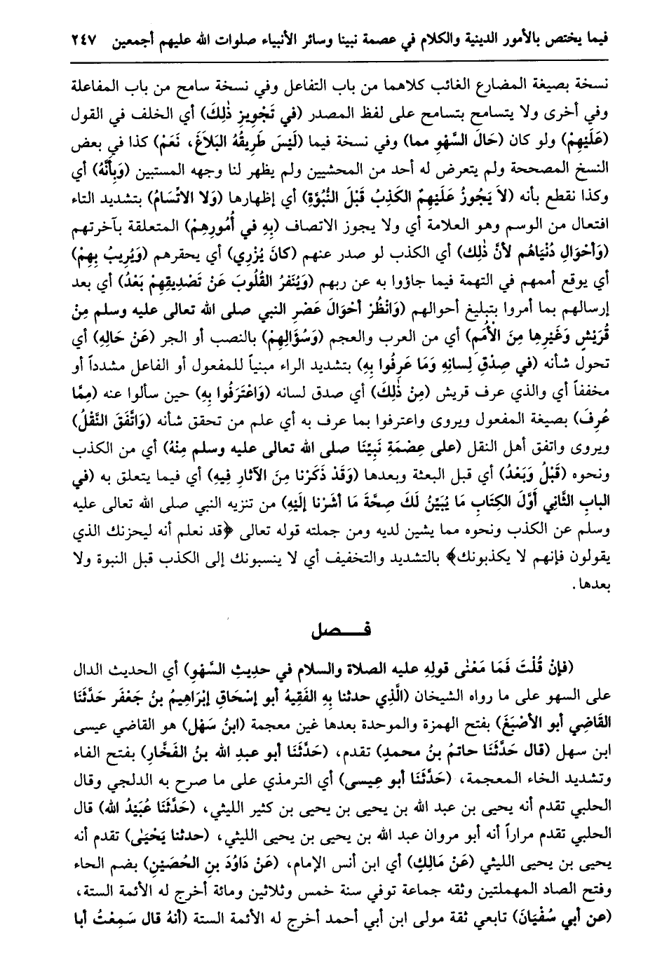 نسخة بصيغة المضارع الغائب كلاهما من باب التفاعل وفي نسخة سامح من باب المفاعلة وفي أخرى ولا يتسامح بتسامح على لفظ المصدر (في تجويز ذلك) أي الخلف في القول (عليهم) ولو كان (حال السّهو مما) وفي نسخة فيما (ليس طريقه البلاغ، نعم) كذا في بعض النسخ المصححة ولم يتعرض له أحد من المحشيين ولم يظهر لنا وجهه المستبين (وبأنّه) أي وكذا نقطع بأنه (لا يجوز عليهم الكذب قبل النّبوّة) أي إظهارها (ولا الاتّسام) بتشديد التاء افتعال من الوسم وهو العلامة أي ولا يجوز الاتصاف (به في أمورهم) المتعلقة بآخرتهم (وأحوال دنياهم لأنّ ذلك) أي الكذب لو صدر عنهم (كان يزري) أي يحقرهم (ويريب بهم) أي يوقع أممهم في التهمة فيما جاؤوا به عن ربهم (وينفر القلوب عن تصديقهم بعد) أي بعد إرسالهم بما أمروا بتبليغ أحوالهم (وانظر أحوال عصر النبي صلى الله تعالى عَلَيْهِ وَسَلَّمَ مِنْ قُرَيْشٍ وَغَيْرِهَا مِنَ الْأُمَمِ) أي من العرب والعجم (وسؤالهم) بالنصب أو الجر (عن حاله) أي تحول شأنه (في صدق لسانه وما عرفوا به) بتشديد الراء مبنيا للمفعول أو الفاعل مشددا أو مخففا أي والذي عرف قريش (من ذلك) أي صدق لسانه (واعترفوا به) حين سألوا عنه (ممّا عرف) بصيغة المفعول ويروى واعترفوا بما عرف به أي علم من تحقق شأنه (واتّفق النّقل) ويروى واتفق أهل النقل (على عصمة نبيّنا صلى الله تعالى عليه وسلم منه) أي من الكذب ونحوه (قبل وبعد) أي قبل البعثة وبعدها (وقد ذكرنا من الآثار فيه) أي فيما يتعلق به (فِي الْبَابِ الثَّانِي أَوَّلَ الْكِتَابِ مَا يُبَيِّنُ لك صحّة ما أشرنا إليه) من تنزيه النبي صلى الله تعالى عليه وسلم عن الكذب ونحوه مما يشين لديه ومن جملته قَوْلُهُ تَعَالَى قَدْ نَعْلَمُ إِنَّهُ لَيَحْزُنُكَ الَّذِي يَقُولُونَ فَإِنَّهُمْ لا يُكَذِّبُونَكَ بالتشديد والتخفيف أي لا ينسبونك إلى الكذب قبل النبوة ولا بعدها.