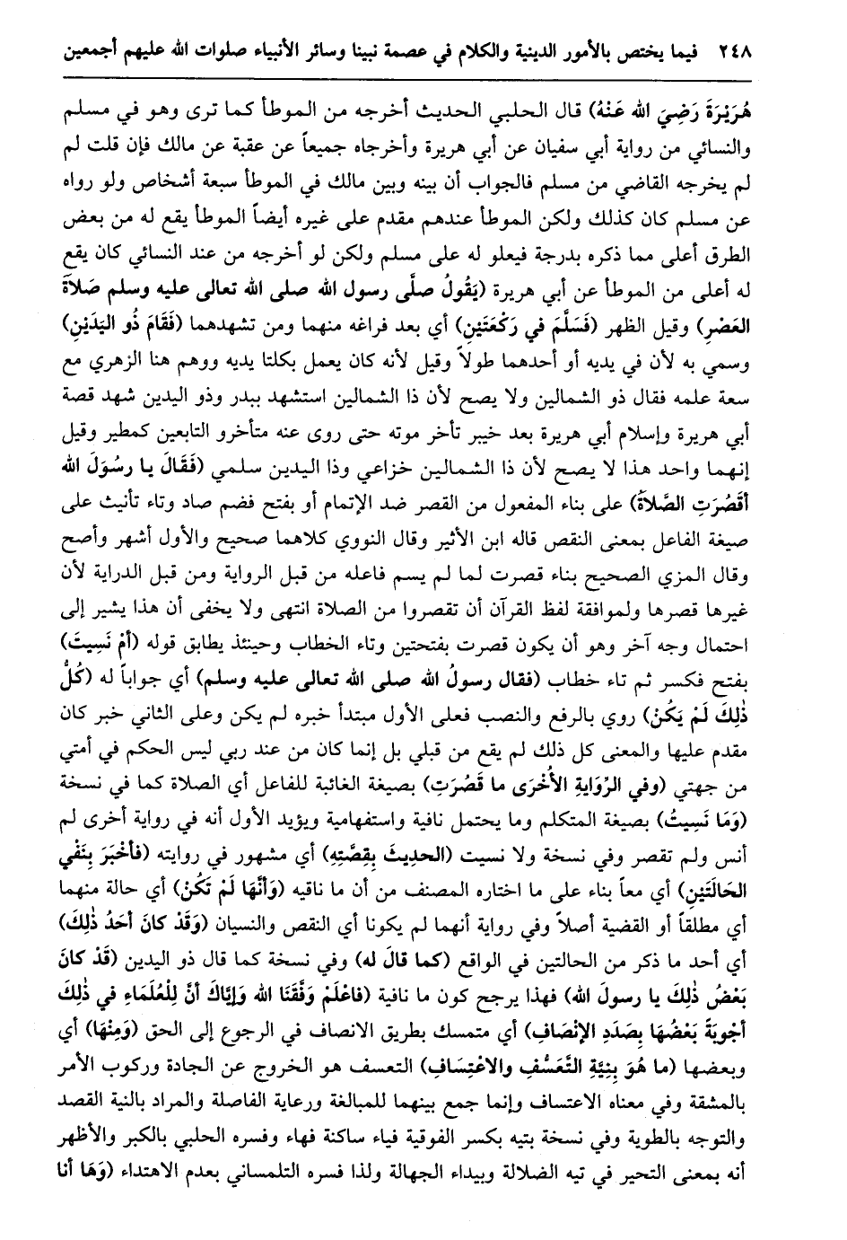 هريرة رضي الله عنه) قال الحلبي الحديث أخرجه من الموطأ كما ترى وهو في مسلم والنسائي من رواية أبي سفيان عن أبي هريرة وأخرجاه جميعا عن عقبة عن مالك فإن قلت لم لم يخرجه القاضي من مسلم فالجواب أن بينه وبين مالك في الموطأ سبعة أشخاص ولو رواه عن مسلم كان كذلك ولكن الموطأ عندهم مقدم على غيره أيضا الموطأ يقع له من بعض الطرق أعلى مما ذكره بدرجة فيعلو له على مسلم ولكن لو أخرجه من عند النسائي كان يقع له أعلى من الموطأ عن أبي هريرة (يقول صلّى رسول الله صلى الله تعالى عليه وسلم صلاة العصر) وقيل الظهر (فسلّم في ركعتين) أي بعد فراغه منهما ومن تشهدهما (فقام ذو اليدين) وسمي به لأن في يديه أو أحدهما طولا وقيل لأنه كان يعمل بكلتا يديه ووهم هنا الزهري مع سعة علمه فقال ذو الشمالين ولا يصح لأن ذا الشمالين استشهد ببدر وذو اليدين شهد قصة أبي هريرة وإسلام أبي هريرة بعد خيبر تأخر موته حتى روى عنه متأخرو التابعين كمطير وقيل إنهما واحد هذا لا يصح لأن ذا الشمالين خزاعي وذا اليدين سلمي (فقال يا رسول الله أقصرت الصّلاة) على بناء المفعول من القصر ضد الإتمام أو بفتح فضم صاد وتاء تأنيث على صيغة الفاعل بمعنى النقص قاله ابن الأثير وقال النووي كلاهما صحيح والأول أشهر وأصح وقال المزي الصحيح بناء قصرت لما لم يسم فاعله من قبل الرواية ومن قبل الدراية لأن غيرها قصرها ولموافقة لفظ القرآن أن تقصروا من الصلاة انتهى ولا يخفى أن هذا يشير إلى احتمال وجه آخر وهو أن يكون قصرت بفتحتين وتاء الخطاب وحينئذ يطابق قوله (أم نسيت) بفتح فكسر ثم تاء خطاب (فقال رسول الله صلى الله تعالى عليه وسلم) أي جوابا له (كلّ ذلك لم يكن) روي بالرفع والنصب فعلى الأول مبتدأ خبره لم يكن وعلى الثاني خبر كان مقدم عليها والمعنى كل ذلك لم يقع من قبلي بل إنما كان من عند ربي ليس الحكم في أمتي من جهتي (وفي الرّواية الأخرى ما قصرت) بصيغة الغائبة للفاعل أي الصلاة كما في نسخة (وما نسيت) بصيغة المتكلم وما يحتمل نافية واستفهامية ويؤيد الأول أنه في رواية أخرى لم أنس ولم تقصر وفي نسخة ولا نسيت (الحديث بقصّته) أي مشهور في روايته (فأخبر بنفي الحالتين) أي معا بناء على ما اختاره المصنف من أن ما ناقيه (وأنّها لم تكن) أي حالة منهما أي مطلقا أو القضية أصلا وفي رواية أنهما لم يكونا أي النقص والنسيان (وقد كان أحد ذلك) أي أحد ما ذكر من الحالتين في الواقع (كما قال له) وفي نسخة كَمَا قَالَ ذُو الْيَدَيْنِ (قَدْ كَانَ بَعْضُ ذلك يا رسول الله) فهذا يرجح كون ما نافية (فَاعْلَمْ وَفَّقَنَا اللَّهُ وَإِيَّاكَ أَنَّ لِلْعُلَمَاءِ فِي ذلك أجوبة بعضها بصدد الإنصاف) أي متمسك بطريق الانصاف في الرجوع إلى الحق (ومنها) أي وبعضها (ما هو بنيّة التّعسّف والاعتساف) التعسف هو الخروج عن الجادة وركوب الأمر بالمشقة وفي معناه الاعتساف وإنما جمع بينهما للمبالغة ورعاية الفاصلة والمراد بالنية القصد والتوجه بالطوية وفي نسخة بتيه بكسر الفوقية فياء ساكنة فهاء وفسره الحلبي بالكبر والأظهر أنه بمعنى التحير في تيه الضلالة وبيداء الجهالة ولذا فسره التلمساني بعدم الاهتداء (وها أنا