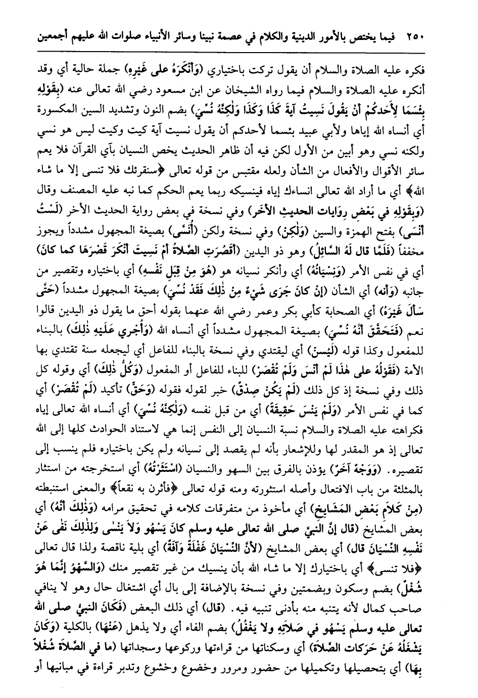 فكره عليه الصلاة والسلام أن يقول تركت باختياري (وأنكره على غيره) جملة حالية أي وقد أنكره عليه الصلاة والسلام فيما رواه الشيخان عن ابن مسعود رضي الله تعالى عنه (بقوله بِئْسَمَا لِأَحَدِكُمْ أَنْ يَقُولَ نَسِيتُ آيَةَ كَذَا وكذا ولكنّه نسّي) بضم النون وتشديد السين المكسورة أي أنساه الله إياها ولأبي عبيد بئسما لأحدكم أن يقول نسيت آية كيت وكيت ليس هو نسي ولكنه نسي وهو أبين من الأول لكن فيه أن ظاهر الحديث يخص النسيان بآي القرآن فلا يعم سائر الأقوال والأفعال من الشأن ولعله مقتبس من قوله تعالى سَنُقْرِئُكَ فَلا تَنْسى إِلَّا ما شاءَ اللَّهُ أي ما أراد الله تعالى انساءك إياه فينسيكه ربما يعم الحكم كما نبه عليه المصنف وقال (وبقوله في بعض روايات الحديث الأخر) وفي نسخة في بعض رواية الحديث الأخر (لست أنسى) بفتح الهمزة والسين (ولكن) وفي نسخة ولكن (أنسّى) بصيغة المجهول مشددا ويجوز مخففا (فلمّا قال له السّائل) وهو ذو اليدين (أَقْصُرَتِ الصَّلَاةُ أَمْ نَسِيتَ أَنْكَرَ قَصْرَهَا كَمَا كان) أي في نفس الأمر (ونسيانه) أي وأنكر نسيانه هو (هو من قبل نفسه) أي باختياره وتقصير من جانبه (وأنه) أي الشأن (إِنْ كَانَ جَرَى شَيْءٌ مِنْ ذَلِكَ فَقَدْ نسّي) بصيغة المجهول مشددا (حتّى سأل غيره) أي الصحابة كأبي بكر وعمر رضي الله عنهما بقوله أحق ما يقول ذو اليدين قالوا نعم (فتحقّق أنّه نسّي) بصيغة المجهول مشددا أي أنساه الله (وأجري عليه ذلك) بالبناء للمفعول وكذا قوله (ليسنّ) أي ليقتدي وفي نسخة بالبناء للفاعل أي ليجعله سنة تقتدي بها الأمة (فَقَوْلُهُ عَلَى هَذَا لَمْ أَنْسَ وَلَمْ تَقْصُرْ) للبناء للفاعل أو المفعول (وكلّ ذلك) أي وقوله كل ذلك وفي نسخة إذ كل ذلك (لم يكن صدق) خبر لقوله فقوله (وحقّ) تأكيد (لم تقصر) أي كما في نفس الأمر (ولم ينس حقيقة) أي من قبل نفسه (ولكنّه نسّي) أي أنساه الله تعالى إياه فكراهته عليه الصلاة والسلام نسبة النسيان إلى النفس إنما هي لاستناد الحوادث كلها إلى الله تعالى إذ هو المقدر لها وللإشعار بأنه لم يقصد إلى نسيانه ولم يكن باختياره فلم ينسب إلى تقصيره. (ووجه آخر) يؤذن بالفرق بين السهو والنسيان (استثرته) أي استخرجته من استثار بالمثلثة من باب الافتعال وأصله استثورته ومنه قوله تعالى فَأَثَرْنَ بِهِ نَقْعاً والمعنى استنبطته (من كلام بعض المشايخ) أي مأخوذ من متفرقات كلامه في تحقيق مرامه (وذلك أنّه) أي بعض المشايخ (قال إنّ النبيّ صلى الله تعالى عَلَيْهِ وَسَلَّمَ كَانَ يَسْهُو وَلَا يَنْسَى وَلِذَلِكَ نفى عن نفسه النّسيان قال) أي بعض المشايخ (لأنّ النّسيان غفلة وآفة) أي بلية ناقصة ولذا قال تعالى فَلا تَنْسى أي باختيارك إلا ما شاء الله بأن ينسيك من غير تقصير منك (والسّهو إنّما هو شغل) بضم وسكون وبضمتين وفي نسخة بالإضافة إلى بال أي اشتغال حال وهو لا ينافي صاحب كمال لأنه يتنبه منه بأدنى تنبيه فيه. (قال) أي ذلك البعض (فكان النبيّ صلى الله تعالى عَلَيْهِ وَسَلَّمَ يَسْهُو فِي صِلَاتِهِ وَلَا يَغْفَلُ) بضم الفاء أي ولا يذهل (عنها) بالكلية (وكان يشغله عن حركات الصّلاة) أي وسكناتها من قراءتها وركوعها وسجداتها (ما في الصّلاة شغلا بها) أي بتحصيلها وتكميلها من حضور ومرور وخضوع وخشوع وتدبر قراءة في مبانيها أو