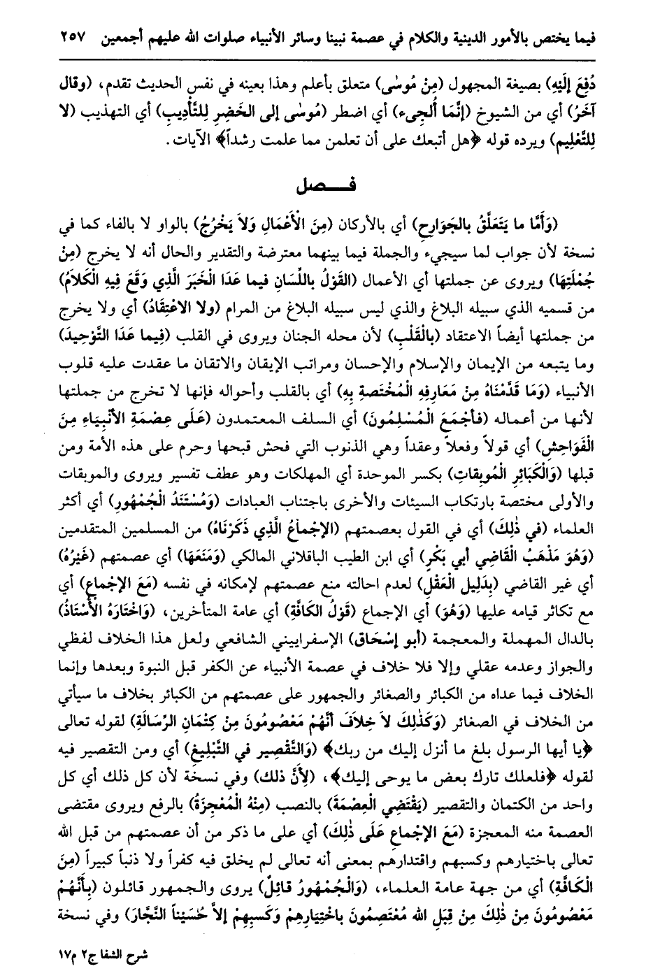 أي بالأركان (من الأعمال ولا يخرج) بالواو لا بالفاء كما في نسخة لأن جواب لما سيجيء والجملة فيما بينهما معترضة والتقدير والحال أنه لا يخرج (من جملتها) ويروى عن جملتها أي الأعمال (الْقَوْلُ بِاللِّسَانِ فِيمَا عَدَا الْخَبَرَ الَّذِي وَقَعَ فيه الكلام) من قسميه الذي سبيله البلاغ والذي ليس سبيله البلاغ من المرام (ولا الاعتقاد) أي ولا يخرج من جملتها أيضا الاعتقاد (بالقلب) لأن محله الجنان ويروى في القلب (فيما عدا التّوحيد) وما يتبعه من الإيمان والإسلام والإحسان ومراتب الإيقان والاتقان ما عقدت عليه قلوب الأنبياء (وما قدّمناه من معارفه المختصة به) أي بالقلب وأحواله فإنها لا تخرج من جملتها لأنها من أعماله (فأجمع المسلمون) أي السلف المعتمدون (على عصمة الأنبياء من الفواحش) أي قولا وفعلا وعقدا وهي الذنوب التي فحش قبحها وحرم على هذه الأمة ومن قبلها (والكبائر الموبقات) بكسر الموحدة أي المهلكات وهو عطف تفسير ويروى والموبقات والأولى مختصة بارتكاب السيئات والأخرى باجتناب العبادات (ومستند الجمهور) أي أكثر العلماء (في ذلك) أي في القول بعصمتهم (الإجماع الّذي ذكرناه) من المسلمين المتقدمين (وهو مذهب القاضي أبي بكر) أي ابن الطيب الباقلاني المالكي (ومنعها) أي عصمتهم (غيره) أي غير القاضي (بدليل العقل) لعدم احالته منع عصمتهم لإمكانه في نفسه (مع الإجماع) أي مع تكاثر قيامه عليها (وهو) أي الإجماع (قول الكافّة) أي عامة المتأخرين، (واختاره الأستاذ) بالدال المهملة والمعجمة (أبو إسحاق) الإسفراييني الشافعي ولعل هذا الخلاف لفظي والجواز وعدمه عقلي وإلا فلا خلاف في عصمة الأنبياء عن الكفر قبل النبوة وبعدها وإنما الخلاف فيما عداه من الكبائر والصغائر والجمهور على عصمتهم من الكبائر بخلاف ما سيأتي من الخلاف في الصغائر (وَكَذَلِكَ لَا خِلَافَ أَنَّهُمْ مَعْصُومُونَ مِنْ كِتْمَانِ الرّسالة) لقوله تعالى يا أَيُّهَا الرَّسُولُ بَلِّغْ ما أُنْزِلَ إِلَيْكَ مِنْ رَبِّكَ (والتّقصير في التّبليغ) أي ومن التقصير فيه لقوله فَلَعَلَّكَ تارِكٌ بَعْضَ ما يُوحى إِلَيْكَ، (لأنّ ذلك) وفي نسخة لأن كل ذلك أي كل واحد من الكتمان والتقصير (يقتضي العصمة) بالنصب (منه المعجزة) بالرفع ويروى مقتضى الْعِصْمَةَ مِنْهُ الْمُعْجِزَةُ (مَعَ الْإِجْمَاعِ عَلَى ذَلِكَ) أي على ما ذكر من أن عصمتهم من قبل الله تعالى باختيارهم وكسبهم واقتدارهم بمعنى أنه تعالى لم يخلق فيه كفرا ولا ذنبا كبيرا (من الكافّة) أي من جهة عامة العلماء، (والجمهور قائل) يروى وَالْجُمْهُورُ قَائِلُونَ (بِأَنَّهُمْ مَعْصُومُونَ مِنْ ذَلِكَ مِنْ قِبَلِ اللَّهِ مُعْتَصِمُونَ بِاخْتِيَارِهِمْ وَكَسْبِهِمْ إِلَّا حُسَيْنًا النّجّار) وفي نسخة