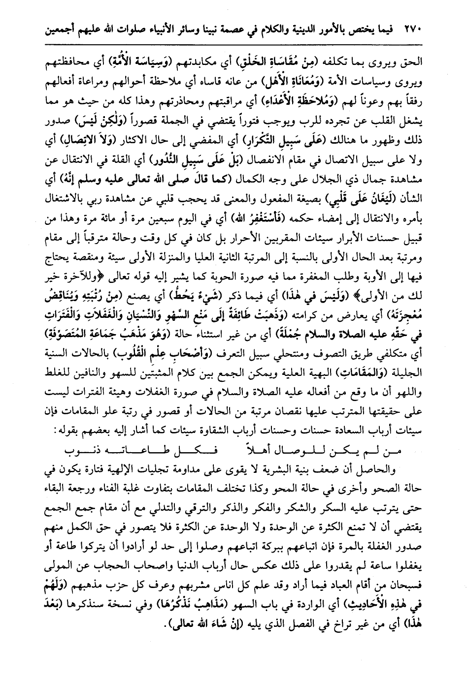 الحق ويروى بما تكلفه (من مقاساة الخلق) أي مكابدتهم (وسياسة الأمّة) أي محافظتهم ويروى وسياسات الأمة (ومعاناة الأهل) من عانه قاساه أي ملاحظة أحوالهم ومراعاة أفعالهم رفقا بهم وعونا لهم (وملاحظة الأعداء) أي مراقبتهم ومحاذرتهم وهذا كله من حيث هو مما يشغل القلب عن تجرده للرب ويوجب فتورا يقتضي في الجملة قصورا (ولكن ليس) صدور ذلك وظهور ما هنالك (على سبيل التّكرار) أي المفضي إلى حال الاكثار (ولا الاتصال) أي ولا على سبيل الاتصال في مقام الانفصال (بل على سبيل النّدور) أي القلة في الانتقال عن مشاهدة جمال ذي الجلال على وجه الكمال (كما قال صلى الله تعالى عليه وسلم إنّه) أي الشأن (ليغان على قلبي) بصيغة المفعول والمعنى قد يحجب قلبي عن مشاهدة ربي بالاشتغال بأمره والانتقال إلى إمضاء حكمه (فأستغفر الله) أي في اليوم سبعين مرة أو مائة مرة وهذا من قبيل حسنات الأبرار سيئات المقربين الأحرار بل كان في كل وقت وحالة مترقبا إلى مقام ومرتبة بعد الحال الأولى بالنسبة إلى المرتبة الثانية العليا والمنزلة الأولى سيئة ومنقصة يحتاج فيها إلى الأوبة وطلب المغفرة مما فيه صورة الحوبة كما يشير إليه قَوْلُهُ تَعَالَى وَلَلْآخِرَةُ خَيْرٌ لَكَ مِنَ الْأُولى (وليس في هذا) أي فيما ذكر (شيء يحطّ) أي يصنع (من رتبته ويناقض معجزته) أي يعارض من كرامته (وَذَهَبَتْ طَائِفَةٌ إِلَى مَنْعِ السَّهْوِ وَالنِّسْيَانِ وَالْغَفَلَاتِ والفترات في حقّه عليه الصلاة والسلام جملة) أي من غير استثناء حالة (وهو مذهب جماعة المتصوّفة) أي متكلفي طريق التصوف ومنتحلي سبيل التعرف (وأصحاب علم القلوب) بالحالات السنية الجليلة (والمقامات) البهية العلية ويمكن الجمع بين كلام المثبتين للسهو والنافين للغلط واللهو أن ما وقع من أفعاله عليه الصلاة والسلام في صورة الغفلات وهيئة الفترات ليست على حقيقتها المترتب عليها نقصان مرتبة من الحالات أو قصور في رتبة علو المقامات فإن سيئات أرباب السعادة حسنات وحسنات أرباب الشقاوة سيئات كما أشار إليه بعضهم بقوله: