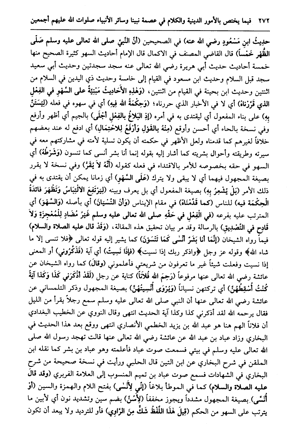 حديث ابن مسعود رضي الله عنه) في الصحيحين (أنّ النّبيّ صلى الله تعالى عليه وسلم صلّى الظّهر خمسا) قال القاضي المصنف في الاكمال قال الإمام أحاديث السهو كثيرة الصحيح منها خمسة أحاديث حديث أبي هريرة رضي الله تعالى عنه سجد سجدتين وحديث أبي سعيد سجد قبل السلام وحديث ابن مسعود في القيام إلى خامسة وحديث ذي اليدين في السلام من اثنتين وحديث ابن بحينة في القيام من اثنتين، (وَهَذِهِ الْأَحَادِيثُ مَبْنِيَّةٌ عَلَى السَّهْوِ فِي الْفِعْلِ الذي قرّرناه) أي لا في الأخبار الذي حررناه؛ (وحكمة الله فيه) أي في سهوه في فعله (ليستنّ به) على بناء المفعول أي ليقتدى به في أمره (إذ البلاغ بالفعل أجلى) بالجيم أي أظهر وأرفع وفي نسخة بالحاء أي أحسن وأوقع (منه بالقول وأرفع للاحتمال) أي ادفع له عند بعضهم خلافا لغيرهم كما قدمناه ولعل الأظهر في حكمته أن يكون تسلية لأمته في مشاركتهم معه في سيرته وطريقته وأحوال بشريته كما أشار إليه بقوله إنما أنا بشر أنسى كما تنسون (وشرطه) أي السهو في حقه بخصوصه للأمر بالاقتداء في فعله كقوله (أنّه لا يقرّ) وفي نسخة لا يقرر بصيغة المجهول فيهما أي لا يبقى ولا يترك (على السّهو) أي زمانا يمكن أن يقتدى به في ذلك الأمر (بل يشعر به) بصيغة المفعول أي بل يعرف وبينه (ليرتفع الالتباس وتظهر فائدة الحكمة فيه) للناس (كما قدّمناه) في مقام الإيناس (وأن النّسيان) أي بأصله (والسّهو) أي المترتب عليه بفرعه (في الفعل في حقّه صلى الله تعالى عَلَيْهِ وَسَلَّمَ غَيْرُ مُضَادٍّ لِلْمُعْجِزَةِ وَلَا قَادِحٍ في التّصديق) بالرسالة وقد مر بيان تحقيق هذه المقالة، (وقد قال عليه الصلاة والسلام) فيما رواه الشيخان (إنّما أنا بشر أنسى كما تنسون) كما يشير إليه قوله تعالى فَلا تَنْسى إِلَّا ما شاءَ اللَّهُ وقوله عز وجل وَاذْكُرْ رَبَّكَ إِذا نَسِيتَ (فإذا نسيت) أي آية (فذكّروني) أو المعنى إذا نسيت وفعلت شيئا غير ما تعرفون من شريعتي فأعلموني (وقال) كما رواه الشيخان عن عائشة رضي الله تعالى عنها مرفوعا (رحم الله فلانا) كناية عن رجل (لَقَدْ أَذْكَرَنِي كَذَا وَكَذَا آيَةً كُنْتُ أُسْقِطُهُنَّ) أي تركتهن نسيانا (ويروى أنسيتهنّ) بصيغة المجهول وذكر التلمساني عن عائشة رضي الله تعالى عنها أن النبي صلى الله تعالى عليه وسلم سمع رجلا يقرأ من الليل فقال يرحمه الله لقد أذكرني كذا وكذا آية الحديث انتهى وقال النووي عن الخطيب البغدادي أن فلانا الهم هنا هو عبد الله بن يزيد الخطمي الأنصاري انتهى ووقع بعد هذا الحديث في البخاري وزاد عباد بن عبد الله عن عائشة رضي الله تعالى عنها قالت تهجد رسول الله صلى الله تعالى عليه وسلم في بيتي فسمعت صوت عباد فأعلمته وهو عباد بن بشر كما نقله ابن الملقن في شرح البخاري عن ابن التين قال الحلبي ورأيت في نسخة صحيحة من شرح البخاري في الشهادات فسمع صوت عباد بن تميم المنسوب إلى العلامة الفربري (وقد قال عليه الصلاة والسلام) كما في الموطأ بلاغا (إنّي لأنسى) بفتح اللام والهمزة والسين (أو أنسّى) بصيغة المجهول مشددا ويجوز مخففا (لأسنّ) بضم سين وتشديد نون أي لأبين ما يترتب على السهو من الحكم (قيل هذا اللّفظ شكّ من الرّاوي) فأو للترديد ولا يبعد أن تكون