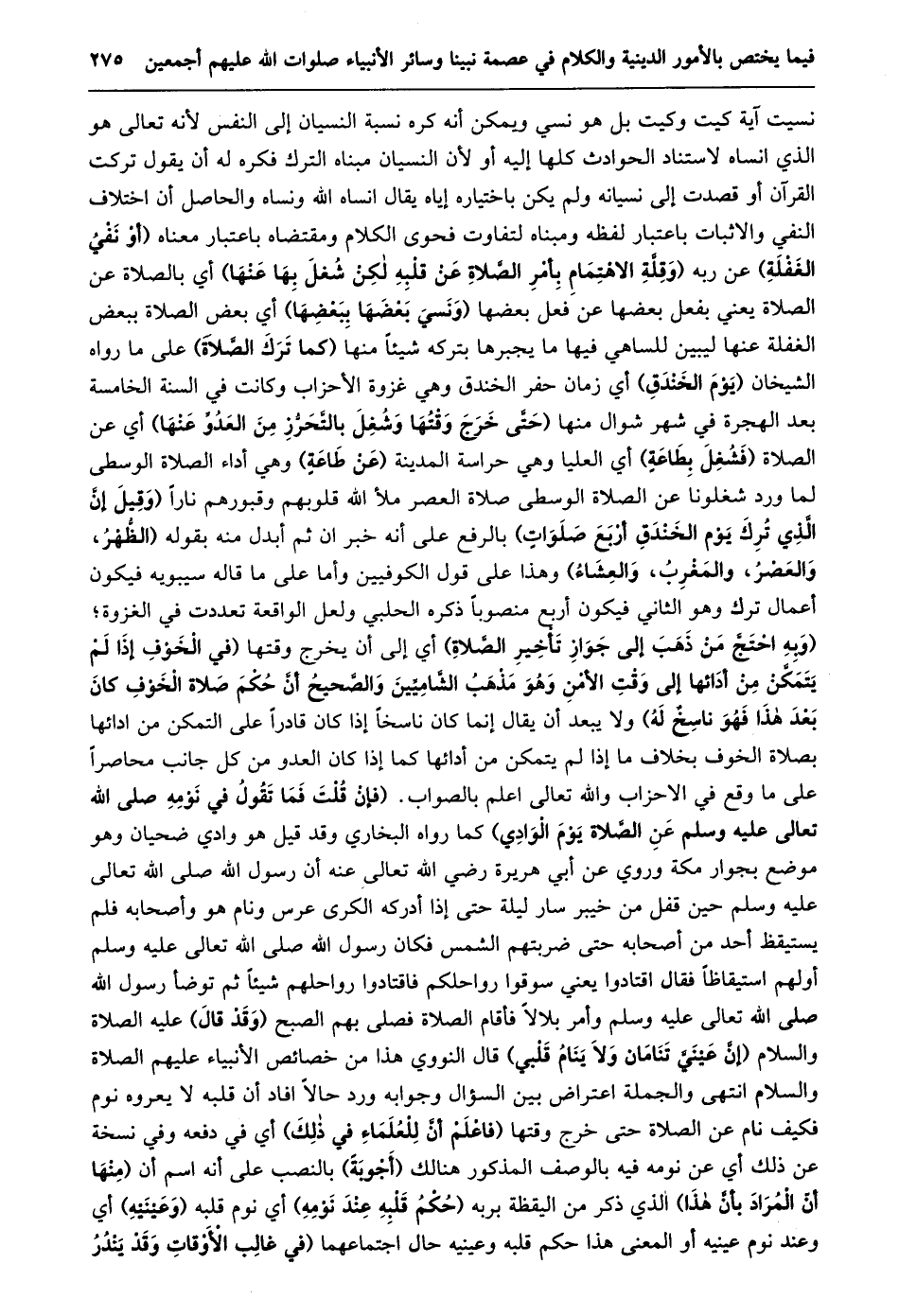 نسيت آية كيت وكيت بل هو نسي ويمكن أنه كره نسبة النسيان إلى النفس لأنه تعالى هو الذي انساه لاستناد الحوادث كلها إليه أو لأن النسيان مبناه الترك فكره له أن يقول تركت القرآن أو قصدت إلى نسيانه ولم يكن باختياره إياه يقال انساه الله ونساه والحاصل أن اختلاف النفي والاثبات باعتبار لفظه ومبناه لتفاوت فحوى الكلام ومقتضاه باعتبار معناه (أو نفي الغفلة) عن ربه (وَقِلَّةِ الِاهْتِمَامِ بِأَمْرِ الصَّلَاةِ عَنْ قَلْبِهِ لَكِنْ شغل بها عنها) أي بالصلاة عن الصلاة يعني بفعل بعضها عن فعل بعضها (ونسي بعضها ببعضها) أي بعض الصلاة ببعض الغفلة عنها ليبين للساهي فيها ما يجبرها بتركه شيئا منها (كما ترك الصّلاة) على ما رواه الشيخان (يوم الخندق) أي زمان حفر الخندق وهي غزوة الأحزاب وكانت في السنة الخامسة بعد الهجرة في شهر شوال منها (حَتَّى خَرَجَ وَقْتُهَا وَشُغِلَ بِالتَّحَرُّزِ مِنَ الْعَدُوِّ عنها) أي عن الصلاة (فشغل بطاعة) أي العليا وهي حراسة المدينة (عن طاعة) وهي أداء الصلاة الوسطى لما ورد شغلونا عن الصلاة الوسطى صلاة العصر ملأ الله قلوبهم وقبورهم نارا (وَقِيلَ إِنَّ الَّذِي تُرِكَ يَوْمَ الْخَنْدَقِ أَرْبَعُ صلوات) بالرفع على أنه خبر ان ثم أبدل منه بقوله (الظّهر، والعصر، والمغرب، والعشاء) وهذا على قول الكوفيين وأما على ما قاله سيبويه فيكون أعمال ترك وهو الثاني فيكون أربع منصوبا ذكره الحلبي ولعل الواقعة تعددت في الغزوة؛ (وَبِهِ احْتَجَّ مَنْ ذَهَبَ إِلَى جَوَازِ تَأْخِيرِ الصّلاة) أي إلى أن يخرج وقتها (فِي الْخَوْفِ إِذَا لَمْ يَتَمَكَّنْ مِنْ أَدَائِهَا إِلَى وَقْتِ الْأَمْنِ وَهُوَ مَذْهَبُ الشَّامِيِّينَ وَالصَّحِيحُ أَنَّ حُكْمَ صَلَاةِ الْخَوْفِ كَانَ بَعْدَ هَذَا فهو ناسخ له) ولا يبعد أن يقال إنما كان ناسخا إذا كان قادرا على التمكن من ادائها بصلاة الخوف بخلاف ما إذا لم يتمكن من أدائها كما إذا كان العدو من كل جانب محاصرا على ما وقع في الاحزاب والله تعالى اعلم بالصواب. (فَإِنْ قُلْتَ فَمَا تَقُولُ فِي نَوْمِهِ صَلَّى الله تعالى عليه وسلم عن الصّلاة يوم الوادي) كما رواه البخاري وقد قيل هو وادي ضحيان وهو موضع بجوار مكة وروي عن أبي هريرة رضي الله تعالى عنه أن رسول الله صلى الله تعالى عليه وسلم حين قفل من خيبر سار ليلة حتى إذا أدركه الكرى عرس ونام هو وأصحابه فلم يستيقظ أحد من أصحابه حتى ضربتهم الشمس فكان رسول الله صلى الله تعالى عليه وسلم أولهم استيقاظا فقال اقتادوا يعني سوقوا رواحلكم فاقتادوا رواحلهم شيئا ثم توضأ رسول الله صلى الله تعالى عليه وسلم وأمر بلالا فأقام الصلاة فصلى بهم الصبح (وقد قال) عليه الصلاة والسلام (إنّ عينيّ تنامان ولا ينام قلبي) قال النووي هذا من خصائص الأنبياء عليهم الصلاة والسلام انتهى والجملة اعتراض بين السؤال وجوابه ورد حالا افاد أن قلبه لا يعروه نوم فكيف نام عن الصلاة حتى خرج وقتها (فاعلم أنّ للعلماء في ذلك) أي في دفعه وفي نسخة عن ذلك أي عن نومه فيه بالوصف المذكور هنالك (أجوبة) بالنصب على أنه اسم أن (منها أنّ المراد بأنّ هذا) الذي ذكر من اليقظة بربه (حكم قلبه عند نومه) أي نوم قلبه (وعينيه) أي وعند نوم عينيه أو المعنى هذا حكم قلبه وعينيه حال اجتماعهما (في غالب الأوقات وقد يندر