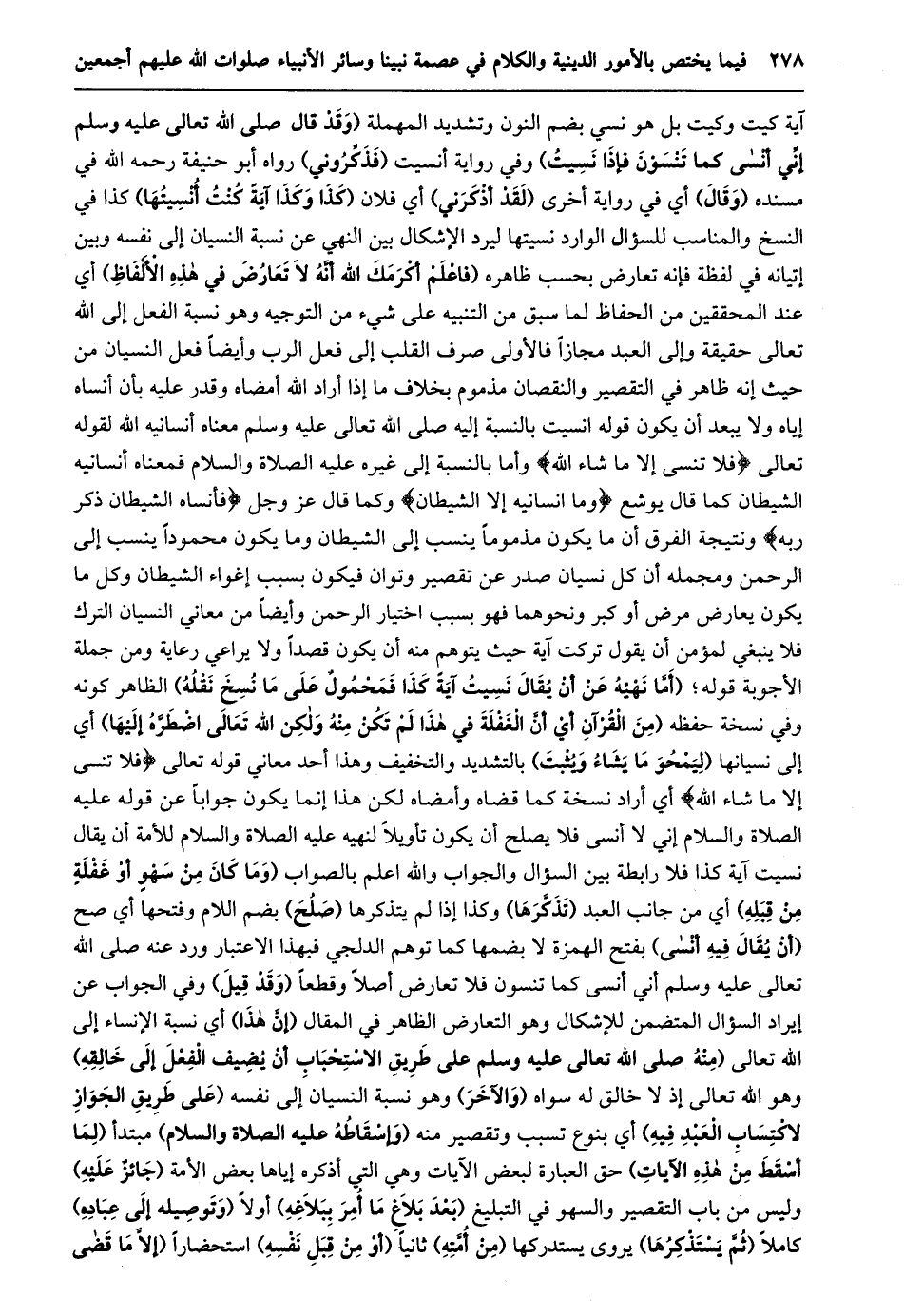 آية كيت وكيت بل هو نسي بضم النون وتشديد المهملة (وقد قال صلى الله تعالى عَلَيْهِ وَسَلَّمَ إِنِّي أَنْسَى كَمَا تَنْسَوْنَ فَإِذَا نسيت) وفي رواية أنسيت (فذكّروني) رواه أبو حنيفة رحمه الله في مسنده (وقال) أي في رواية أخرى (لقد أذكرني) أي فلان (كذا وكذا آية كنت أنسيتها) كذا في النسخ والمناسب للسؤال الوارد نسيتها ليرد الإشكال بين النهي عن نسبة النسيان إلى نفسه وبين إتيانه في لفظة فإنه تعارض بحسب ظاهره (فَاعْلَمْ أَكْرَمَكَ اللَّهُ أَنَّهُ لَا تَعَارُضَ فِي هذه الألفاظ) أي عند المحققين من الحفاظ لما سبق من التنبيه على شيء من التوجيه وهو نسبة الفعل إلى الله تعالى حقيقة وإلى العبد مجازا فالأولى صرف القلب إلى فعل الرب وأيضا فعل النسيان من حيث إنه ظاهر في التقصير والنقصان مذموم بخلاف ما إذا أراد الله أمضاه وقدر عليه بأن أنساه إياه ولا يبعد أن يكون قوله انسيت بالنسبة إليه صلى الله تعالى عليه وسلم معناه أنسانيه الله لقوله تعالى فَلا تَنْسى إِلَّا ما شاءَ اللَّهُ وأما بالنسبة إلى غيره عليه الصلاة والسلام فمعناه أنسانيه الشيطان كما قال يوشع وَما أَنْسانِيهُ إِلَّا الشَّيْطانُ وكما قال عز وجل فَأَنْساهُ الشَّيْطانُ ذِكْرَ رَبِّهِ ونتيجة الفرق أن ما يكون مذموما ينسب إلى الشيطان وما يكون محمودا ينسب إلى الرحمن ومجمله أن كل نسيان صدر عن تقصير وتوان فيكون بسبب إغواء الشيطان وكل ما يكون يعارض مرض أو كبر ونحوهما فهو بسبب اختيار الرحمن وأيضا من معاني النسيان الترك فلا ينبغي لمؤمن أن يقول تركت آية حيث يتوهم منه أن يكون قصدا ولا يراعي رعاية ومن جملة الأجوبة قوله؛ (أَمَّا نَهْيُهُ عَنْ أَنْ يُقَالَ نَسِيتُ آيَةَ كذا فمحمول على ما نسخ نقله) الظاهر كونه وفي نسخة حِفْظُهُ (مِنَ الْقُرْآنِ أَيْ إِنَّ الْغَفْلَةَ فِي هَذَا لَمْ تَكُنْ مِنْهُ وَلَكِنَّ اللَّهَ تَعَالَى اضطرّه إليها) أي إلى نسيانها (ليمحو ما يشاء ويثبت) بالتشديد والتخفيف وهذا أحد معاني قوله تعالى فَلا تَنْسى إِلَّا ما شاءَ اللَّهُ أي أراد نسخة كما قضاه وأمضاه لكن هذا إنما يكون جوابا عن قوله عليه الصلاة والسلام إني لا أنسى فلا يصلح أن يكون تأويلا لنهيه عليه الصلاة والسلام للأمة أن يقال نسيت آية كذا فلا رابطة بين السؤال والجواب والله اعلم بالصواب (وَمَا كَانَ مِنْ سَهْوٍ أَوْ غَفْلَةٍ مِنْ قبله) أي من جانب العبد (تذكّرها) وكذا إذا لم يتذكرها (صلح) بضم اللام وفتحها أي صح (أن يقال فيه أنسى) بفتح الهمزة لا بضمها كما توهم الدلجي فبهذا الاعتبار ورد عنه صلى الله تعالى عليه وسلم أني أنسى كما تنسون فلا تعارض أصلا وقطعا (وقد قيل) وفي الجواب عن إيراد السؤال المتضمن للإشكال وهو التعارض الظاهر في المقال (إنّ هذا) أي نسبة الإنساء إلى الله تعالى (منه صلى الله تعالى عَلَيْهِ وَسَلَّمَ عَلَى طَرِيقِ الِاسْتِحْبَابِ أَنْ يُضِيفَ الفعل إلى خالقه) وهو الله تعالى إذ لا خالق له سواه (والآخر) وهو نسبة النسيان إلى نفسه (على طريق الجواز لاكتساب العبد فيه) أي بنوع تسبب وتقصير منه (وإسقاطه عليه الصلاة والسلام) مبتدأ (لما أسقط من هذه الآيات) حق العبارة لبعض الآيات وهي التي أذكره إياها بعض الأمة (جائز عليه) وليس من باب التقصير والسهو في التبليغ (بعد بلاغ ما أمر ببلاغه) أولا (وتوصيله إلى عباده) كاملا (ثمّ يستذكرها) يروى يستدركها (من أمّته) ثانيا (أو من قبل نفسه) استحضارا (إلّا ما قضى