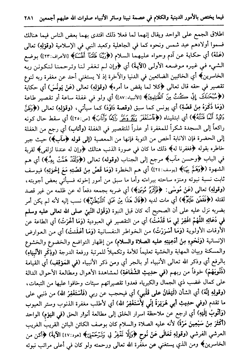 اطلاق الجمع على الواحد ويقال إنهما لما فعلا ذلك اقتدى بهما بعض الناس فيما هنالك فسموا أولادهم عبد شمس ونحوه كما في الجاهلية وكعبد النبي في الإسلامية (وقوله) تعالى (عنه) أي حكاية عن آدم وحواء عليهما السلام (رَبَّنا ظَلَمْنا أَنْفُسَنا [الأعراف: 23] ) بوضع الشيء في غيره موضعه الأولى (الآية) أي وَإِنْ لَمْ تَغْفِرْ لَنا وَتَرْحَمْنا لَنَكُونَنَّ مِنَ الْخاسِرِينَ أي الخائبين الضائعين في الدنيا والآخرة إذ لا يستغني أحد عن مغفرة ربه لنوع تقصير في حقه قال تعالى كَلَّا لَمَّا يَقْضِ ما أَمَرَهُ (وقوله) تعالى (عن يونس) أي حكاية (سُبْحانَكَ إِنِّي كُنْتُ مِنَ الظَّالِمِينَ [الأنبياء: 87] ) أي ولو في غفلة ساعة أو تقصير طاعة (وما ذكره من قصّة) أي يونس كما سبق (وقصة داود) كما سيأتي، (وقوله) تعالى (وَظَنَّ داوُدُ أَنَّما فَتَنَّاهُ) أي ابتليناه (فَاسْتَغْفَرَ رَبَّهُ وَخَرَّ راكِعاً وَأَنابَ [ص: 25] ) أي سقط حال كونه راكعا إلى السجدة شكرا للمغفرة أو عذرا للتقصير في الغفلة (وأناب) أي رجع من الغفلة إلى الحضرة فإن الانابة أخص من التوبة فإنها من المعصية (إلى قوله مَآبٍ) حيث جبر خاطره بقوله فَغَفَرْنا لَهُ ذلك ما كان في صورة الذنب هنالك وَإِنَّ لَهُ عِنْدَنا لَزُلْفى لقربة في الباب وَحُسْنَ مَآبٍ مرجع إلى الجناب (وقوله) تعالى (وَلَقَدْ هَمَّتْ بِهِ) أي هم الشهوة (وَهَمَّ بِها [يوسف: 24] ) أي هم الخطرة (وما قصّ من قصّته مع إخوته) فيوسف ثابت نسبة نبوته ومنزه ساحته ببراءته وأما ما سبق من أمور إخوته فسيأتي بعض أجوبته، (وقوله) تعالى (عن موسى: فَوَكَزَهُ مُوسى) أي ضربه بجمعه دفعا له عن ظلمه من غير قصد لقتله (فَقَضى عَلَيْهِ) أي مات لديه (قالَ هذا مِنْ عَمَلِ الشَّيْطانِ) نسب إليه لأنه لم يكن أمر بضربه نزل عليه على أن الصحيح أنه كان قبل النبوة (وقول النّبيّ صلى الله تعالى عَلَيْهِ وَسَلَّمَ فِي دُعَائِهِ اللَّهُمَّ اغْفِرْ لِي ما قدّمت) أي من التقصير في العبودية (وما أخّرت) أي الطاعة عن الأوقات الأولوية (وما أسررت) من الخواطر النفسانية (وما أعلنت) أي من العوارض الإنسانية (ونحوه من أدعيته عليه الصلاة والسلام) من إظهار التواضع والخضوع والخشوع والمسكنة وبيان المهابة والخشية تعليما للأمة وتكميلا للمرتبة ورفعة الدرجة (وذكر الأنبياء) بالرفع أي وذكر الله تعالى الأنبياء أو بالجر أي ومن ذكر الأنبياء (في الموقف) أي القيامة (ذنوبهم) خوفا من ربهم (في حديث الشّفاعة) لمشاهدة الأهوال ومطالعة الأحوال الدالة على كمال غضب ذي الجمال والكبرياء فعدوا تقصيراتهم سيئات وخافوا عليها من التبعات، (وقوله إنّه) أي الشأن (ليغان على قلبي) أي فيحجب عن ربي (فأستغفر الله) من ذنبي على ما تقدم (وَفِي حَدِيثِ أَبِي هُرَيْرَةَ إِنِّي لَأَسْتَغْفِرُ اللَّهَ) أي لأطلب مغفرة الذنوب وستر العيوب (وأتوب إليه) أي ارجع عن ملاحظة اسرار الخلق إلى مطالعة أنوار الحق (في اليوم) الواحد (أكثر من سبعين مرّة) لأنه عليه الصلاة والسلام كان بوصف الكائن البائن القريب الغريب العرشي الفرشي (وَقَوْلِهِ تَعَالَى عَنْ نُوحٍ وَإِلَّا تَغْفِرْ لِي وَتَرْحَمْنِي [هود: 47] الآية) أَكُنْ مِنَ الْخاسِرِينَ ومن الذي يستغني عن مغفرة الله تعالى ورحمته ولو كان في أعلى مراتب نبوته