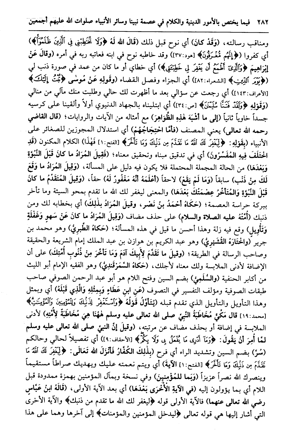 ومناقب رسالته، (وقد كان) أي نوح قبل ذلك (قَالَ اللَّهُ لَهُ وَلا تُخاطِبْنِي فِي الَّذِينَ ظَلَمُوا) أي كفروا (إِنَّهُمْ مُغْرَقُونَ [هود: 37] ) وقد خاطبه نوح في ابنه فعاتبه ربه في أمره (وَقَالَ عَنْ إِبْرَاهِيمَ وَالَّذِي أَطْمَعُ أَنْ يَغْفِرَ لِي خَطِيئَتِي) أي خطاي أو ما كان من عمد في صورة ذنب لي (يَوْمَ الدِّينِ [الشعراء: 82] ) أي الجزاء وفصل القضاء (وقوله عن موسى تُبْتُ إِلَيْكَ [الأعراف: 143] ) أي رجعت عن سؤالي بعد ما أظهرت لك حالي وطلبت منك مآلي من منالي (وقوله وَلَقَدْ فَتَنَّا سُلَيْمانَ [ص: 34] ) أي ابتليناه بالجهاد الدنيوي أولا وألقينا على كرسيه جسدا خاويا ثانيا (إلى ما أشبه هذه الظّواهر) مع أمثاله من الآيات والروايات؛ (قال القاضي رحمه الله تعالى) يعني المصنف (فأمّا احتجاجهم) أي استدلال المجوزين للصغائر على الأنبياء (بِقَوْلِهِ: لِيَغْفِرَ لَكَ اللَّهُ مَا تَقَدَّمَ مِنْ ذَنْبِكَ وَما تَأَخَّرَ [الفتح: 1] فهذا) الكلام المكنون (قد اختلف فيه المفسّرون) أي في تدقيق مبناه وتحقيق معناه؛ (فَقِيلَ الْمُرَادُ مَا كَانَ قَبْلَ النُّبُوَّةِ وَبَعْدَهَا) من الحالة المجملة المحتملة فلا يكون فيه دليل على المسألة، (وَقِيلَ الْمُرَادُ مَا وَقَعَ لَكَ مِنْ ذَنْبٍ) سابقا (وما لم يقع) لا حقا (أعلمه أنّه مغفور له) حقا، (وَقِيلَ الْمُتَقَدِّمُ مَا كَانَ قَبْلَ النُّبُوَّةِ وَالْمُتَأَخِّرُ عصمتك بعدها) والمعنى ليغفر لك الله ما تقدم بمحو السيئة وما تأخر ببركة حراسة العصمة؛ (حَكَاهُ أَحْمَدُ بْنُ نَصْرٍ، وَقِيلَ الْمُرَادُ بِذَلِكَ) أي بخطابه لك ومن ذنبك (أمّته عليه الصلاة والسلام) على حذف مضاف (وَقِيلَ الْمُرَادُ مَا كَانَ عَنْ سَهْوٍ وَغَفْلَةٍ وتأويل) وقع فيه زلة وهذا أحسن ما قيل في هذه المسألة؛ (حكاه الطّبريّ) وهو محمد بن جرير (واختاره القشيريّ) وهو عبد الكريم بن هوازن بن عبد الملك إمام الشريعة والحقيقة وصاحب الرسالة في الطريقة؛ (وَقِيلَ مَا تَقَدَّمَ لِأَبِيكَ آدَمَ وَمَا تَأَخَّرَ من ذنوب أمّتك) على أن الإضافة لأدنى الملابسة ولك معناه لأجلك، (حكاه السّمرقنديّ) وهو الفقيه الإمام أبو الليث من أكابر الحنفية (والسّلميّ) بضم السين وفتح اللام هو أبو عبد الرحمن الصوفي صاحب طبقات الصوفية ومؤلف التفسير في التصوف (عن ابن عطاء وبمثله والّذي قبله) أي وبمثل وهذا التأويل والتأويل الذي تقدم قَبْلَهُ (يُتَأَوَّلُ قَوْلُهُ وَاسْتَغْفِرْ لِذَنْبِكَ وَلِلْمُؤْمِنِينَ وَالْمُؤْمِناتِ [مُحَمَّدٍ: 19] قَالَ مَكِّيٌّ مُخَاطَبَةُ النَّبِيِّ صَلَّى اللَّهُ تعالى عليه وسلم ههنا هي مخاطبة لأمّته) لأدنى الملابسة في إضافة أو بحذف مضاف عن مرتبته، (وقيل إنّ النبيّ صلى الله تعالى عَلَيْهِ وَسَلَّمَ لَمَّا أُمِرَ أَنْ يَقُولَ: وَما أَدْرِي مَا يُفْعَلُ بِي وَلا بِكُمْ [الْأَحْقَافِ: 9] ) أي تفصيلا لحالي وحالكم (سرّ) بضم السين وتشديد الراء أي فرح (بِذَلِكَ الْكُفَّارُ فَأَنْزَلَ اللَّهُ تَعَالَى: لِيَغْفِرَ لَكَ اللَّهُ مَا تَقَدَّمَ مِنْ ذَنْبِكَ وَما تَأَخَّرَ [الفتح: 1] الآية) أي ويتم نعمته عليك ويهديك صراطا مستقيما وينصرك الله نصرا عزيزا (وبما للمؤمنين) وفي نسخة وبمآل المؤمنين بهمزة ممدودة قبل اللام أي بما يؤولون إليه (في الآية الأخرى بعدها) أي بعد الآية الأولى، (قاله ابن عبّاس رضي الله تعالى عنهما) فالآية الأولى قَوْلِهِ لِيَغْفِرَ لَكَ اللَّهُ مَا تَقَدَّمَ مِنْ ذَنْبِكَ والآية الأخرى التي أشار إليها هي قوله تعالى لِيُدْخِلَ الْمُؤْمِنِينَ وَالْمُؤْمِناتِ إلى آخرها وهما على هذا