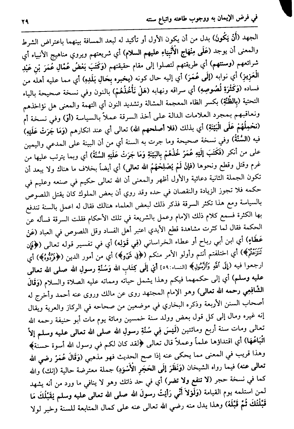 الجهد (أن يكون) بدل من أن يكون الأول أو تأكيد له لبعد المسافة بينهما باعتراض الشرط والمعنى أن يوجد (على منهاج الأنبياء عليهم السلام) أي شريعتهم ويروي مناهيج الأنبياء أي شرائعهم (وسنتهم) أي طريقتهم لتصلوا إلى مقام حقيقتهم (وَكَتَبَ بَعْضُ عُمَّالِ عُمَرَ بْنِ عَبْدِ الْعَزِيزِ) أي نوابه (إلى عمر) أي إليه حال كونه (يخبره بحال بلده) أي مما عليه أهله من فساده (وكثرة لصوصه) أي سراقه ونهابه (هل نأخذهم) بالنون وفي نسخة صحيحة بالياء التحتية (بالظّنّة) بكسر الظاء المعجمة المشالة وتشديد النون أي التهمة والمعنى هل نؤاخذهم ونعاقبهم بمجرد العلامات الدالة على أخذ السرقة عملا بالسياسة (أو) وفي نسخة أم (نحملهم على البيّنة) أي بذلك (فلا أصلحهم الله) تعالى أي عند انكارهم (وما جرت عليه) فيه (السّنّة) وفي نسخة صحيحة وما جرت به السنة أي من أن البينة على المدعي واليمين على من أنكر (فَكَتَبَ إِلَيْهِ عُمَرُ خُذْهُمْ بِالْبَيِّنَةِ وَمَا جَرَتْ عليه السّنّة) أي وبما يترتب عليها من غرم وقتل وقطع ونحوها (فإن لم يصلحهم الله تعالى) أي أيضا بخلاف ما هناك ولا يبعد أن تكون الجملة الثانية دعائية والأول أظهر والمعنى أن الله تعالى حكيم في صنعه وعليم في حكمه فلا تجوز الزيادة والنقصان في حده وقد روي أن بعض الملوك كان يقتل اللصوص بالسياسة ومع هذا تكثر السرقة فذكر ذلك لبعض العلماء هنالك فقال له اعمل بالسنة تندفع بها الكثرة فسمع كلام ذلك الإمام وعمل بالشريعة في تلك الأحكام فقلت السرقة فسأله عن الحكمة فقال لما كثرت مشاهدة قطع الأيدي اعتبر أهل الفساد وقل اللصوص في العباد (عن عطاء) أي ابن أبي رباح أو عطاء الخراساني (في قوله) أي في تفسير قوله تعالى فَإِنْ تَنازَعْتُمْ) أي اختلفتم أنتم وأولو الأمر منكم (فِي شَيْءٍ) أي من أمور الدين (فَرُدُّوهُ) أي ارجعوا فيه (إِلَى اللَّهِ وَالرَّسُولِ) [النِّسَاءِ: 59] أَيْ إِلَى كِتَابِ الله وسنّة رسول الله صلى الله تعالى عليه وسلم) أي إلى حكمهما فيكم وهذا يشمل حياته ومماته عليه الصلاة والسلام (وقال الشّافعي رحمه الله تعالى) وهو الإمام المجتهد روى عن مالك وروى عنه أحمد وأخرج له أصحاب السنن الأربعة وذكره البخاري في موضعين من صحاحه في الركاز والعرية ويقال إنه غيره ومال إلى كل قول بعض وولد سنة خمسين ومائة يوم مات أبو حنيفة رحمه الله تعالى ومات سنة أربع ومائتين (لَيْسَ فِي سُنَّةِ رَسُولِ اللَّهِ صَلَّى اللَّهُ تعالى عليه وسلم إلّا اتّباعها) أي اقتداؤها علما وعملا قال تعالى لَقَدْ كانَ لَكُمْ فِي رَسُولِ اللَّهِ أُسْوَةٌ حَسَنَةٌ وهذا قريب في المعنى مما يحكى عنه إذا صح الحديث فهو مذهبي (وقال عمر رضي الله تعالى عنه) فيما رواه الشيخان (ونظر إلى الحجر الأسود) جملة معترضة حالية (إنك) والله كما في نسخة حجر (لا تنفع ولا تضر) أي في حد ذاتك وهو لا ينافي ما ورد من أنه يشهد لمن استلمه يوم القيامة (وَلَوْلَا أَنِّي رَأَيْتُ رَسُولَ اللَّهِ صَلَّى اللَّهُ تعالى عَلَيْهِ وَسَلَّمَ يُقَبِّلُكَ مَا قَبَّلْتُكَ ثُمَّ قَبَّلَهُ) وهذا يدل منه رضي الله تعالى عنه على كمال المتابعة للسنة وخبر لولا