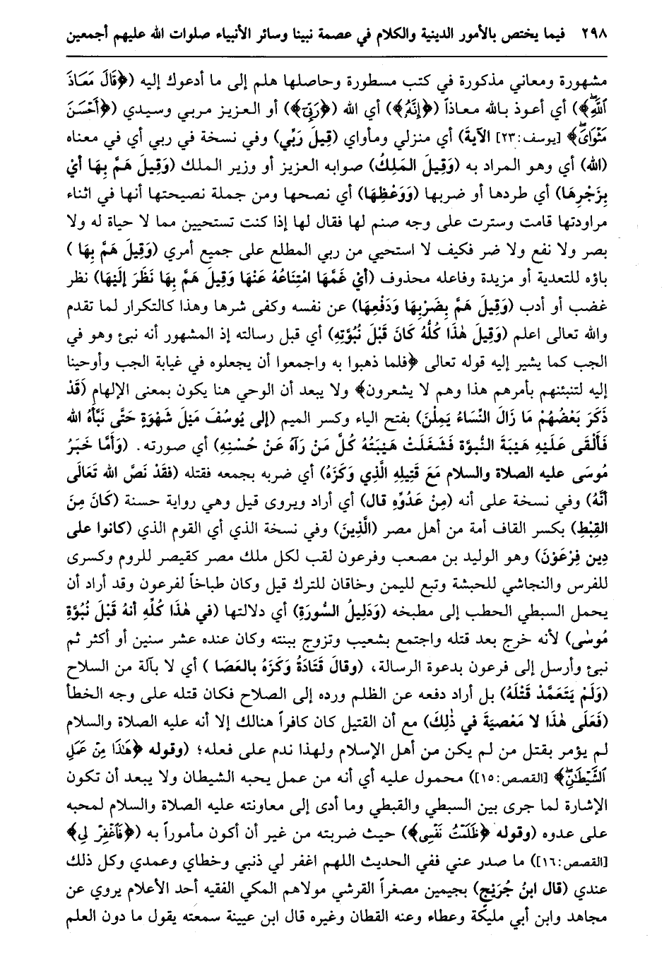 مشهورة ومعاني مذكورة في كتب مسطورة وحاصلها هلم إلى ما أدعوك إليه (قالَ مَعاذَ اللَّهِ) أي أعوذ بالله معاذا (إِنَّهُ) أي الله (رَبِّي) أو العزيز مربي وسيدي (أَحْسَنَ مَثْوايَ [يوسف: 23] الآية) أي منزلي ومأواي (قيل ربّي) وفي نسخة في ربي أي في معناه (الله) أي وهو المراد به (وقيل الملك) صوابه العزيز أو وزير الملك (وقيل همّ بها أي بزجرها) أي طردها أو ضربها (ووعظها) أي نصحها ومن جملة نصيحتها أنها في اثناء مراودتها قامت وسترت على وجه صنم لها فقال لها إذا كنت تستحيين مما لا حياة له ولا بصر ولا نفع ولا ضر فكيف لا استحيي من ربي المطلع على جميع أمري (وقيل همّ بها) باؤه للتعدية أو مزيدة وفاعله محذوف (أَيْ غَمَّهَا امْتِنَاعُهُ عَنْهَا وَقِيلَ هَمَّ بِهَا نظر إليها) نظر غضب أو أدب (وقيل همّ بضربها ودفعها) عن نفسه وكفى شرها وهذا كالتكرار لما تقدم والله تعالى اعلم (وقيل هذا كلّه كان قبل نبوّته) أي قبل رسالته إذ المشهور أنه نبئ وهو في الجب كما يشير إليه قوله تعالى فَلَمَّا ذَهَبُوا بِهِ وَأَجْمَعُوا أَنْ يَجْعَلُوهُ فِي غَيابَتِ الْجُبِّ وَأَوْحَيْنا إِلَيْهِ لَتُنَبِّئَنَّهُمْ بِأَمْرِهِمْ هَذَا وَهُمْ لَا يَشْعُرُونَ ولا يبعد أن الوحي هنا يكون بمعنى الإلهام (قد ذكر بعضهم ما زال النّساء يملن) بفتح الياء وكسر الميم (إِلَى يُوسُفَ مَيْلَ شَهْوَةٍ حَتَّى نَبَّأَهُ اللَّهُ فَأَلْقَى عَلَيْهِ هَيْبَةَ النُّبُوَّةِ فَشَغَلَتْ هَيْبَتُهُ كُلَّ من رآه عن حسنه) أي صورته. (وأمّا خبر موسى عليه الصلاة والسلام مع قتيله الّذي وكزه) أي ضربه بجمعه فقتله (فقد نصّ الله تعالى أنّه) وفي نسخة على أنه (من عدوّه قال) أي أراد ويروى قيل وهي رواية حسنة (كان من القبط) بكسر القاف أمة من أهل مصر (الّذين) وفي نسخة الذي أي القوم الذي (كانوا على دين فرعون) وهو الوليد بن مصعب وفرعون لقب لكل ملك مصر كقيصر للروم وكسرى للفرس والنجاشي للحبشة وتبع لليمن وخاقان للترك قيل وكان طباخا لفرعون وقد أراد أن يحمل السبطي الحطب إلى مطبخه (ودليل السّورة) أي دلالتها (فِي هَذَا كُلِّهِ أَنَّهُ قَبْلَ نُبُوَّةِ مُوسَى) لأنه خرج بعد قتله واجتمع بشعيب وتزوج ببنته وكان عنده عشر سنين أو أكثر ثم نبئ وأرسل إلى فرعون بدعوة الرسالة، (وقال قتادة وكزه بالعصا) أي لا بآلة من السلاح (ولم يتعمّد قتله) بل أراد دفعه عن الظلم ورده إلى الصلاح فكان قتله على وجه الخطأ (فعلى هذا لا معصية في ذلك) مع أن القتيل كان كافرا هنالك إلا أنه عليه الصلاة والسلام لم يؤمر بقتل من لم يكن من أهل الإسلام ولهذا ندم على فعله؛ (وقوله هذا مِنْ عَمَلِ الشَّيْطانِ [القصص: 15] ) محمول عليه أي أنه من عمل يحبه الشيطان ولا يبعد أن تكون الإشارة لما جرى بين السبطي والقبطي وما أدى إلى معاونته عليه الصلاة والسلام لمحبه على عدوه (وقوله ظَلَمْتُ نَفْسِي) حيث ضربته من غير أن أكون مأمورا به (فَاغْفِرْ لِي [القصص: 16] ) ما صدر عني ففي الحديث اللهم اغفر لي ذنبي وخطاي وعمدي وكل ذلك عندي (قال ابن جريج) بجيمين مصغرا القرشي مولاهم المكي الفقيه أحد الأعلام يروي عن مجاهد وابن أبي مليكة وعطاء وعنه القطان وغيره قال ابن عيينة سمعته يقول ما دون العلم