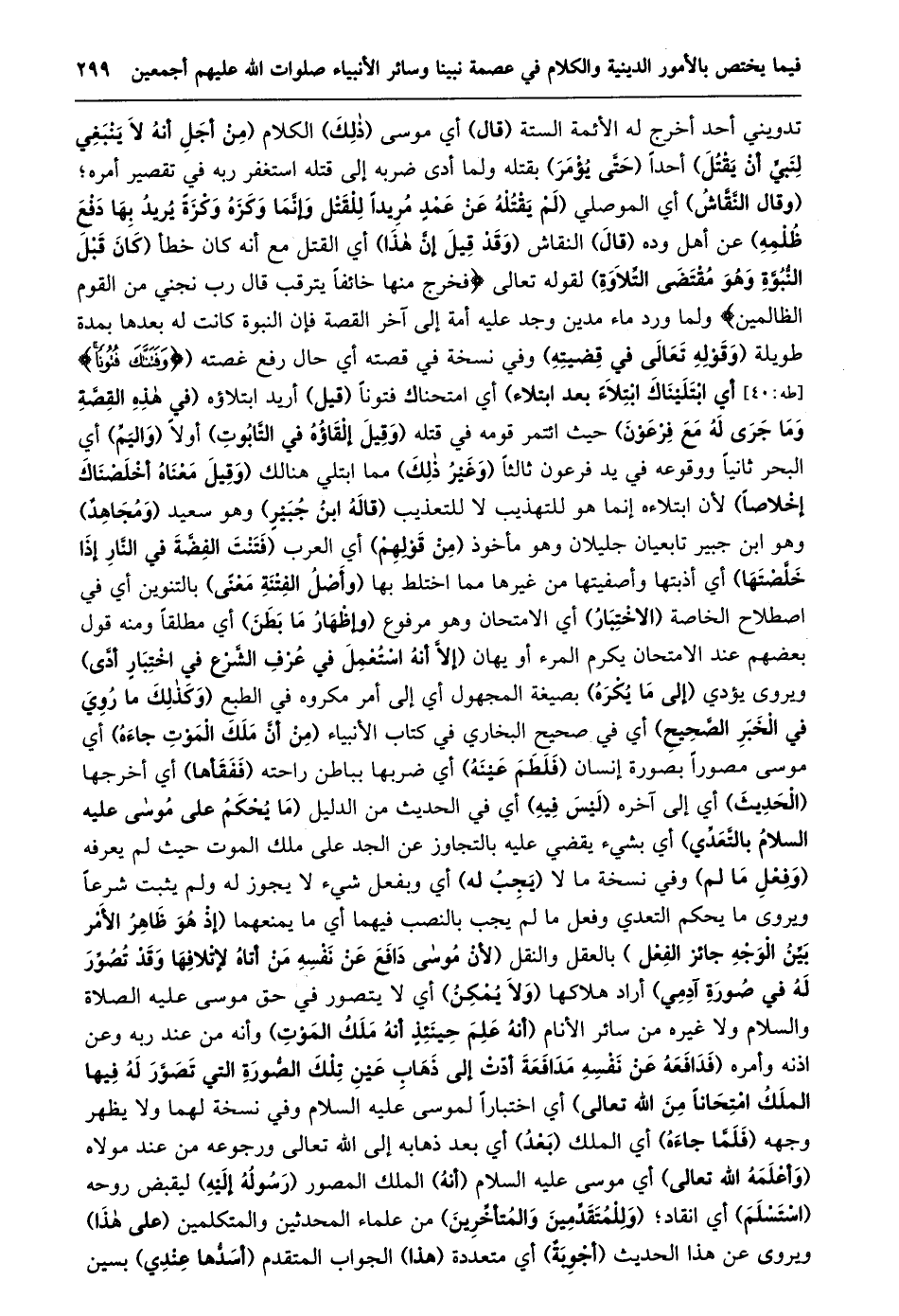 تدويني أحد أخرج له الأئمة الستة (قال) أي موسى (ذلك) الكلام (مِنْ أَجْلِ أَنَّهُ لَا يَنْبَغِي لِنَبِيٍّ أَنْ يقتل) أحدا (حتّى يؤمر) بقتله ولما أدى ضربه إلى قتله استغفر ربه في تقصير أمره؛ (وقال النّقّاش) أي الموصلي (لَمْ يَقْتُلْهُ عَنْ عَمْدٍ مُرِيدًا لِلْقَتْلِ وَإِنَّمَا وكزه وكزة يريد بها دفع ظلمه) عن أهل وده (قال) النقاش (وقد قيل إنّ هذا) أي القتل مع أنه كان خطأ (كان قبل النّبوّة وهو مقتضى التّلاوة) لقوله تعالى فَخَرَجَ مِنْها خائِفاً يَتَرَقَّبُ قالَ رَبِّ نَجِّنِي مِنَ الْقَوْمِ الظَّالِمِينَ ولما ورد ماء مدين وجد عليه أمة إلى آخر القصة فإن النبوة كانت له بعدها بمدة طويلة (وقوله تعالى في قضيته) وفي نسخة في قصته أي حال رفع غصته (وَفَتَنَّاكَ فُتُوناً [طَهَ: 40] أَيِ ابْتَلَيْنَاكَ ابْتِلَاءً بَعْدَ ابتلاء) أي امتحناك فتونا (قيل) أريد ابتلاؤه (فِي هَذِهِ الْقِصَّةِ وَمَا جَرَى لَهُ مَعَ فرعون) حيث ائتمر قومه في قتله (وقيل إلقاؤه في التّابوت) أولا (واليمّ) أي البحر ثانيا ووقوعه في يد فرعون ثالثا (وغير ذلك) مما ابتلي هنالك (وقيل معناه أخلصناك إخلاصا) لأن ابتلاءه إنما هو للتهذيب لا للتعذيب (قاله ابن جبير) وهو سعيد (ومجاهد) وهو ابن جبير تابعيان جليلان وهو مأخوذ (من قولهم) أي العرب (فتنت الفضّة في النّار إذا خلّصتها) أي أذبتها وأصفيتها من غيرها مما اختلط بها (وأصل الفتنة معنى) بالتنوين أي في اصطلاح الخاصة (الاختبار) أي الامتحان وهو مرفوع (وإظهار ما بطن) أي مطلقا ومنه قول بعضهم عند الامتحان يكرم المرء أو يهان (إِلَّا أَنَّهُ اسْتُعْمِلَ فِي عُرْفِ الشَّرْعِ فِي اختبار أدّى) ويروى يؤدي (إلى ما يكره) بصيغة المجهول أي إلى أمر مكروه في الطبع (وكذلك ما روي في الخبر الصّحيح) أي في صحيح البخاري في كتاب الأنبياء (من أنّ ملك الموت جاءه) أي موسى مصورا بصورة إنسان (فلطم عينه) أي ضربها بباطن راحته (ففقأها) أي أخرجها (الحديث) أي إلى آخره (ليس فيه) أي في الحديث من الدليل (ما يحكم على موسى عليه السلام بالتّعدّي) أي بشيء يقضي عليه بالتجاوز عن الجد على ملك الموت حيث لم يعرفه (وفعل ما لم) وفي نسخة ما لا (يجب له) أي وبفعل شيء لا يجوز له ولم يثبت شرعا ويروى ما يحكم التعدي وفعل ما لم يجب بالنصب فيهما أي ما يمنعهما (إِذْ هُوَ ظَاهِرُ الْأَمْرِ بَيِّنُ الْوَجْهِ جَائِزُ الفعل) بالعقل والنقل (لِأَنَّ مُوسَى دَافَعَ عَنْ نَفْسِهِ مَنْ أَتَاهُ لِإِتْلَافِهَا وَقَدْ تُصُوِّرَ لَهُ فِي صُورَةِ آدَمِيٍّ) أراد هلاكها (ولا يمكن) أي لا يتصور في حق موسى عليه الصلاة والسلام ولا غيره من سائر الأنام (أنه علم حينئذ أنه ملك الموت) وأنه من عند ربه وعن اذنه وأمره (فَدَافَعَهُ عَنْ نَفْسِهِ مُدَافَعَةً أَدَّتْ إِلَى ذَهَابِ عَيْنِ تِلْكَ الصُّورَةِ الَّتِي تُصُوِّرَ لَهُ فِيهَا الملك امتحانا من الله تعالى) أي اختبارا لموسى عليه السلام وفي نسخة لهما ولا يظهر وجهه (فلمّا جاءه) أي الملك (بعد) أي بعد ذهابه إلى الله تعالى ورجوعه من عند مولاه (وأعلمه الله تعالى) أي موسى عليه السّلام (أنه) الملك المصور (رسوله إليه) ليقبض روحه (استسلم) أي انقاد؛ (وللمتقدّمين والمتأخّرين) من علماء المحدثين والمتكلمين (على هذا) ويروى عن هذا الحديث (أجوبة) أي متعددة (هذا) الجواب المتقدم (أسدّها عندي) بسين