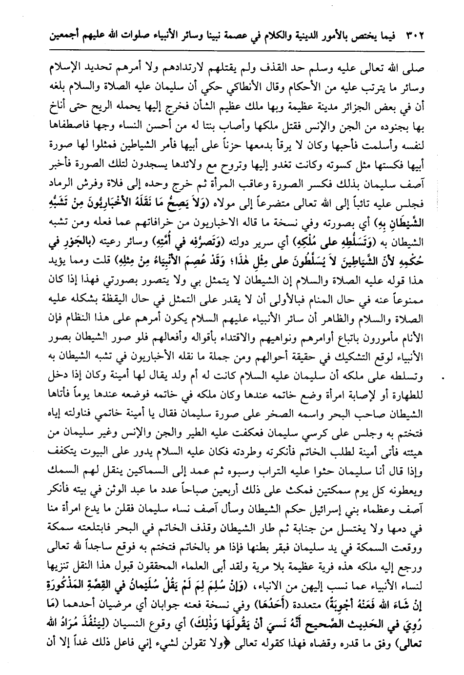 صلى الله تعالى عليه وسلم حد القذف ولم يقتلهم لارتدادهم ولا أمرهم تحديد الإسلام وسائر ما يترتب عليه من الأحكام وقال الأنطاكي حكي أن سليمان عليه الصلاة والسلام بلغه أن في بعض الجزائر مدينة عظيمة وبها ملك عظيم الشأن فخرج إليها يحمله الريح حتى أناخ بها بجنوده من الجن والإنس فقتل ملكها وأصاب بنتا له من أحسن النساء وجها فاصطفاها لنفسه وأسلمت فأحبها وكان لا يرقأ بدمعها حزنا على أبيها فأمر الشياطين فمثلوا لها صورة أبيها فكستها مثل كسوته وكانت تغدو إليها وتروح مع ولائدها يسجدون لتلك الصورة فأخبر آصف سليمان بذلك فكسر الصورة وعاقب المرأة ثم خرج وحده إلى فلاة وفرش الرماد فجلس عليه تائبا إلى الله تعالى متضرعا إلى مولاه (وَلَا يَصِحُّ مَا نَقَلَهُ الْأَخْبَارِيُّونَ مِنْ تَشَبُّهِ الشّيطان به) أي بصورته وفي نسخة ما قاله الاخباريون من خرافاتهم عما فعله ومن تشبه الشيطان به (وتسلّطه على ملكه) أي سرير دولته (وتصرّفه في أمّته) وسائر رعيته (بِالْجَوْرِ فِي حُكْمِهِ لِأَنَّ الشَّيَاطِينَ لَا يُسَلَّطُونَ عَلَى مِثْلِ هَذَا؛ وَقَدْ عُصِمَ الْأَنْبِيَاءُ مِنْ مثله) قلت ومما يؤيد هذا قوله عليه الصلاة والسلام إن الشيطان لا يتمثل بي ولا يتصور بصورتي فهذا إذا كان ممنوعا عنه في حال المنام فبالأولى أن لا يقدر على التمثل في حال اليقظة بشكله عليه الصلاة والسلام والظاهر أن سائر الأنبياء عليهم السلام يكون أمرهم على هذا النظام فإن الأنام مأمورون باتباع أوامرهم ونواهيهم والاقتداء بأقواله وأفعالهم فلو صور الشيطان بصور الأنبياء لوقع التشكيك في حقيقة أحوالهم ومن جملة ما نقله الأخباريون في تشبه الشيطان به وتسلطه على ملكه أن سليمان عليه السلام كانت له أم ولد يقال لها أمينة وكان إذا دخل للطهارة أو لإصابة امرأة وضع خاتمه عندها وكان ملكه في خاتمه فوضعه عندها يوما فأتاها الشيطان صاحب البحر واسمه الصخر على صورة سليمان فقال يا أمينة خاتمي فناولته إياه فتختم به وجلس على كرسي سليمان فعكفت عليه الطير والجن والإنس وغير سليمان من هيئته فأتى أمينة لطلب الخاتم فأنكرته وطردته فكان عليه السلام يدور على البيوت يتكفف وإذا قال أنا سليمان حثوا عليه التراب وسبوه ثم عمد إلى السماكين ينقل لهم السمك ويعطونه كل يوم سمكتين فمكث على ذلك أربعين صباحا عدد ما عبد الوثن في بيته فأنكر آصف وعظماء بني إسرائيل حكم الشيطان وسأل آصف نساء سليمان فقلن ما يدع امرأة منا في دمها ولا يغتسل من جنابة ثم طار الشيطان وقذف الخاتم في البحر فابتلعته سمكة ووقعت السمكة في يد سليمان فبقر بطنها فإذا هو بالخاتم فتختم به فوقع ساجدا لله تعالى ورجع إليه ملكه هذه فرية عظيمة بلا مرية ولقد أبى العلماء المحققون قبول هذا النقل تنزيها لنساء الأنبياء عما نسب إليهن من الانباء، (وإن سلم لِمَ لَمْ يَقُلْ سُلَيْمَانُ فِي الْقِصَّةِ الْمَذْكُورَةِ إن شاء الله فعنه أجوبة) متعددة (أحدها) وفي نسخة فعنه جوابان أي مرضيان أحدهما (مَا رُوِيَ فِي الْحَدِيثِ الصَّحِيحِ أَنَّهُ نَسِيَ أن يقولها وذلك) أي وقوع النسيان (لينفذ مراد الله تعالى) وفق ما قدره وقضاه فهذا كقوله تعالى وَلا تَقُولَنَّ لِشَيْءٍ إِنِّي فاعِلٌ ذلِكَ غَداً إِلَّا أَنْ