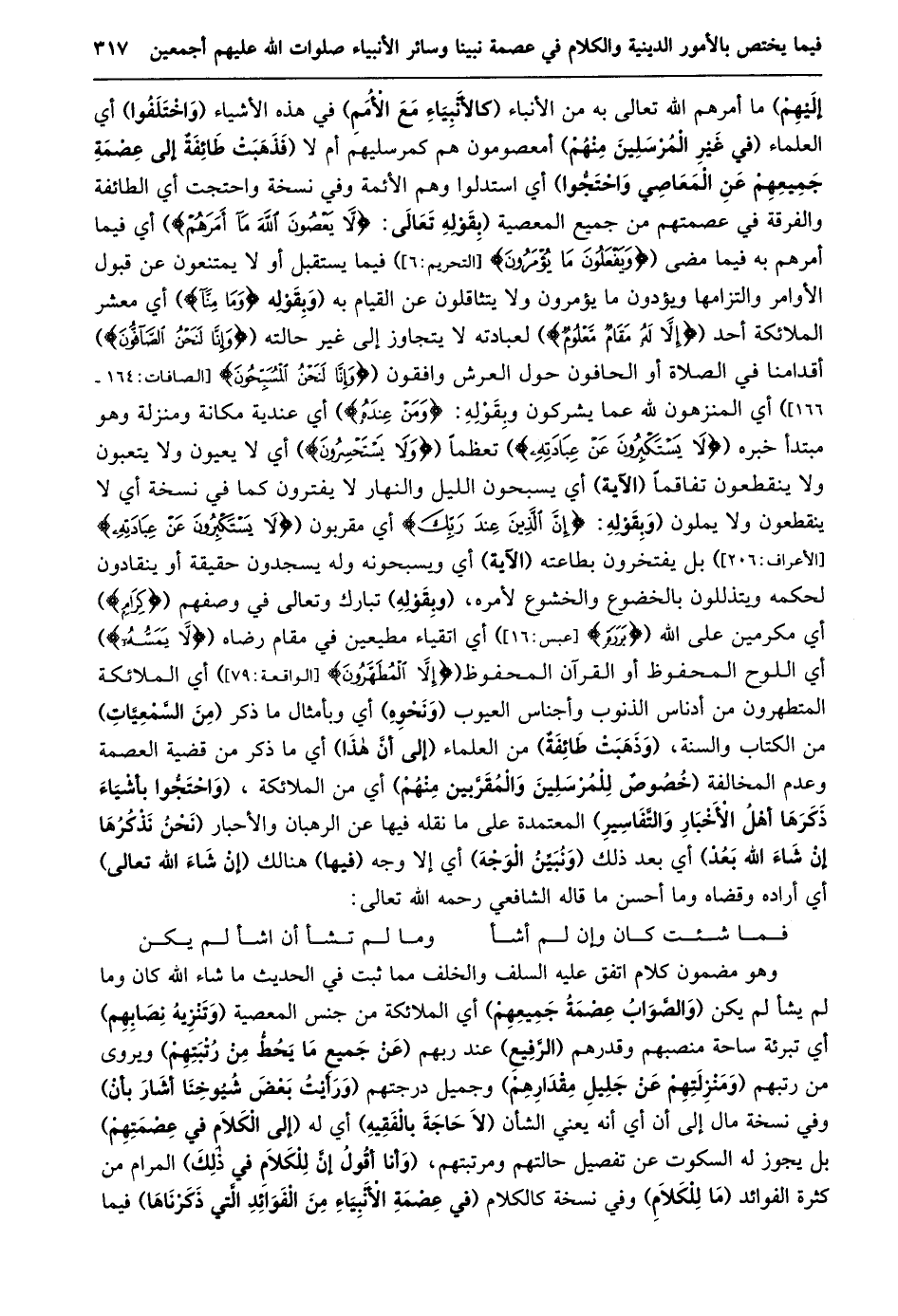 إليهم) ما أمرهم الله تعالى به من الأنباء (كالأنبياء مع الأمم) في هذه الأشياء (واختلفوا) أي العلماء (في غير المرسلين منهم) أمعصومون هم كمرسليهم أم لا (فَذَهَبَتْ طَائِفَةٌ إِلَى عِصْمَةِ جَمِيعِهِمْ عَنِ الْمَعَاصِي واحتجّوا) أي استدلوا وهم الأئمة وفي نسخة واحتجت أي الطائفة والفرقة في عصمتهم من جميع المعصية (بِقَوْلِهِ تَعَالَى: لَا يَعْصُونَ اللَّهَ مَا أَمَرَهُمْ) أي فيما أمرهم به فيما مضى (وَيَفْعَلُونَ ما يُؤْمَرُونَ [التحريم: 6] ) فيما يستقبل أو لا يمتنعون عن قبول الأوامر والتزامها ويؤدون ما يؤمرون ولا يتثاقلون عن القيام به (وبقوله وَما مِنَّا) أي معشر الملائكة أحد (إِلَّا لَهُ مَقامٌ مَعْلُومٌ) لعبادته لا يتجاوز إلى غير حالته (وَإِنَّا لَنَحْنُ الصَّافُّونَ) أقدامنا في الصلاة أو الحافون حول العرش وافقون (وَإِنَّا لَنَحْنُ الْمُسَبِّحُونَ [الصافات: 164- 166] ) أي المنزهون لله عما يشركون وبقوله: وَمَنْ عِنْدَهُ) أي عندية مكانة ومنزلة وهو مبتدأ خبره (لا يَسْتَكْبِرُونَ عَنْ عِبادَتِهِ) تعظما (وَلا يَسْتَحْسِرُونَ) أي لا يعيون ولا يتعبون ولا ينقطعون تفاقما (الآية) أي يسبحون الليل والنهار لا يفترون كما في نسخة أي لا ينقطعون ولا يملون (وبقوله: إِنَّ الَّذِينَ عِنْدَ رَبِّكَ أي مقربون (لا يَسْتَكْبِرُونَ عَنْ عِبادَتِهِ [الأعراف: 206] ) بل يفتخرون بطاعته (الآية) أي ويسبحونه وله يسجدون حقيقة أو ينقادون لحكمه ويتذللون بالخضوع والخشوع لأمره، (وبقوله) تبارك وتعالى في وصفهم (كِرامٍ) أي مكرمين على الله (بَرَرَةٍ [عبس: 16] ) أي اتقياء مطيعين في مقام رضاه (لا يَمَسُّهُ) أي اللوح المحفوظ أو القرآن المحفوظ (إِلَّا الْمُطَهَّرُونَ [الواقعة: 79] ) أي الملائكة المتطهرون من أدناس الذنوب وأجناس العيوب (ونحوه) أي وبأمثال ما ذكر (من السّمعيّات) من الكتاب والسنة، (وذهبت طائفة) من العلماء (إلى أنّ هذا) أي ما ذكر من قضية العصمة وعدم المخالفة (خصوص للمرسلين والمقرّبين منهم) أي من الملائكة، (واحتجّوا بأشياء ذكرها أهل الأخبار والتّفاسير) المعتمدة على ما نقله فيها عن الرهبان والأحبار (نحن نذكرها إن شاء الله بعد) أي بعد ذلك (ونبيّن الوجه) أي إلا وجه (فيها) هنالك (إن شاء الله تعالى) أي أراده وقضاه وما أحسن ما قاله الشافعي رحمه الله تعالى: