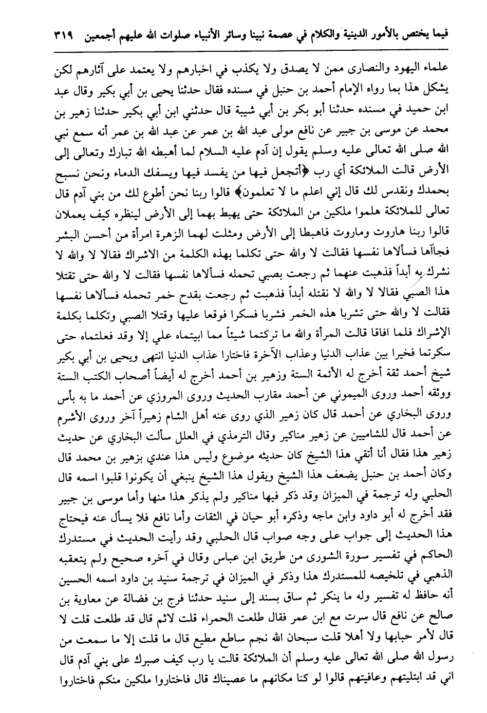 علماء اليهود والنصارى ممن لا يصدق ولا يكذب في اخبارهم ولا يعتمد على آثارهم لكن يشكل هذا بما رواه الإمام أحمد بن حنبل في مسنده فقال حدثنا يحيى بن أبي بكير وقال عبد ابن حميد في مسنده حدثنا أبو بكر بن أبي شيبة قال حدثني ابن أبي بكير حدثنا زهير بن محمد عن موسى بن جبير عن نافع مولى عبد الله بن عمر عن عبد الله بن عمر أنه سمع نبي الله صلى الله تعالى عليه وسلم يقول إن آدم عليه السلام لما أهبطه الله تبارك وتعالى إلى الأرض قالت الملائكة أي رب أَتَجْعَلُ فِيها مَنْ يُفْسِدُ فِيها وَيَسْفِكُ الدِّماءَ وَنَحْنُ نُسَبِّحُ بِحَمْدِكَ وَنُقَدِّسُ لَكَ قالَ إِنِّي أَعْلَمُ ما لا تَعْلَمُونَ قالوا ربنا نحن أطوع لك من بني آدم قال تعالى للملائكة هلموا ملكين من الملائكة حتى يهبط بهما إلى الأرض لينظره كيف يعملان قالوا ربنا هاروت وماروت فاهبطا إلى الأرض ومثلت لهما الزهرة امرأة من أحسن البشر فجاآها فسألاها نفسها فقالت لا والله حتى تكلما بهذه الكلمة من الاشراك فقالا لا والله لا نشرك به أبدا فذهبت عنهما ثم رجعت بصبي تحمله فسألاها نفسها فقالت لا والله حتى تقتلا هذا الصبي فقالا لا والله لا نقتله أبدا فذهبت ثم رجعت بقدح خمر تحمله فسألاها نفسها فقالت لا والله حتى تشربا هذه الخمر فشربا فسكرا فوقعا عليها وقتلا الصبي وتكلما بكلمة الإشراك فلما افاقا قالت المرأة والله ما تركتما شيئا مما ابيتماه علي إلا وقد فعلتماه حتى سكرتما فخيرا بين عذاب الدنيا وعذاب الآخرة فاختارا عذاب الدنيا انتهى ويحيى بن أبي بكير شيخ أحمد ثقة أخرج له الأئمة الستة وزهير بن أحمد أخرج له أيضا أصحاب الكتب الستة ووثقه أحمد وروى الميموني عن أحمد مقارب الحديث وروى المروزي عن أحمد ما به بأس وروى البخاري عن أحمد قال كان زهير الذي روى عنه أهل الشام زهيرا آخر وروى الأشرم عن أحمد قال للشاميين عن زهير مناكير وقال الترمذي في العلل سألت البخاري عن حديث زهير هذا فقال أنا أتقي هذا الشيخ كان حديثه موضوع وليس هذا عندي بزهير بن محمد قال وكان أحمد بن حنبل يضعف هذا الشيخ ويقول هذا الشيخ ينبغي أن يكونوا قلبوا اسمه قال الحلبي وله ترجمة في الميزان وقد ذكر فيها مناكير ولم يذكر هذا منها وأما موسى بن جبير فقد أخرج له أبو داود وابن ماجه وذكره أبو حيان في الثقات وأما نافع فلا يسأل عنه فيحتاج هذا الحديث إلى جواب على وجه صواب قال الحلبي وقد رأيت الحديث في مستدرك الحاكم في تفسير سورة الشورى من طريق ابن عباس وقال في آخره صحيح ولم يتعقبه الذهبي في تلخيصه للمستدرك هذا وذكر في الميزان في ترجمة سنيد بن داود اسمه الحسين أنه حافظ له تفسير وله ما ينكر ثم ساق بسند إلى سنيد حدثنا فرج بن فضالة عن معاوية بن صالح عن نافع قال سرت مع ابن عمر فقال طلعت الحمراء قلت لاثم قال قد طلعت قلت لا قال لأمر حبابها ولا أهلا قلت سبحان الله نجم ساطع مطيع قال ما قلت إلا ما سمعت من رسول الله صلى الله تعالى عليه وسلم أن الملائكة قالت يا رب كيف صبرك على بني آدم قال اني قد ابتليتهم وعافيتهم قالوا لو كنا مكانهم ما عصيناك قال فاختاروا ملكين منكم فاختاروا