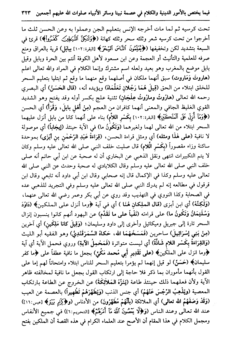 تحت كرسيه ثم لما مات أخرجه الإنس بتعليم الجن وعملوا به وعن الحسن ثلث ما أخرجوا من تحت كرسيه شعر وثلثه سحر وثلثه كهانة (وَلكِنَّ الشَّياطِينَ كَفَرُوا) قرئ في السبعة بتشديد لكن وتخفيفها (يُعَلِّمُونَ النَّاسَ السِّحْرَ [البقرة: 102] ببابل) قرية بالعراق ومنع صرفه للعلمية والتأنيث أو العجمة وعن ابن مسعود لأهل الكوفة أنتم بين الحرة وبابل وقيل بابل موضع بالمغرب وهو بعيد ولعله اسم مشترك وإنما الكلام في المراد والله تعالى اعلم (هاروت وماروت) سبق أنهما ملكان في أصلهما وقع منهما ما وقع ثم ابتليا بتعليم السحر للخلق ابتلاء من الحق (قيل هما رجلان تعلّماه) ويؤيده أنه، (قال الحسن) أي البصري رحمه الله تعالى (هاروت وماروت علجان) تثنية علج بكسر أوله وقد يفتح وهو الشديد القوي الغليظ الجافي والمعنى أنهما كافران من العجم (من أهل بابل، وقرأ) أي الحسن (وَما أُنْزِلَ عَلَى الْمَلَكَيْنِ [الْبَقَرَةِ: 102] بِكَسْرِ اللَّامِ) بناء على أنهما كانا من بابل أنزل عليهما السحر ابتلاء من الله تعالى لهما ولغيرهما (وتكون ما) في الآية حينئذ (إيجابا) أي موصولة لا نافية (على هذا ومثله) أي ومثل قراءة الحسن، (قراءة عبد الرّحمن بن أبزى) بموحدة ساكنة وزاء مقصورا (بكسر الّلام) قال صليت خلف النبي صلى الله تعالى عليه وسلم وكان لا يتم التكبيرات انتهى ونقل الذهبي عن البخاري أن له صحبة عن ابن أبي حاتم أنه صلى خلف النبي صلى الله تعالى عليه وسلم وقال الكلابادي له صحبة وحدث عن النبي صلى الله تعالى عليه وسلم وكذا في الإكمال قال إنه صحابي وقال ابن أبي داود أنه تابعي وقال ابن قرقول في مطالعه إنه لم يدرك النبي صلى الله تعالى عليه وسلم وفي التجريد للذهبي عده في الصحابة وكذا النووي في التهذيب وقد روي عن أبي بكر وعمر رضي الله تعالى عنهما، (ولكنّه) أي ابن أبزى (قال الملكان هنا) أي في آية وَما أُنْزِلَ عَلَى الْمَلَكَيْنِ (داود وسليمان وتكون ما) على قراءته (نفيا على ما تقدّم) عن اليهود أنهم كانوا ينسبون إنزال السحر تارة إلى جبريل وميكائيل وأخرى إلى داود وسليمان؛ (وقيل كانا ملكين) أي آخرين (من بني إسرائيل) ساحرين (فمسخهما الله، حكاه السّمرقنديّ) وهو الفقيه أبو الليث (والقراءة بكسر اللام شاذّة) أي ليست متواترة (فمحمل الآية) وروي فحمل الآية أي آية وَما أُنْزِلَ عَلَى الْمَلَكَيْنِ (على تقدير أبي محمد مكيّ) بجعل ما نافية عطفا على ما كَفَرَ سُلَيْمانُ (حسن) لو قيل إنهما لم يؤمرا بتعليم السحر للناس ابتلاء وامتحانا لهم إما على القول بأنهما مأموران بما ذكر فلا حاجة إلى ارتكاب القول بجعل ما نافية لمخالفته ظاهر الآية ولأن فعلهما ذلك حينئذ طاعة (ينزّه الملائكة) عن الخروج عن الطاعة بارتكاب المعصية (ويذهب الرّجس عنهم) أي جنس الذنب (ويطهّرهم تطهيرا) بالعصمة عن العيب (وقد وصفهم الله تعالى) أي الملائكة (بأنّهم مطهّرون) من الأدناس (وكِرامٍ بَرَرَةٍ [عبس: 16] ) عند الله تعالى وعند الناس (ولا يَعْصُونَ اللَّهَ ما أَمَرَهُمْ [التحريم: 6] ) في جميع الأنفاس ومجمل الكلام في هذا المقام أن الأصح عند العلماء الكرام في هذه القصة أن الملكين بفتح