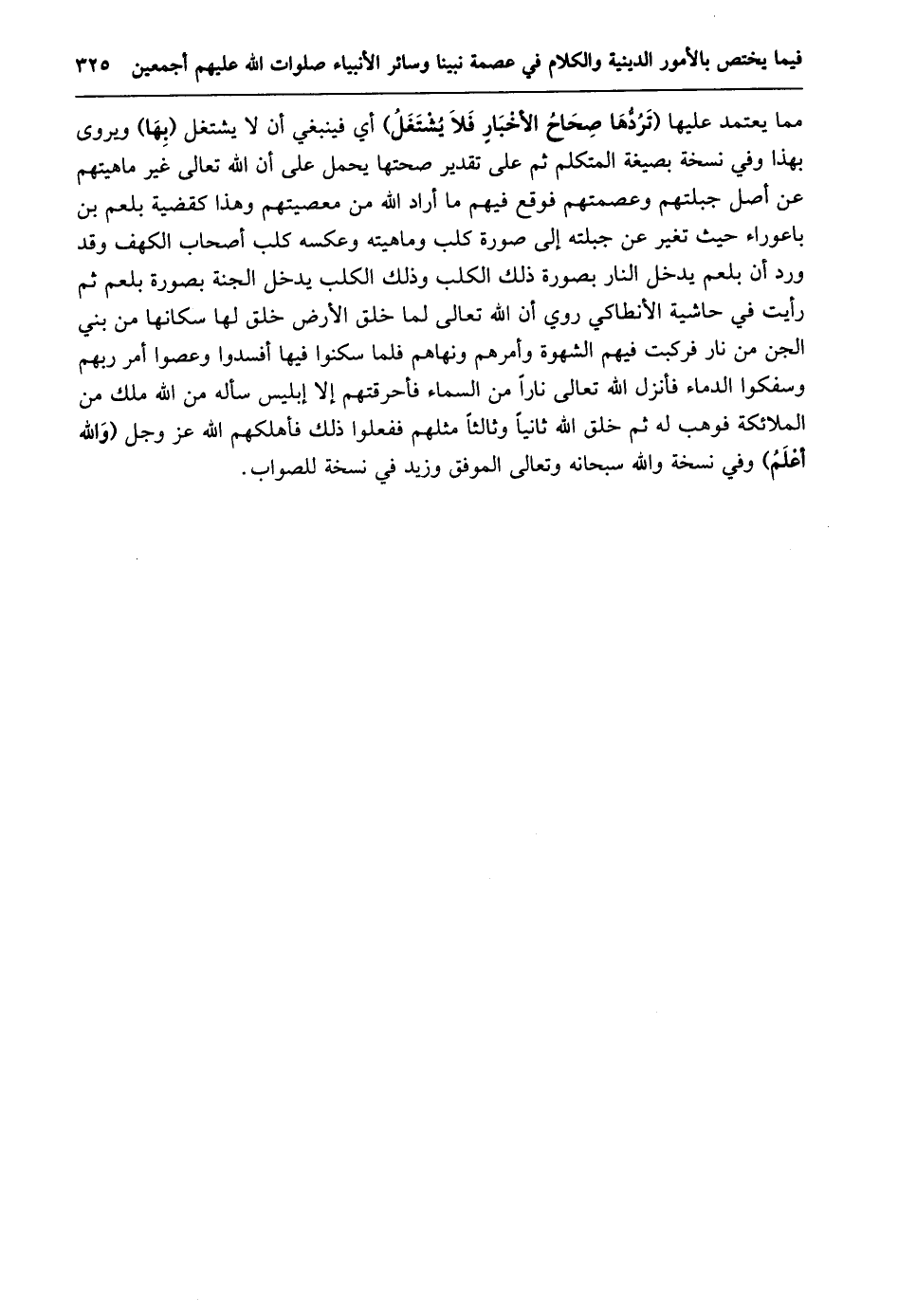 مما يعتمد عليها (تردّها صحاح الأخبار فلا يشتغل) أي فينبغي أن لا يشتغل (بها) ويروى بهذا وفي نسخة بصيغة المتكلم ثم على تقدير صحتها يحمل على أن الله تعالى غير ماهيتهم عن أصل جبلتهم وعصمتهم فوقع فيهم ما أراد الله من معصيتهم وهذا كقضية بلعم بن باعوراء حيث تغير عن جبلته إلى صورة كلب وماهيته وعكسه كلب أصحاب الكهف وقد ورد أن بلعم يدخل النار بصورة ذلك الكلب وذلك الكلب يدخل الجنة بصورة بلعم ثم رأيت في حاشية الأنطاكي روي أن الله تعالى لما خلق الأرض خلق لها سكانها من بني الجن من نار فركبت فيهم الشهوة وأمرهم ونهاهم فلما سكنوا فيها أفسدوا وعصوا أمر ربهم وسفكوا الدماء فأنزل الله تعالى نارا من السماء فأحرقتهم إلا إبليس سأله من الله ملك من الملائكة فوهب له ثم خلق الله ثانيا وثالثا مثلهم ففعلوا ذلك فأهلكهم الله عز وجل (والله أعلم) وفي نسخة والله سبحانه وتعالى الموفق وزيد في نسخة للصواب.