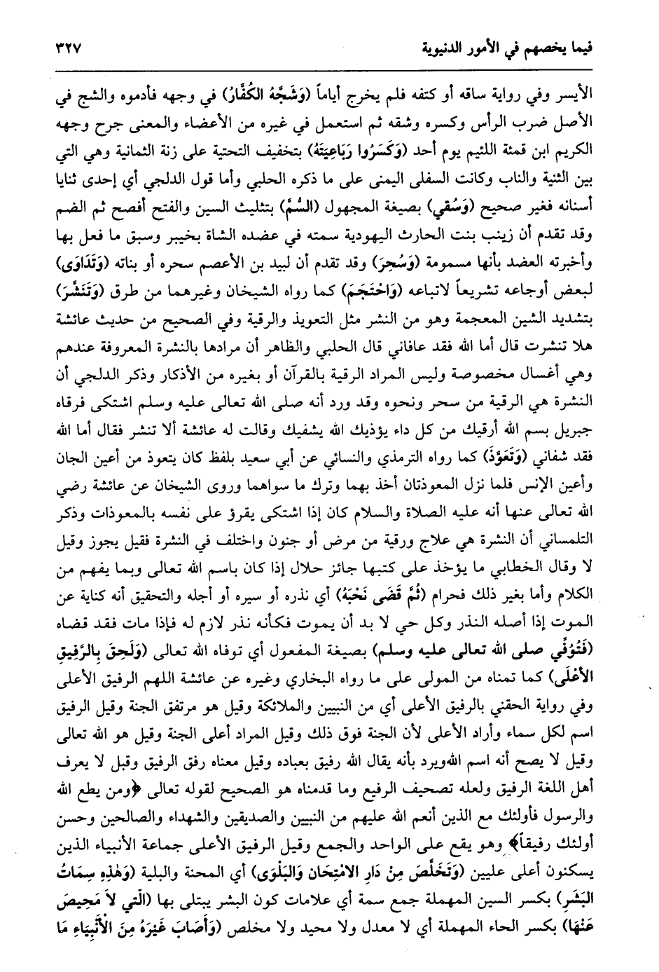 الأيسر وفي رواية ساقه أو كتفه فلم يخرج أياما (وشجّه الكفّار) في وجهه فأدموه والشج في الأصل ضرب الرأس وكسره وشقه ثم استعمل في غيره من الأعضاء والمعنى جرح وجهه الكريم ابن قمئة اللئيم يوم أحد (وكسروا رباعيته) بتخفيف التحتية على زنة الثمانية وهي التي بين الثنية والناب وكانت السفلى اليمنى على ما ذكره الحلبي وأما قول الدلجي أي إحدى ثنايا أسنانه فغير صحيح (وسقي) بصيغة المجهول (السّمّ) بتثليث السين والفتح أفصح ثم الضم وقد تقدم أن زينب بنت الحارث اليهودية سمته في عضده الشاة بخيبر وسبق ما فعل بها وأخبرته العضد بأنها مسمومة (وسحر) وقد تقدم أن لبيد بن الأعصم سحره أو بناته (وتداوى) لبعض أوجاعه تشريعا لاتباعه (واحتجم) كما رواه الشيخان وغيرهما من طرق (وتنشّر) بتشديد الشين المعجمة وهو من النشر مثل التعويذ والرقية وفي الصحيح من حديث عائشة هلا تنشرت قال أما الله فقد عافاني قال الحلبي والظاهر أن مرادها بالنشرة المعروفة عندهم وهي أغسال مخصوصة وليس المراد الرقية بالقرآن أو بغيره من الأذكار وذكر الدلجي أن النشرة هي الرقية من سحر ونحوه وقد ورد أنه صلى الله تعالى عليه وسلم اشتكى فرقاه جبريل بسم الله أرقيك من كل داء يؤذيك الله يشفيك وقالت له عائشة ألا تنشر فقال أما الله فقد شفاني (وتعوّذ) كما رواه الترمذي والنسائي عن أبي سعيد بلفظ كان يتعوذ من أعين الجان وأعين الإنس فلما نزل المعوذتان أخذ بهما وترك ما سواهما وروى الشيخان عن عائشة رضي الله تعالى عنها أنه عليه الصلاة والسلام كان إذا اشتكى يقرؤ على نفسه بالمعوذات وذكر التلمساني أن النشرة هي علاج ورقية من مرض أو جنون واختلف في النشرة فقيل يجوز وقيل لا وقال الخطابي ما يؤخذ على كتبها جائز حلال إذا كان باسم الله تعالى وبما يفهم من الكلام وأما بغير ذلك فحرام (ثمّ قضى نحبه) أي نذره أو سيره أو أجله والتحقيق أنه كناية عن الموت إذا أصله النذر وكل حي لا بد أن يموت فكأنه نذر لازم له فإذا مات فقد قضاه (فتوفّي صلى الله تعالى عليه وسلم) بصيغة المفعول أي توفاه الله تعالى (ولحق بالرّفيق الأعلى) كما تمناه من المولى على ما رواه البخاري وغيره عن عائشة اللهم الرفيق الأعلى وفي رواية الحقني بالرفيق الأعلى أي من النبيين والملائكة وقيل هو مرتفق الجنة وقيل الرفيق اسم لكل سماء وأراد الأعلى لأن الجنة فوق ذلك وقيل المراد أعلى الجنة وقيل هو الله تعالى وقيل لا يصح أنه اسم الله ويرد بأنه يقال الله رفيق بعباده وقيل معناه رفق الرفيق وقبل لا يعرف أهل اللغة الرفيق ولعله تصحيف الرفيع وما قدمناه هو الصحيح لقوله تَعَالَى وَمَنْ يُطِعِ اللَّهَ وَالرَّسُولَ فَأُولئِكَ مَعَ الَّذِينَ أَنْعَمَ اللَّهُ عَلَيْهِمْ مِنَ النَّبِيِّينَ وَالصِّدِّيقِينَ وَالشُّهَداءِ وَالصَّالِحِينَ وَحَسُنَ أُولئِكَ رَفِيقاً وهو يقع على الواحد والجمع وقيل الرفيق الأعلى جماعة الأنبياء الذين يسكنون أعلى عليين (وتخلّص من دار الامتحان والبلوى) أي المحنة والبلية (وهذه سمات البشر) بكسر السين المهملة جمع سمة أي علامات كون البشر يبتلى بها (الّتي لا محيص عنها) بكسر الحاء المهملة أي لا معدل ولا محيد ولا مخلص (وَأَصَابَ غَيْرَهُ مِنَ الْأَنْبِيَاءِ مَا