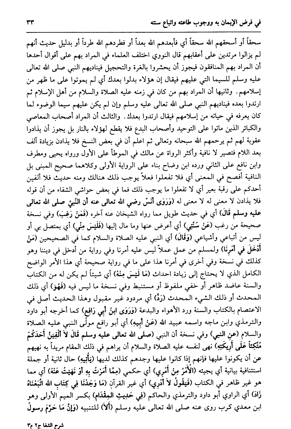 سحقا أو أسحقهم الله سحقا أي فأبعدهم الله بعدا أو فطردهم الله طردا أو بدليل حديث أنهم لم يزالوا مرتدين على أعقابهم قال النووي اختلف العلماء في المراد بهم على أقوال أحدها أن المراد بهم المنافقون فيجوز أن يحشروا بالغرة والتحجيل فيناديهم النبي صلى الله تعالى عليه وسلم للسيما التي عليهم فيقال إن هؤلاء بدلوا بعدك أي لم يموتوا على ما ظهر من إسلامهم. وثانيها أن المراد بهم من كان في زمنه عليه الصلاة والسلام من أهل الإسلام ثم ارتدوا بعده فيناديهم النبي صلى الله تعالى عليه وسلم وإن لم يكن عليهم سيما الوضوء لما كان يعرفه في حياته من إسلامهم فيقال ارتدوا بعدك. والثالث أن المراد أصحاب المعاصي والكبائر الذين ماتوا على التوحيد وأصحاب البدع فلا يقطع لهؤلاء بالنار بل يجوز أن يذادوا عقوبة لهم ثم يرحمهم الله سبحانه وتعالى ثم اعلم أن في بعض النسخ فلا يذادن بزيادة ألف بعد اللام فتصير لا نافية وأكثر الرواة عن مالك في الموطا على الأول ورواه يحيى ومطرف وابن نافع على الثاني ورده ابن وضاح بناء على الرواية الأولى وكلاهما صحيح المبنى بل النافية أفصح في المعنى أي فلا تفعلوا فعلا يوجب ذلك هنالك ومنه حديث فلا ألفين أحدكم على رقبة بعير أي لا تفعلوا ما يوجب ذلك فما في بعض حواشي الشفاء من أن قوله فلا يذادن لا معنى له لا معنى له (وروى أنس رضي الله تعالى عنه أن النّبيّ صلى الله تعالى عليه وسلم قال) أي في حديث طويل مما رواه الشيخان عنه آخره (فمن رغب) وفي نسخة صحيحة من رغب (عن سنّتي) أي أعرض عنها وما مال إليها (فليس منّي) أي بمتصل بي أو ليس من أتباعي وأشياعي (وقال) أي النبي عليه الصلاة والسلام كما في الصحيحين (من أدخل في أمرنا) ولمسلم من عمل عملا ليس عليه أمرنا وفي رواية من أدخل فى ديننا وهو كذلك في نسخة وفي أخرى في أمرنا هذا على ما في رواية صحيحة أي هذا الأمر الواضح الكامل الذي لا يحتاج إلى زيادة احداث (ما ليس منه) أي شيئا لم يكن له من الكتاب والسنة عاضد ظاهر أو خفي ملفوظ أو مستنبط وفي نسخة ما ليس فيه (فهو) أي ذلك المحدث أو ذلك الشيء المحدث (ردّ) أي مردود غير مقبول وهذا الحديث أصل في الاعتصام بالكتاب والسنة ورد الأهواء والبدعة (وروى ابن أبي رافع) كما أخرجه أبو داود والترمذي وابن ماجه واسمه عبيد الله (عن أبيه) أي أبو رافع مولى النبي عليه الصلاة والسلام (عن النبي) وفي نسخة أن النبي (صلى الله تعالى عَلَيْهِ وَسَلَّمَ قَالَ لَا أَلْفَيَنَّ أَحَدَكُمْ مُتَّكِئًا على أريكته) نهى لنفسه عليه الصلاة والسلام أن يراهم في ذلك المقام مريدا به نهيهم عن أن يكونوا عليها فإنهم إذا كانوا عليها وجدهم كذلك لديها (يأتيه) حال ثانية أو جملة استئنافية بيانية أي يجيئه (الأمر من أمري) أي حكمي (ممّا أمرت به أو نهيت عنه) أي مما هو غير ظاهر في الكتاب (فيقول لا أدري) أي غير القرآن (مَا وَجَدْنَا فِي كِتَابِ اللَّهِ اتَّبَعْنَاهُ زَادَ) أي الراوي أبو داود والترمذي والحاكم (في حديث المقدام) بكسر الميم الأولى وهو ابن معدي كرب روى عنه صلى الله تعالى عليه وسلم (ألا) للتنبيه (وَإِنَّ مَا حَرَّمَ رَسُولُ