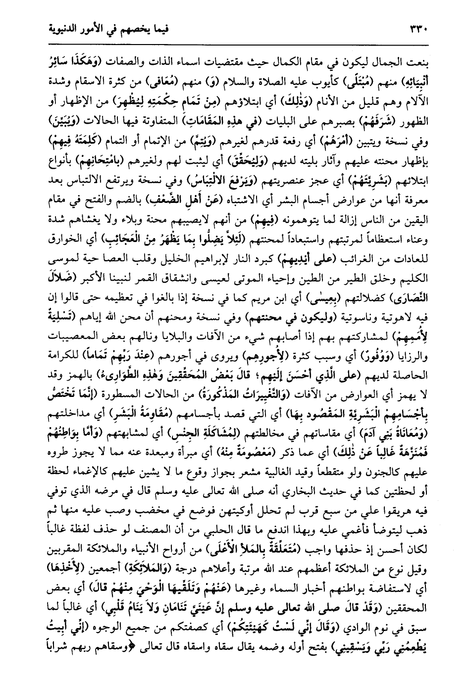 بنعت الجمال ليكون في مقام الكمال حيث مقتضيات اسماء الذات والصفات (وهكذا سائر أنبيائه) منهم (مبتلّى) كأيوب عليه الصلاة والسلام (و) منهم (معافى) من كثرة الاسقام وشدة الآلام وهم قليل من الأنام (وذلك) أي ابتلاؤهم (من تمام حكمته ليظهر) من الإظهار أو الظهور (شرفهم) بصبرهم على البليات (في هذه المقامات) المتفاوتة فيها الحالات (ويبيّن) وفي نسخة ويتبين (أمرهم) أي رفعة قدرهم لغيرهم (ويتمّ) من الإتمام أو التمام (كلمته فيهم) بإظهار محنته عليهم وآثار بليته لديهم (وليحقّق) أي ليثبت لهم ولغيرهم (بامتحانهم) بأنواع ابتلائهم (بشريّتهم) أي عجز عنصريتهم (ويرفع الالتباس) وفي نسخة ويرتفع الالتباس بعد معرفة أنها من عوارض أجسام البشر أي الاشتباه (عن أهل الضّعف) بالضم والفتح في مقام اليقين من الناس إزالة لما يتوهمونه (فيهم) من أنهم لا يصيبهم محنة وبلاء ولا يغشاهم شدة وعناء استعظاما لمرتبتهم واستبعادا لمحنتهم (لئلّا يضلّوا بما يظهر من العجائب) أي الخوارق للعادات من الغرائب (على أيديهم) كبرد النار لإبراهيم الخليل وقلب العصاحية لموسى الكليم وخلق الطير من الطين وإحياء الموتى لعيسى وانشقاق القمر لنبينا الأكبر (ضلال النّصارى) كضلالتهم (بعيسى) أي ابن مريم كما في نسخة إذا بالغوا في تعظيمه حتى قالوا إن فيه لاهوتية وناسوتية (وليكون في محنتهم) وفي نسخة ومحنهم أن محن الله إياهم (تسلية لأممهم) لمشاركتهم بهم إذا أصابهم شيء من الآفات والبلايا ونالهم بعض المعصيبات والرزايا (ووفور) أي وسبب كثرة (لأجورهم) ويروى في أجورهم (عند ربّهم تماما) للكرامة الحاصلة لديهم (عَلَى الَّذِي أَحْسَنَ إِلَيْهِمْ؛ قَالَ بَعْضُ الْمُحَقِّقِينَ وهذه الطّوارىء) بالهمز وقد لا يهمز أي العوارض من الآفات (والتّغييرات المذكورة) من الحالات المسطورة (إنّما تختصّ بأجسامهم البشريّة المقصود بها) أي التي قصد بأجسامهم (مقاومة البشر) أي مداخلتهم (ومعاناة بني آدم) أي مقاساتهم في مخالطتهم (لمشاكلة الجنس) أي لمشابهتهم (وأمّا بواطنهم فمنزّهة غالبا عن ذلك) أي عما ذكر (معصومة منه) أي مبرأة ومبعدة عنه مما لا يجوز طروه عليهم كالجنون ولو متقطعا وقيد الغالبية مشعر بجواز وقوع ما لا يشين عليهم كالإغماء لحظة أو لحظتين كما في حديث البخاري أنه صلى الله تعالى عليه وسلم قال في مرضه الذي توفي فيه هريقوا علي من سبع قرب لم تحلل أوكيتهن فوضع في مخضب وصب عليه منها ثم ذهب ليتوضأ فأغمي عليه وبهذا اندفع ما قال الحلبي من أن المصنف لو حذف لفظة غالبا لكان أحسن إذ حذفها واجب (متعلّقة بالملأ الأعلى) من أرواح الأنبياء والملائكة المقربين وقيل نوع من الملائكة أعظمهم عند الله مرتبة وأعلاهم درجة (والملائكة) أجمعين (لأخذها) أي لاستفاضة بواطنهم أخبار السماء وغيرها (عنهم وتلقّيها الوحي منهم قال) أي بعض المحققين (وقد قال صلى الله تعالى عَلَيْهِ وَسَلَّمَ إِنَّ عَيْنَيَّ تَنَامَانِ وَلَا يَنَامُ قلبي) أي غالبا لما سبق في نوم الوادي (وقال إنّي لست كهيئتكم) أي كصفتكم من جميع الوجوه (إنّي أبيت يطعمني ربّي ويسقيني) بفتح أوله وضمه يقال سقاه واسقاه قال تعالى وَسَقاهُمْ رَبُّهُمْ شَراباً