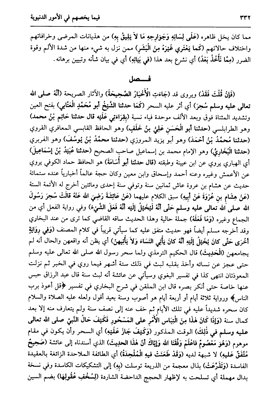 (فإن قلت فقد) ويروى قد (جاءت الأخبار الصّحيحة) والآثار الصريحة (أنّه صلى الله تعالى عليه وسلم سحر) أي أثر عليه السحر (كما حدثنا الشّيخ أبو محمّد العتّابي) بفتح العين وتشديد المثناة فوق وبعد الألف موحدة فياء نسبة (بقراءتي عليه قال حدثنا حاتم بن محمد) وهو الطرابلسي (حدثنا أبو الحسن عليّ بن خلف) وهو الحافظ القابسي المعافري القروي (حدثنا محمّد بن أحمد) وهو أبو يزيد المروزي (حدثنا محمّد بن يوسف) وهو الفربري (حدثنا البخاريّ) وهو الإمام محمد بن إسماعيل صاحب الصحيح (حدثنا عبيد بن إسماعيل) أي الهباري يروي عن ابن عيينة وطبقته (قال حدثنا أبو أسامة) هو الحافظ حماد الكوفي يروي عن الأعمش وغيره وعنه أحمد وإسحاق وابن معين وكان حجة عالما أخباريا عنده ستمائة حديث عن هشام بن عروة عاش ثمانين سنة وتوفي سنة إحدى ومائتين أخرج له الأئمة الستة (عن هشام بن عروة عن أبيه) سبق الكلام عليهما (عن عائشة رضي الله عنه قالت سحر رسول الله صلى الله تعالى عَلَيْهِ وَسَلَّمَ حَتَّى إِنَّهُ لَيُخَيَّلُ إِلَيْهِ أَنَّهُ فعل الشّيء) وفي رواية الفعل أي من الجماع وغيره (وما فعله) جملة حالية وهذا الحديث ساقه القاضي كما ترى من عند البخاري وقد أخرجه مسلم أيضا فهو حديث متفق عليه كما سيأتي قريبا في كلام المصنف (وَفِي رِوَايَةٍ أُخْرَى حَتَّى كَانَ يُخَيَّلُ إِلَيْهِ أنّه كان يأتي النساء ولا يأتيهنّ) أي يظن أنه واقعهن والحال أنه لم يجامعهن (الحديث) قال الحكيم الترمذي ولما سحر رسول الله صلى الله تعالى عليه وسلم حتى عجز عن نسائه وأخذ بقلبه لبث في ذلك ستة أشهر فيما روي في الخبر ثم نزلت المعوذتان انتهى كذا في تفسير البغوي وسيأتي عن عائشة أنه لبث سنة قال عبد الرزاق حبس عنها خاصة حتى أنكر بصره قال ابن الملقن في شرح البخاري في تفسير قُلْ أَعُوذُ بِرَبِّ النَّاسِ ورواية ثلاثة أيام أو أربعة أيام هو أصوب وسنة بعيد أقول ولعله عليه الصلاة والسلام كان سحره شديدا عليه في تلك الأيام ثم خف عنه إلى نصف سنة ولم يتعارف منه إلا بعد كمال سنة (وَإِذَا كَانَ هَذَا مِنَ الْتِبَاسِ الْأَمْرِ عَلَى المسحور فكيف حال النّبيّ صلى الله تعالى عليه وسلم في ذلك) الوقت المذكور (وكيف جاز عليه) أي السحر وأن يكون في مقام موهوم (وَهُوَ مَعْصُومٌ فَاعْلَمْ وَفَّقَنَا اللَّهُ وَإِيَّاكَ أَنَّ هذا الحديث) الذي أسندناه إلى عائشة (صحيح متّفق عليه) لا شبهة لديه (وقد طعنت فيه الملحدة) أي الطائفة الملاحدة الزائغة بالعقيدة الفاسدة (وتذرّعت) بذال معجمة من الذريعة توسلت (به) إلى التشكيكات الكاسدة وفي نسخة بدال مهملة أي تسلحت به لإظهار الحجج الداحضة الشاردة (لسخف عقولها) بضم السين