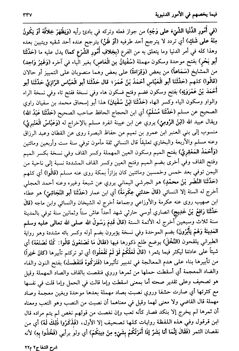 (في أمور الدّنيا الشّيء على وجه) من جواز فعله وتركه في بادئ رأيه (وَيَظْهَرُ خِلَافُهُ أَوْ يَكُونُ مِنْهُ عَلَى شَكٍّ) أي تردد لا يترجح أحد طرفيه (أو ظنّ) يترجح عنده أحد شقيه ويتبين بعده وهذا كله في أمر الدنيا وما يتعلق به من الفرع (بخلاف أمور الشّرع كما) يدل عليه ما (حدّثنا أبو بحر) بفتح موحدة وسكون مهملة (سفيان بن العاص) بغير الياء في آخره (وغير واحد) من المشايخ (سماعا) من بعض (وقراءة) على بعض وهما منصوبان على التمييز أو حالان (قالوا) كلهم (حَدَّثَنَا أَبُو الْعَبَّاسِ أَحْمَدُ بْنُ عُمَرَ؛ قَالَ حَدَّثَنَا أَبُو الْعَبَّاسِ الرَّازِيُّ حَدَّثَنَا أَبُو أَحْمَدَ بن عمرويه) بفتح وسكون فضم وفتح فسكون هاء وفي نسخة ففتح تاء وفي نسخة الراء والواو وسكون الياء وكسر الهاء (حدّثنا ابن سفيان) هذا أبو إسحاق محمد بن سفيان راوي الصحيح عن مسلم (حدّثنا مسلم) أي ابن الحجاج الحافظ صاحب الصحيح (حدّثنا عبد الله) ويقال عبيد الله (ابن الرّوميّ) يروي عن ابن عيينة انفرد مسلم بالإخراج له (وعبّاس العنبريّ) منسوب إلى بني العنبر ابن عمرو بن تميم من حفاظ البصرة روى عن القطان وعبد الرزاق وعنه مسلم والأربعة والبخاري تعليقا قال النسائي ثقة مأمون توفي سنة ست وأربعين ومائتين (وأحمد المعقريّ) بفتح الميم وسكون العين المهملة وكسر القاف وفي نسخة بكسر الميم وفتح القاف وفي أخرى بضم الميم وفتح العين وكسر القاف المشددة نسبة إلى ناحية من اليمن توفي بعد خمس وخمسين ومائتين كان بزازا بمكة روى عنه مسلم (قالوا) أي كلهم (حدّثنا النّضر بن محمّد) هو الجرشي اليماني يروي عن شبعة وغيره وعنه أحمد العجلي أخرج له الستة إلا النسائي (قال حدثني عكرمة) أي ابن عمار (حدّثنا أبو النّجاشيّ) هو عطاء ابن صهيب روى عنه عكرمة والأوزاعي وجماعة أخرج له الشيخان والنسائي وابن ماجه (قال حدّثنا رافع بن خديج) انصاري أوسي حارثي شهد أحدا عاش ستا وثمانين سنة توفي بالمدينة سنة ثلاث وسبعين أخرج له الأئمة الستة (قال قدم رسول الله صلى الله تعالى عليه وسلم المدينة وهم يأبرون) بضم الموحدة وفي نسخة يؤبرون بضم أوله وكسر بائه مشددة وهو رواية الطبراني يلقحون (النّخل) بوضع طلع ذكورها فيها (فقال ما تصنعون قالوا: كنّا نصنعه) أي شيئا على عادتنا ليكثر فيما يثمر؛ (قال لعلّكم لو لم تفعلوا) أي لو تركتم تأبيرها (كان خيرا) من تأبيرها بناء على هدم المعالجة في تدبير تأثيرها (فتركوه فنفضت) بفتح النون والفاء والضاد المعجمة أي أسقطت حملها من ثمرها وروي فنقصت بالقاف والصاد المهملة وقيل هو تصحيف وعلى تقدير صحته أما بمعنى اسقطت وإما قالت في الحمل وإما قلت في نفسها مع كثرتها أي صارت حشفا وروي نصبت بصاد مهملة بعدها موحدة وبغين معجمة وصاد مهملة قال القاضي ولا معنى لهما وقيل في معناهما أن نصبت من النصب وهو التعب ومعناه أن ثمرها لم يخرج إلا بنكد فصار كأنه تعب وإن نغصت من قولهم نغص لم يتم مراده قال ابن قرقول وفي هذه اللفظة روايات كلها تصحيف إلا الأول، (فذكروا ذلك له) أي من نقصان الثمر (فَقَالَ إِنَّمَا أَنَا بَشَرٌ إِذَا أَمَرْتُكُمْ بِشَيْءٍ من دينكم) أي ولو برأيي (فخذوا به) لأنه