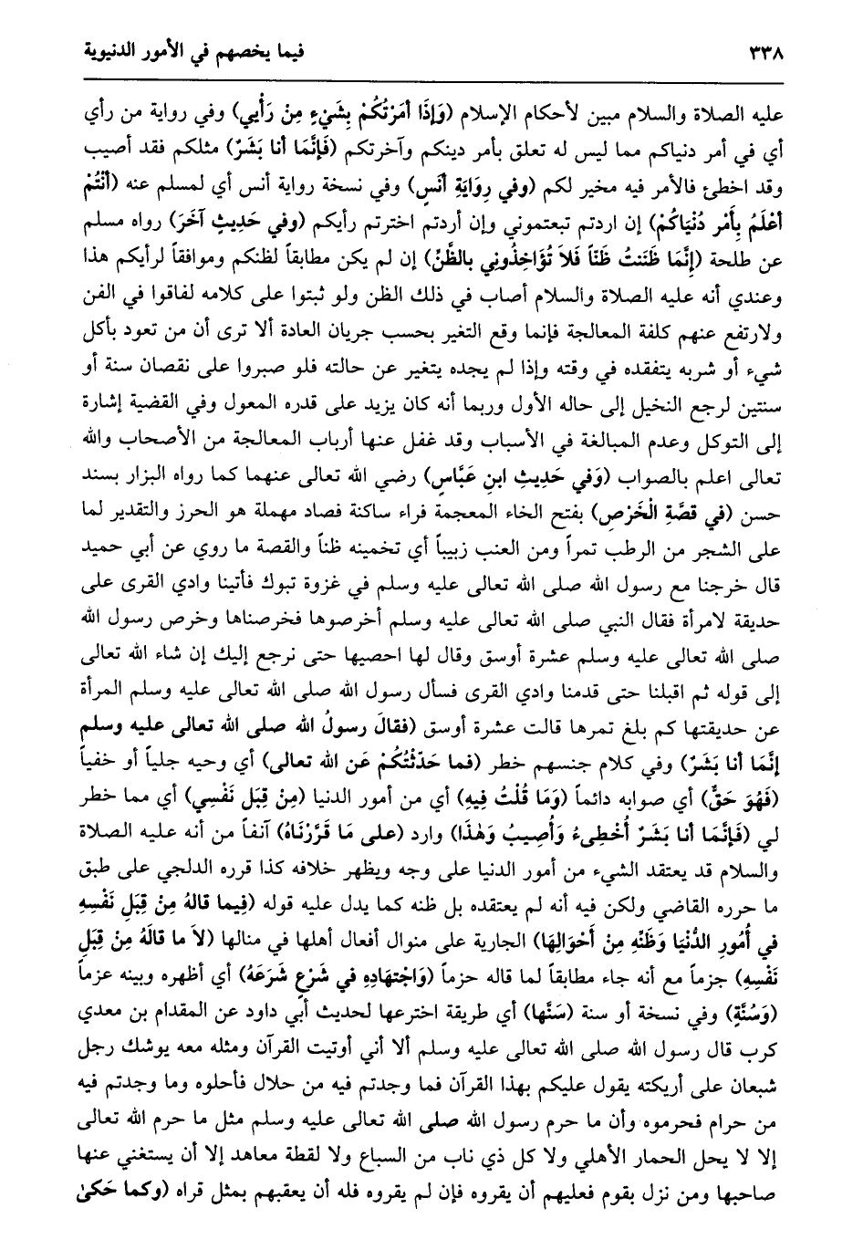عليه الصلاة والسلام مبين لأحكام الإسلام (وإذا أمرتكم بشيء من رأيي) وفي رواية من رأي أي في أمر دنياكم مما ليس له تعلق بأمر دينكم وآخرتكم (فإنّما أنا بشر) مثلكم فقد أصيب وقد اخطئ فالأمر فيه مخير لكم (وفي رواية أنس) وفي نسخة رواية أنس أي لمسلم عنه (أنتم أعلم بأمر دنياكم) إن اردتم تبعتموني وإن أردتم اخترتم رأيكم (وفي حديث آخر) رواه مسلم عن طلحة (إنّما ظننت ظنّا فلا تؤاخذوني بالظّنّ) إن لم يكن مطابقا لظنكم وموافقا لرأيكم هذا وعندي أنه عليه الصلاة والسلام أصاب في ذلك الظن ولو ثبتوا على كلامه لفاقوا في الفن ولارتفع عنهم كلفة المعالجة فإنما وقع التغير بحسب جريان العادة ألا ترى أن من تعود بأكل شيء أو شربه يتفقده في وقته وإذا لم يجده يتغير عن حالته فلو صبروا على نقصان سنة أو سنتين لرجع النخيل إلى حاله الأول وربما أنه كان يزيد على قدره المعول وفي القضية إشارة إلى التوكل وعدم المبالغة في الأسباب وقد غفل عنها أرباب المعالجة من الأصحاب والله تعالى اعلم بالصواب (وفي حديث ابن عبّاس) رضي الله تعالى عنهما كما رواه البزار بسند حسن (في قصّة الخرص) بفتح الخاء المعجمة فراء ساكنة فصاد مهملة هو الحرز والتقدير لما على الشجر من الرطب تمرا ومن العنب زبيبا أي تخمينه ظنا والقصة ما روي عن أبي حميد قال خرجنا مع رسول الله صلى الله تعالى عليه وسلم في غزوة تبوك فأتينا وادي القرى على حديقة لامرأة فقال النبي صلى الله تعالى عليه وسلم أخرصوها فخرصناها وخرص رسول الله صلى الله تعالى عليه وسلم عشرة أوسق وقال لها احصيها حتى نرجع إليك إن شاء الله تعالى إلى قوله ثم اقبلنا حتى قدمنا وادي القرى فسأل رسول الله صلى الله تعالى عليه وسلم المرأة عن حديقتها كم بلغ تمرها قالت عشرة أوسق (فقال رسول الله صلى الله تعالى عليه وسلم إنّما أنا بشر) وفي كلام جنسهم خطر (فما حدّثتكم عن الله تعالى) أي وحيه جليا أو خفيا (فهو حقّ) أي صوابه دائما (وما قلت فيه) أي من أمور الدنيا (من قبل نفسي) أي مما خطر لي (فإنّما أنا بشر أخطىء وأصيب وهذا) وارد (على ما قرّرناه) آنفا من أنه عليه الصلاة والسلام قد يعتقد الشيء من أمور الدنيا على وجه ويظهر خلافه كذا قرره الدلجي على طبق ما حرره القاضي ولكن فيه أنه لم يعتقده بل ظنه كما يدل عليه قوله (فِيمَا قَالَهُ مِنْ قِبَلِ نَفْسِهِ فِي أُمُورِ الدّنيا وظنّه من أحوالها) الجارية على منوال أفعال أهلها في منالها (لا ما قاله من قبل نفسه) جزما مع أنه جاء مطابقا لما قاله حزما (واجتهاده في شرع شرعه) أي أظهره وبينه عزما (وسنّة) وفي نسخة أو سنة (سنّها) أي طريقة اخترعها لحديث أبي داود عن المقدام بن معدي كرب قال رسول الله صلى الله تعالى عليه وسلم ألا أني أوتيت القرآن ومثله معه يوشك رجل شبعان على أريكته يقول عليكم بهذا القرآن فما وجدتم فيه من حلال فأحلوه وما وجدتم فيه من حرام فحرموه وَإِنَّ مَا حَرَّمَ رَسُولُ اللَّهِ صَلَّى اللَّهُ تعالى عليه وسلم مثل ما حرم الله تعالى إلا لا يحل الحمار الأهلي ولا كل ذي ناب من السباع ولا لقطة معاهد إلا أن يستغني عنها صاحبها ومن نزل بقوم فعليهم أن يقروه فإن لم يقروه فله أن يعقبهم بمثل قراه (وكما حكى