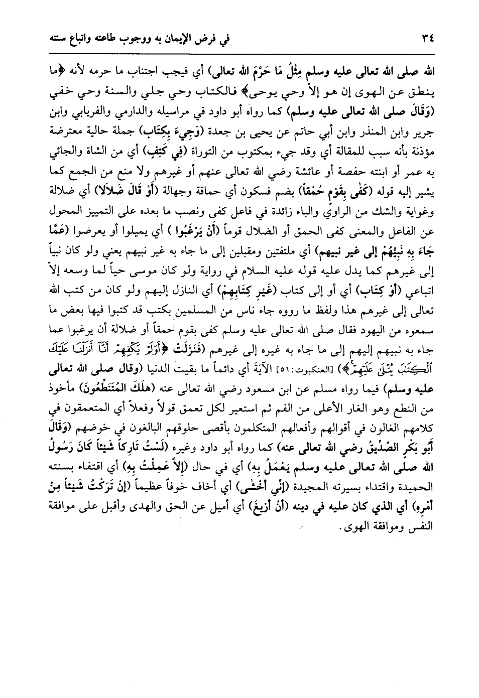 الله صلى الله تعالى عليه وسلم مثل ما حرّم الله تعالى) أي فيجب اجتناب ما حرمه لأنه ما يَنْطِقُ عَنِ الْهَوى إِنْ هُوَ إِلَّا وَحْيٌ يُوحى فالكتاب وحي جلي والسنة وحي خفي (وقال صلى الله تعالى عليه وسلم) كما رواه أبو داود في مراسيله والدارمي والفريابي وابن جرير وابن المنذر وابن أبي حاتم عن يحيى بن جعدة (وجيء بكتاب) جملة حالية معترضة مؤذنة بأنه سبب للمقالة أي وقد جيء بمكتوب من التوراة (في كتف) أي من الشاة والجائي به عمر أو ابنته حفصة أو عائشة رضي الله تعالى عنهم أو غيرهم ولا منع من الجمع كما يشير إليه قوله (كفى بقوم حمقا) بضم فسكون أي حماقة وجهالة (أو قال ضلالا) أي ضلالة وغواية والشك من الراويّ والباء زائدة في فاعل كفى ونصب ما بعده على التمييز المحول عن الفاعل والمعنى كفى الحمق أو الضلال قوما (أن يرغبوا) أي يميلوا أو يعرضوا (عَمَّا جَاءَ بِهِ نَبِيُّهُمْ إِلَى غَيْرِ نَبِيِّهِمْ) أي ملتفتين ومقبلين إلى ما جاء به غير نبيهم يعني ولو كان نبيا إلى غيرهم كما يدل عليه قوله عليه السلام في رواية ولو كان موسى حيا لما وسعه إلّا اتباعي (أو كتاب) أي أو إلى كتاب (غير كتابهم) أي النازل إليهم ولو كان من كتب الله تعالى إلى غيرهم هذا ولفظ ما رووه جاء ناس من المسلمين بكتب قد كتبوا فيها بعض ما سمعوه من اليهود فقال صلى الله تعالى عليه وسلم كفى بقوم حمقا أو ضلالة أن يرغبوا عما جاء به نبيهم إليهم إلى ما جاء به غيره إلى غيرهم (فَنَزَلَتْ أَوَلَمْ يَكْفِهِمْ أَنَّا أَنْزَلْنا عَلَيْكَ الْكِتابَ يُتْلى عَلَيْهِمْ) [العنكبوت: 51] الآية أي دائما ما بقيت الدنيا (وقال صلى الله تعالى عليه وسلم) فيما رواه مسلم عن ابن مسعود رضي الله تعالى عنه (هلك المتنطّعون) مأخوذ من النطع وهو الغار الأعلى من الفم ثم استعير لكل تعمق قولا وفعلا أي المتعمقون في كلامهم الغالون في أقوالهم وأفعالهم المتكلمون بأقصى حلوقهم البالغون في خوضهم (وقال أبو بكر الصّدّيق رضي الله تعالى عنه) كما رواه أبو داود وغيره (لَسْتُ تَارِكًا شَيْئًا كَانَ رَسُولُ اللَّهِ صَلَّى الله تعالى عليه وسلم يعمل به) أي في حال (إلّا عملت به) أي اقتفاء بسنته الحميدة واقتداء بسيرته المجيدة (إنّي أخشى) أي أخاف خوفا عظيما (إن تركت شيئا من أمره) أي الذي كان عليه في دينه (أن أزيغ) أي أميل عن الحق والهدى وأقبل على موافقة النفس وموافقة الهوى.