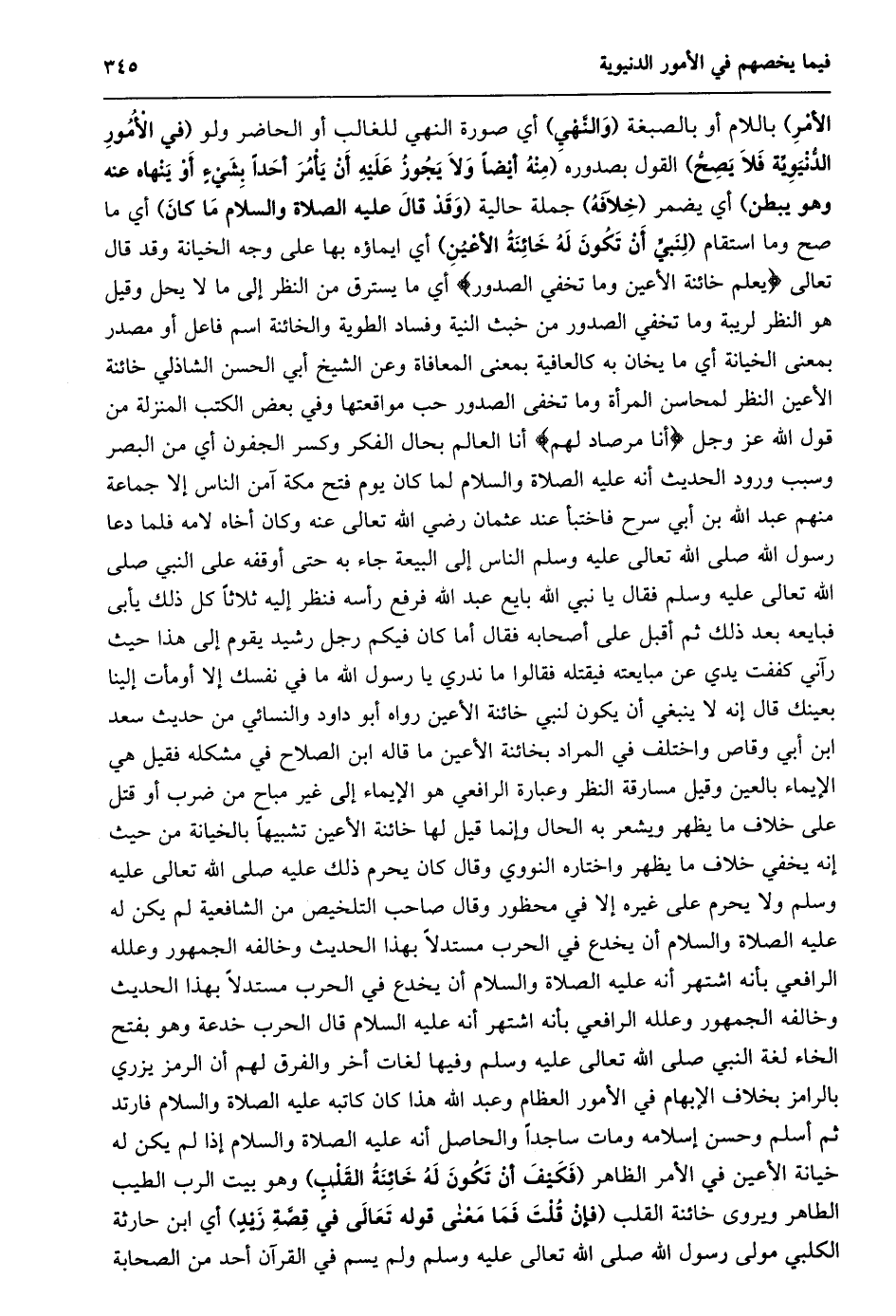الأمر) باللام أو بالصبغة (والنّهي) أي صورة النهي للغالب أو الحاضر ولو (في الأمور الدّنيويّة فلا يصحّ) القول بصدوره (مِنْهُ أَيْضًا وَلَا يَجُوزُ عَلَيْهِ أَنْ يَأْمُرَ أحدا بشيء أو ينهاه عنه وهو يبطن) أي يضمر (خلافه) جملة حالية (وقد قال عليه الصلاة والسلام ما كان) أي ما صح وما استقام (لنبيّ أن تكون له خائنة الأعين) أي ايماؤه بها على وجه الخيانة وقد قال تعالى يَعْلَمُ خائِنَةَ الْأَعْيُنِ وَما تُخْفِي الصُّدُورُ أي ما يسترق من النظر إلى ما لا يحل وقيل هو النظر لريبة وما تخفي الصدور من خبث النية وفساد الطوية والخائنة اسم فاعل أو مصدر بمعنى الخيانة أي ما يخان به كالعافية بمعنى المعافاة وعن الشيخ أبي الحسن الشاذلي خائنة الأعين النظر لمحاسن المرأة وما تخفى الصدور حب مواقعتها وفي بعض الكتب المنزلة من قول الله عز وجل (أنا مرصد لهم) أنا العالم بحال الفكر وكسر الجفون أي من البصر وسبب ورود الحديث أنه عليه الصلاة والسلام لما كان يوم فتح مكة آمن الناس إلا جماعة منهم عبد الله بن أبي سرح فاختبأ عند عثمان رضي الله تعالى عنه وكان أخاه لامه فلما دعا رسول الله صلى الله تعالى عليه وسلم الناس إلى البيعة جاء به حتى أوقفه على النبي صلى الله تعالى عليه وسلم فقال يا نبي الله بايع عبد الله فرفع رأسه فنظر إليه ثلاثا كل ذلك يأبى فبايعه بعد ذلك ثم أقبل على أصحابه فقال أما كان فيكم رجل رشيد يقوم إلى هذا حيث رآني كففت يدي عن مبايعته فيقتله فقالوا ما ندري يا رسول الله ما في نفسك إلا أومأت إلينا بعينك قال إنه لا ينبغي أن يكون لنبي خائنة الأعين رواه أبو داود والنسائي من حديث سعد ابن أبي وقاص واختلف في المراد بخائنة الأعين ما قاله ابن الصلاح في مشكله فقيل هي الإيماء بالعين وقيل مسارقة النظر وعبارة الرافعي هو الإيماء إلى غير مباح من ضرب أو قتل على خلاف ما يظهر ويشعر به الحال وإنما قيل لها خائنة الأعين تشبيها بالخيانة من حيث إنه يخفي خلاف ما يظهر واختاره النووي وقال كان يحرم ذلك عليه صلى الله تعالى عليه وسلم ولا يحرم على غيره إلا في محظور وقال صاحب التلخيص من الشافعية لم يكن له عليه الصلاة والسلام أن يخدع في الحرب مستدلا بهذا الحديث وخالفه الجمهور وعلله الرافعي بأنه اشتهر أنه عليه الصلاة والسلام أن يخدع في الحرب مستدلا بهذا الحديث وخالفه الجمهور وعلله الرافعي بأنه اشتهر أنه عليه السلام قال الحرب خدعة وهو بفتح الخاء لغة النبي صلى الله تعالى عليه وسلم وفيها لغات أخر والفرق لهم أن الرمز يزري بالرامز بخلاف الإبهام في الأمور العظام وعبد الله هذا كان كاتبه عليه الصلاة والسلام فارتد ثم أسلم وحسن إسلامه ومات ساجدا والحاصل أنه عليه الصلاة والسلام إذا لم يكن له خيانة الأعين في الأمر الظاهر (فكيف أن تكون له خائنة القلب) وهو بيت الرب الطيب الطاهر ويروى خائنة القلب (فَإِنْ قُلْتَ فَمَا مَعْنَى قَوْلِهِ تَعَالَى فِي قصّة زيد) أي ابن حارثة الكلبي مولى رسول الله صلى الله تعالى عليه وسلم ولم يسم في القرآن أحد من الصحابة