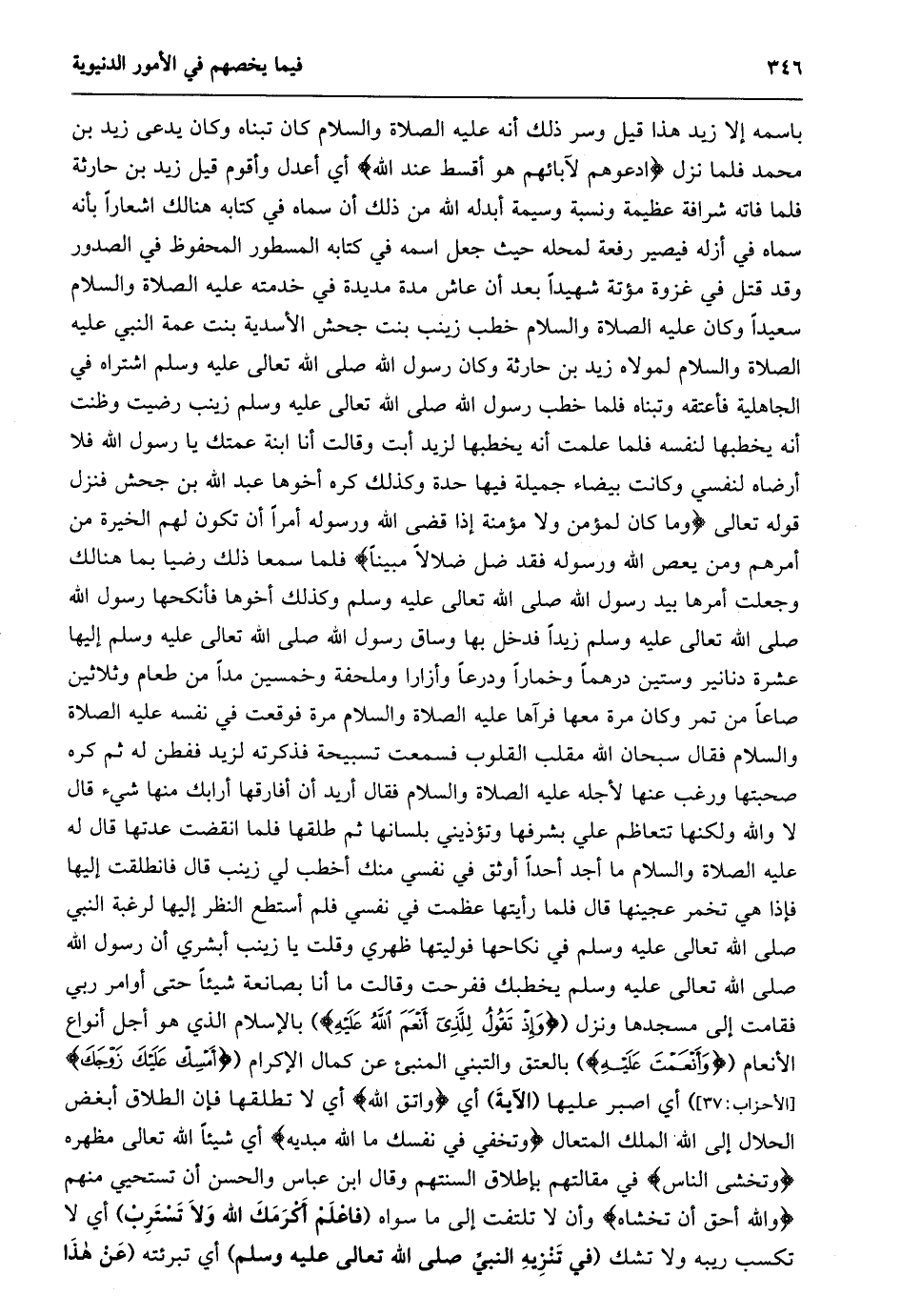 باسمه إلا زيد هذا قيل وسر ذلك أنه عليه الصلاة والسلام كان تبناه وكان يدعى زيد بن محمد فلما نزل ادْعُوهُمْ لِآبائِهِمْ هُوَ أَقْسَطُ عِنْدَ اللَّهِ أي أعدل وأقوم قيل زيد بن حارثة فلما فاته شرافة عظيمة ونسبة وسيمة أبدله الله من ذلك أن سماه في كتابه هنالك اشعارا بأنه سماه في أزله فيصير رفعة لمحله حيث جعل اسمه في كتابه المسطور المحفوظ في الصدور وقد قتل في غزوة مؤتة شهيدا بعد أن عاش مدة مديدة في خدمته عليه الصلاة والسلام سعيدا وكان عليه الصلاة والسلام خطب زينب بنت جحش الأسدية بنت عمة النبي عليه الصلاة والسلام لمولاه زيد بن حارثة وكان رسول الله صلى الله تعالى عليه وسلم اشتراه في الجاهلية فأعتقه وتبناه فلما خطب رسول الله صلى الله تعالى عليه وسلم زينب رضيت وظنت أنه يخطبها لنفسه فلما علمت أنه يخطبها لزيد أبت وقالت أنا ابنة عمتك يا رسول الله فلا أرضاه لنفسي وكانت بيضاء جميلة فيها حدة وكذلك كره أخوها عبد الله بن جحش فنزل قوله تعالى وَما كانَ لِمُؤْمِنٍ وَلا مُؤْمِنَةٍ إِذا قَضَى اللَّهُ وَرَسُولُهُ أَمْراً أَنْ يَكُونَ لَهُمُ الْخِيَرَةُ مِنْ أَمْرِهِمْ وَمَنْ يَعْصِ اللَّهَ وَرَسُولَهُ فَقَدْ ضَلَّ ضَلالًا مُبِيناً فلما سمعا ذلك رضيا بما هنالك وجعلت أمرها بيد رسول الله صلى الله تعالى عليه وسلم وكذلك أخوها فأنكحها رسول الله صلى الله تعالى عليه وسلم زيدا فدخل بها وساق رسول الله صلى الله تعالى عليه وسلم إليها عشرة دنانير وستين درهما وخمارا ودرعا وأزارا وملحفة وخمسين مدا من طعام وثلاثين صاعا من تمر وكان مرة معها فرآها عليه الصلاة والسلام مرة فوقعت في نفسه عليه الصلاة والسلام فقال سبحان الله مقلب القلوب فسمعت تسبيحة فذكرته لزيد ففطن له ثم كره صحبتها ورغب عنها لأجله عليه الصلاة والسلام فقال أريد أن أفارقها أرابك منها شيء قال لا والله ولكنها تتعاظم علي بشرفها وتؤذيني بلسانها ثم طلقها فلما انقضت عدتها قال له عليه الصلاة والسلام ما أجد أحدا أوثق في نفسي منك أخطب لي زينب قال فانطلقت إليها فإذا هي تخمر عجينها قال فلما رأيتها عظمت في نفسي فلم أستطع النظر إليها لرغبة النبي صلى الله تعالى عليه وسلم في نكاحها فوليتها ظهري وقلت يا زينب أبشري أن رسول الله صلى الله تعالى عليه وسلم يخطبك ففرحت وقالت ما أنا بصانعة شيئا حتى أوامر ربي فقامت إلى مسجدها ونزل (وَإِذْ تَقُولُ لِلَّذِي أَنْعَمَ اللَّهُ عَلَيْهِ) بالإسلام الذي هو أجل أنواع الأنعام (وَأَنْعَمْتَ عَلَيْهِ) بالعتق والتبني المنبئ عن كمال الإكرام (أَمْسِكْ عَلَيْكَ زَوْجَكَ [الأحزاب: 37] ) أي اصبر عليها (الآية) أي وَاتَّقِ اللَّهَ أي لا تطلقها فإن الطلاق أبغض الحلال إلى الله الملك المتعال وَتُخْفِي فِي نَفْسِكَ مَا اللَّهُ مُبْدِيهِ أي شيئا الله تعالى مظهره وَتَخْشَى النَّاسَ في مقالتهم بإطلاق السنتهم وقال ابن عباس والحسن أن تستحيي منهم وَاللَّهُ أَحَقُّ أَنْ تَخْشاهُ وأن لا تلتفت إلى ما سواه (فاعلم أكرمك الله ولا تسترب) أي لا تكسب ريبه ولا تشك (في تنزيه النبيّ صلى الله تعالى عليه وسلم) أي تبرئته (عن هذا