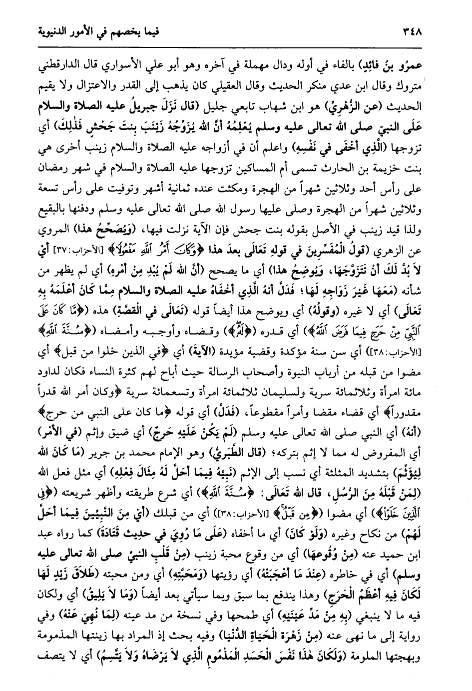عمرو بن فائد) بالفاء في أوله ودال مهملة في آخره وهو أبو علي الأسواري قال الدارقطني متروك وقال ابن عدي منكر الحديث وقال العقيلي كان يذهب إلى القدر والاعتزال ولا يقيم الحديث (عن الزّهريّ) هو ابن شهاب تابعي جليل (قال نزل جبريل عليه الصلاة والسلام على النبيّ صلى الله تعالى عَلَيْهِ وَسَلَّمَ يُعْلِمُهُ أَنَّ اللَّهَ يُزَوِّجُهُ زَيْنَبَ بنت جحش فذلك) أي تزوجها (الّذي أخفى في نفسه) واعلم أن في أزواجه عليه الصلاة والسلام زينب أخرى هي بنت خزيمة بن الحارث تسمى أم المساكين تزوجها عليه الصلاة والسلام في شهر رمضان على رأس أحد وثلاثين شهرا من الهجرة ومكثت عنده ثمانية أشهر وتوفيت على رأس تسعة وثلاثين شهرا من الهجرة وصلى عليها رسول الله صلى الله تعالى عليه وسلم ودفنها بالبقيع ولذا قيد زينب في الأصل بقوله بنت جحش فإن الآية نزلت فيها، (ويصحّح هذا) المروي عن الزهري (قَوْلُ الْمُفَسِّرِينَ فِي قَوْلِهِ تَعَالَى بَعْدَ هَذَا وَكانَ أَمْرُ اللَّهِ مَفْعُولًا [الْأَحْزَابِ: 37] أَيْ لَا بدّ لك أن تتزوّجها، ويوضح هذا) أي ما يصحح (أنّ الله لم يبد من أمره) أي لم يظهر من شأنه (مَعَهَا غَيْرَ زَوَاجِهِ لَهَا؛ فَدَلَّ أَنَّهُ الَّذِي أخفاه عليه الصلاة والسلام ممّا كان أعلمه به تعالى) أي لا غيره (وقوله) أي ويوضح هذا أيضا قوله (تعالى في القصّة) هذه (مَا كانَ عَلَى النَّبِيِّ مِنْ حَرَجٍ فِيما فَرَضَ اللَّهُ) أي قدره (اللَّهُ) وقضاه وأوجبه وأمضاه (سُنَّةَ اللَّهِ [الأحزاب: 38] ) أي سن سنة مؤكدة وقضية مؤيدة (الآية) أي فِي الَّذِينَ خَلَوْا مِنْ قَبْلُ أي مضوا من قبله من أرباب النبوة وأصحاب الرسالة حيث أباح لهم كثرة النساء فكان لداود مائة امرأة وثلاثمائة سرية ولسليمان ثلاثمائة امرأة وتسعمائة سرية وَكانَ أَمْرُ اللَّهِ قَدَراً مَقْدُوراً أي قضاء مقضا وأمرا مقطوعا، (فدلّ) أي قوله ما كانَ عَلَى النَّبِيِّ مِنْ حَرَجٍ (أنه) أي النبي صلى الله تعالى عليه وسلم (لم يكن عليه حرج) أي ضيق وإثم (في الأمر) أي المفروض له مما لا إثم بتركه؛ (قال الطّبريّ) وهو الإمام محمد بن جرير (ما كان الله ليؤثّم) بتشديد المثلثة أي نسب إلى الإثم (نبيّه فيما أحلّ له مثال فعله) أي مثل فعل الله (لِمَنْ قَبْلَهُ مِنَ الرُّسُلِ، قَالَ اللَّهُ تَعَالَى: سُنَّةَ اللَّهِ) أي شرع طريقته وأظهر شريعته (فِي الَّذِينَ خَلَوْا) أي مضوا (مِنْ قَبْلُ [الأحزاب: 38] ) أي من قبلك (أي من النّبيّين فيما أحلّ لهم) من نكاح وغيره (ولو كان) أي ما أخفاه (على ما روي في حديث قتادة) كما رواه عبد ابن حميد عنه (من وقوعها) أي من وقوع محبة زينب (من قلب النبيّ صلى الله تعالى عليه وسلم) أي في خاطره (عند ما أعجبته) أي رؤيتها (ومحبّته) أي ومن محبته (طَلَاقَ زَيْدٍ لَهَا لَكَانَ فِيهِ أَعْظَمُ الْحَرَجِ) وهذا يندفع بما سبق وبما سيأتي بعد أيضا (وما لا يليق) أي ولكان فيه ما لا ينبغي (به من مدّ عينيه) أي طمحها وفي نسخة من مد عينه (لما نهي عنه) وفي رواية إلى ما نهى عنه (من زهرة الحياة الدّنيا) وفيه بحث إذ المراد بها زينتها المذمومة وبهجتها الملومة (وَلَكَانَ هَذَا نَفْسَ الْحَسَدِ الْمَذْمُومِ الَّذِي لَا يرضاه ولا يتّسم) أي لا يتصف